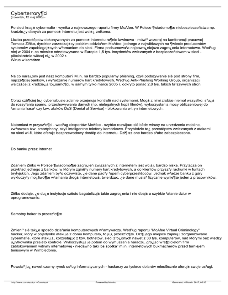 Cyberterrory¶ci (czwartek, 12 maj 2005) - Po sieci kra¿± cybermafie - wynika z najnowszego raportu firmy McAfee. W Polsce ¶wiadomo¶æ niebezpieczeñstwa np. kradzie¿y danych za pomoc± internetu jest wci±¿ znikoma. Liczba przestêpstw dokonywanych za pomoc± internetu ro¶nie lawinowo - mówi³ wczoraj na konferencji prasowej Tomasz Ziñko, dyrektor zarz±dzaj±cy polskim oddzia³em McAfee, jednego z najwiêkszych na ¶wiecie producentów systemów zapobiegaj±cych w³amaniom do sieci. Firma podsumowa³a najpowa¿niejsze zagro¿enia internetowe. Wed³ug niej w 2004 r. co miesi±c odnotowywano w Europie 1,5 tys. incydentów zwi±zanych z bezpieczeñstwem w sieci piêciokrotnie wiêcej ni¿ w 2002 r. Wirus w komórce Na co nara¿ony jest nasz komputer? M.in. na bardzo popularny phishing, czyli podszywanie siê pod strony firm, najczê¶ciej banków, i wy³udzanie numerów kart kredytowych. Wed³ug Anti-Phishing Working Group, organizacji walcz±cej z kradzie¿± to¿samo¶ci, w samym tylko marcu 2005 r. odkryto ponad 2,8 tys. takich fa³szywych stron. Coraz czê¶ciej te¿ cyberrabusie zdalnie przejmuj± kontrolê nad systemami. Mog± z nimi zrobiæ niemal wszystko: s³u¿± do rozsy³ania spamu, przechowywania danych (np. nielegalnych kopii filmów), wykorzystania mocy obliczeniowej do ³amania hase³ czy tzw. ataków DoS (Denial of Service) - blokowania witryn internetowych. Natomiast w przysz³o¶ci - wed³ug ekspertów McAfee - szybko rozwijaæ siê bêd± wirusy na urz±dzenia mobilne, zw³aszcza tzw. smartphony, czyli inteligentne telefony komórkowe. Przybêdzie te¿ przestêpstw zwi±zanych z atakami na sieci wi-fi, które oferuj± bezprzewodowy dostêp do internetu. Dzi¶ s± one bardzo s³abo zabezpieczone. Do banku przez Internet Zdaniem Ziñko w Polsce ¶wiadomo¶æ zagro¿eñ zwi±zanych z internetem jest wci±¿ bardzo niska. Przytacza on przyk³ad jednego z banków, w którym zginê³y numery kart kredytowych, a do klientów przysz³y rachunki w funtach brytyjskich. Jego zdaniem by³o oczywiste, ¿e dane pad³y ³upem cyberprzestêpców. Jednak w³adze banku z góry wykluczy³y mo¿liwo¶æ w³amania drog± internetow±, twierdz±c, ¿e dane musia³ fizycznie wynie¶æ jeden z pracowników. Ziñko dodaje, ¿e du¿e instytucje czêsto bagatelizuj± takie zagro¿enia i nie dbaj± o szybkie ³atanie dziur w oprogramowaniu. Samotny haker to przesz³o¶æ Zmieni³ siê tak¿e sposób dzia³ania komputerowych w³amywaczy. Wed³ug raportu "McAfee Virtual Criminology" hacker, który w pojedynkê atakuje z domu komputery, to ju¿ przesz³o¶æ. Dzi¶ jego miejsce zajmuj± zorganizowane cybermafie, które atakuj±, korzystaj±c z tzw. botnetów, sieci z³o¿onych nawet z 30 tys. komputerów, nad którymi bez wiedzy u¿ytkownika przejêto kontrolê. Wykorzystuj± je potem do wymuszania haraczu, gro¿±c w³a¶cicielom firm zablokowaniem witryny internetowej - niedawno taki los spotka³ m.in. internetowych bukmacherów przed turniejem tenisowym w Wimbledonie. Powsta³ ju¿ nawet czarny rynek us³ug informatycznych - hackerzy za tysi±ce dolarów miesiêcznie oferuj± swoje us³ugi. http://www.comdepot.pl - Comdepot Powered by Mambo Generated: 4 March, 2017, 05:35 Coraz czê¶ciej te¿ wirtualne przestêpstwa pope³niaj±... dzieci. Staj± siê one narzêdziami w rêkach cybergangów, podobnie jak m³odociani dilerzy na us³ugach potê¿nych handlarzy narkotyków. ¼ród³o: Gazeta Wyborcza http://www.comdepot.pl - Comdepot Powered by Mambo Generated: 4 March, 2017, 05:35
