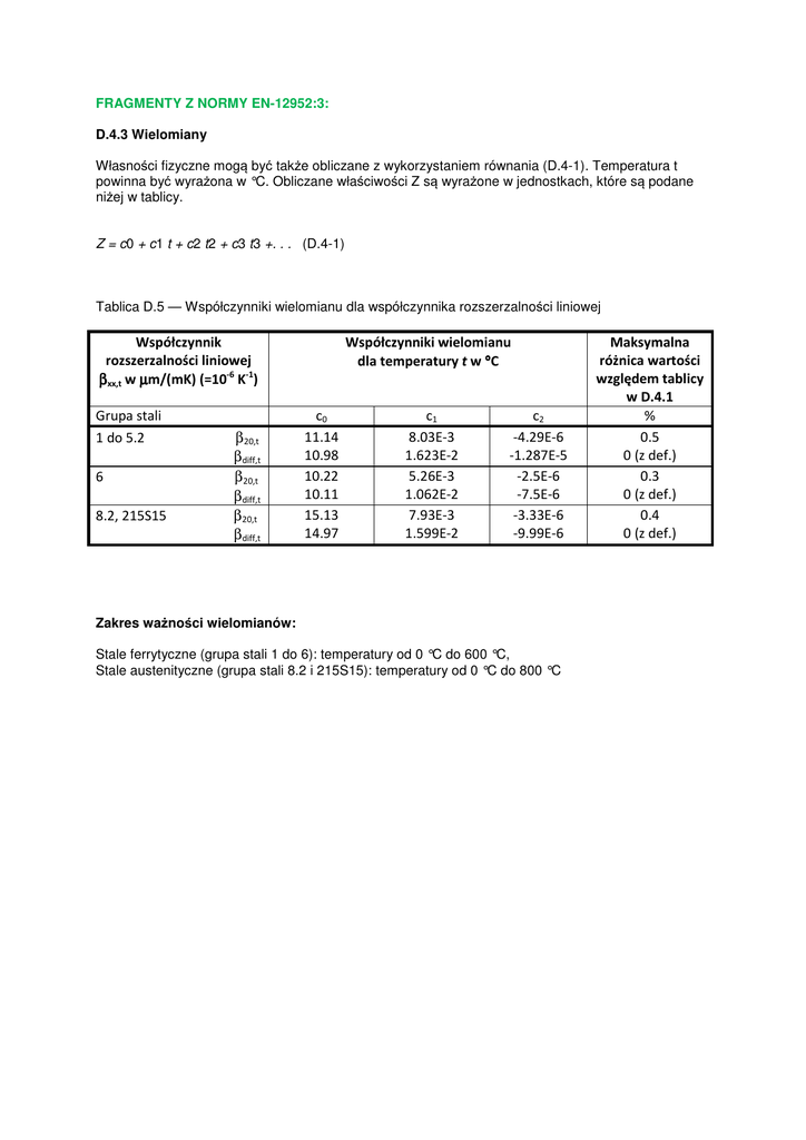 FRAGMENTY Z NORMY EN-12952:3: D.4.3 Wielomiany Własności fizyczne mogą być także obliczane z wykorzystaniem równania (D.4-1). Temperatura t powinna być wyrażona w °C. Obliczane właściwości Z są wyrażone w jednostkach, które są podane niżej w tablicy. Z = c0 + c1 t + c2 t2 + c3 t3 +. . . (D.4-1) Tablica D.5 — Współczynniki wielomianu dla współczynnika rozszerzalności liniowej Współczynnik rozszerzalności liniowej βxx,t w µm/(mK) (=10-6 K-1) Grupa stali 1 do 5.2 6 8.2, 215S15 β20,t βdiff,t β20,t βdiff,t β20,t βdiff,t Współczynniki wielomianu dla temperatury t w °C c0 11.14 10.98 10.22 10.11 15.13 14.97 c1 8.03E-3 1.623E-2 5.26E-3 1.062E-2 7.93E-3 1.599E-2 c2 -4.29E-6 -1.287E-5 -2.5E-6 -7.5E-6 -3.33E-6 -9.99E-6 Zakres ważności wielomianów: Stale ferrytyczne (grupa stali 1 do 6): temperatury od 0 °C do 600 °C, Stale austenityczne (grupa stali 8.2 i 215S15): temperatury od 0 °C do 800 °C Maksymalna różnica wartości względem tablicy w D.4.1 % 0.5 0 (z def.) 0.3 0 (z def.) 0.4 0 (z def.)