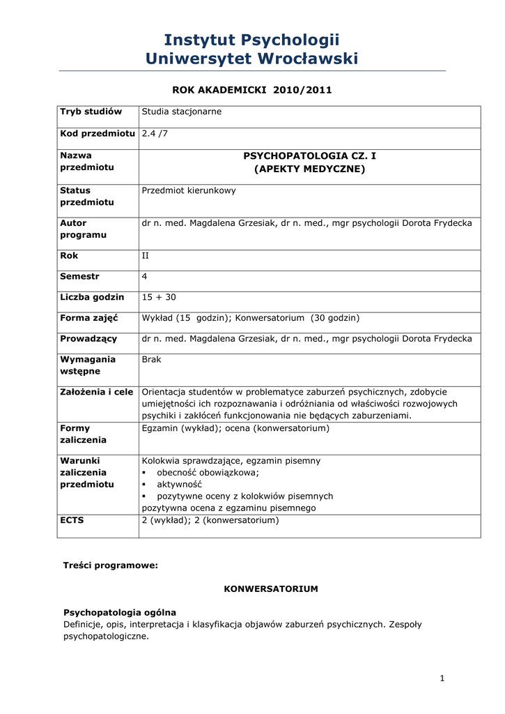 Instytut Psychologii Uniwersytet Wrocławski ROK AKADEMICKI 2010/2011 Tryb studiów Studia stacjonarne Kod przedmiotu 2.4 /7 PSYCHOPATOLOGIA CZ. I (APEKTY MEDYCZNE) Nazwa przedmiotu Status przedmiotu Przedmiot kierunkowy Autor programu dr n. med. Magdalena Grzesiak, dr n. med., mgr psychologii Dorota Frydecka Rok II Semestr 4 Liczba godzin 15 + 30 Forma zajęć Wykład (15 godzin); Konwersatorium (30 godzin) Prowadzący dr n. med. Magdalena Grzesiak, dr n. med., mgr psychologii Dorota Frydecka Wymagania wstępne Brak Założenia i cele Orientacja studentów w problematyce zaburzeń psychicznych, zdobycie umiejętności ich rozpoznawania i odróżniania od właściwości rozwojowych psychiki i zakłóceń funkcjonowania nie będących zaburzeniami. Egzamin (wykład); ocena (konwersatorium) Formy zaliczenia Warunki zaliczenia przedmiotu ECTS Kolokwia sprawdzające, egzamin pisemny obecność obowiązkowa; aktywność pozytywne oceny z kolokwiów pisemnych pozytywna ocena z egzaminu pisemnego 2 (wykład); 2 (konwersatorium) Treści programowe: KONWERSATORIUM Psychopatologia ogólna Definicje, opis, interpretacja i klasyfikacja objawów zaburzeń psychicznych. Zespoły psychopatologiczne. 1 Organiczne zaburzenia psychiczne Klasyfikacja organicznych zaburzeń psychicznych wg ICD-10. Otępienia: podział, przyczyny, epidemiologia, objawy kliniczne. Choroba Alzheimera a otępienie naczyniowe – diagnostyka różnicowa na podstawie wywiadu, obrazu klinicznego, badań testowych i neuroobrazowych. Otępienie a depresja – podobieństwa i różnice w badaniu psychiatrycznym. Leczenie zaburzeń psychicznych organicznych. Uzależnienia od substancji psychoaktywnych Definicje: uzależnienia, używania szkodliwego, ostrego zatrucia, zespołu abstynencyjnego, upojenia patologicznego. Epidemiologia uzależnień. Efekty działania substancji psychoaktywnych. Objawy abstynencyjne charakterystyczne dla poszczególnych substancji psychoaktywnych. Psychologiczne mechanizmy uzależnienia. Problematyka współuzależnienia. Leczenie uzależnień - rola psychoterapii i farmakoterapii. Grupy AA, ALANON. Schizofrenia i inne zaburzenia psychotyczne Etiopatogeneza. Epidemiologia. Objawy: osiowe, wytwórcze, pozytywne, pierwszorzędowe – różnice w definicjach. Diagnostyka schizofrenii (paranoidalna, hebefreniczna, katatoniczna, prosta, rezydualna) – różnice w obrazie klinicznym. Ostre wielopostaciowe zaburzenia psychotyczne – obraz kliniczny, kryterium czasu, podział. Utrwalone zaburzenia psychotyczne. Miejsce paranoi i parafrenii w klasyfikacji ICD-10- obraz kliniczny, kryterium czasu. Zaburzenia schizoafektywne. Leczenie schizofrenii i innych zaburzeń psychotycznych. Zaburzenia afektywne Klasyfikacja zaburzeń afektywnych wg ICD-10. Etiologia i epidemiologia zaburzenia afektywnego dwubiegunowego i depresyjnego nawracającego. Obraz kliniczny zaburzeń afektywnych. Diagnostyka zaburzeń afektywnych na podstawie wywiadu i obrazu klinicznego. Różnice w terapii zaburzeń afektywnych dwubiegunowych i depresyjnych nawracających (leczenie zaostrzeń, profilaktyka). Rola psychoterapii w leczeniu zaburzeń afektywnych. Dystymia i cyklotymia – definicje, obraz kliniczny, leczenie. Zaburzenia nerwicowe. Klasyfikacja zaburzeń nerwicowych wg ICD-10. Teorie etiologiczne, epidemiologia, obraz kliniczny: zaburzenia lękowe: agorafobia, fobie specyficzne, fobia społeczna, zaburzenie lękowe z napadami paniki, zaburzenie lękowe uogólnione zaburzenie obsesyjno-kompulsyjne zaburzenie stresowe pourazowe i ostra reakcja na stres zaburzenie dysocjacyjne zaburzenia somatyzycyjne Diagnostyka różnicowa zaburzenia adaptacyjnego i zaburzeń depresyjnych na podstawie klasyfikacji ICD-10. Rola farmakoterapii i psychoterapii w leczeniu zaburzeń nerwicowych. Zaburzenia osobowości Definicje: osobowość, zaburzenie osobowości . Swoiste zaburzenia osobowości: ogólne kryteria rozpoznania wg ICD - 10 etiologia, diagnostyka, przebieg, leczenie swoiste zaburzenia osobowości a zaburzenia osobowości na podłożu organicznym psychopatia, charakteropatia, homilopatia, socjopatia obraz kliniczny poszczególnych postaci zaburzeń osobowości Trwałe zmiany osobowości. Kryteria rozpoznania. Różnicowanie ze swoistymi zaburzeniami osobowości i zaburzeniami osobowości na podłożu organicznym 2 Zespoły behawioralne związane z zaburzeniami fizjologicznymi i czynnikami fizycznymi Zaburzenia odżywiania się. Czynniki etiologiczne: genetyczne, biochemiczne, osobowościowe, środowiskowe (relacje rodzinne), społeczno- kulturowe. Jadłowstręt psychiczny (anorexia nervosa). Kryteria rozpoznania wg ICD 10, obraz kliniczny, różnicowanie. Etiologia, przebieg, rokowanie, leczenie, wybór miejsca leczenia. Bulimia (żarłoczność psychiczna). Kryteria rozpoznania wg ICD 10, obraz kliniczny. Etiologia, przebieg, rokowanie. Współwystępowanie z anoreksją i innymi zaburzeniami (depresja, uzależnienia) Przejadanie się psychogenne (otyłość psychogenna). Obraz kliniczny, różnicowanie z otyłością uwarunkowaną innymi przyczynami, leczenie Zaburzenia (dysfunkcje) seksualne Ogólna charakterystyka, podział wg ICD 10, obraz kliniczny. Czynniki etiologiczne (biologiczne, psychiczne, społeczno-kulturowe). Różnicowanie (choroby somatyczne, zaburzenia psychiczne, stosowane leki, środki psychoaktywne). Dysfunkcje seksualne w przebiegu zaburzeń psychicznych (depresja, mania, zaburzenia lękowe, uzależnienie). Leczenie. Zaburzenia identyfikacji płciowej Transseksualizm, transwestytyzm o typie podwójnej roli, zaburzenia identyfikacji płciowej w dzieciństwie. Zaburzenia preferencji seksualnych (parafilie) Fetyszyzm, transwestytyzm fetyszystyczny, ekshibicjonizm, oglądactwo, pedofilia, sadomasochizm, inne. Zaburzenia psychiczne dzieci i młodzieży Podział zaburzeń wg ICD 10. Trudności diagnostyczne, specyfika psychiatrii dziecięcej. Obraz kliniczny, etiologia, rozpoznanie, różnicowanie oraz leczenie następujących za