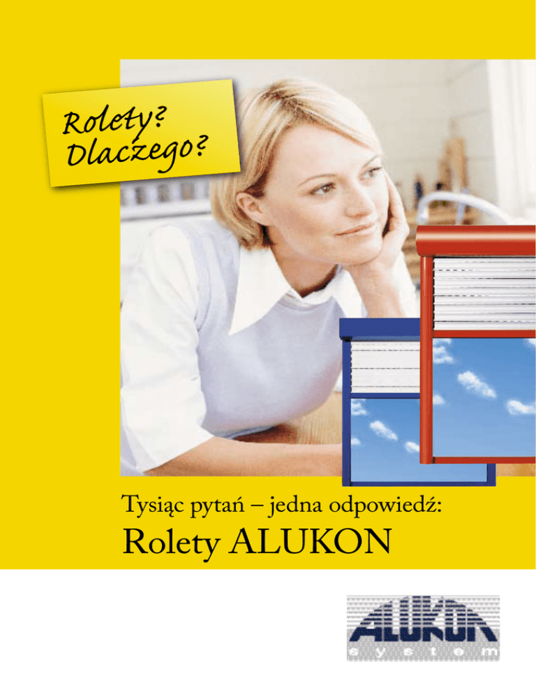 Rolety? ? Dlaczego Tysiąc pytań – jedna odpowiedź: Rolety ALUKON szą Jakie korzyści wno rolety względem innych systemów? Są rzeczy, które wasi sąsiedzi nie chcą widzieć. OCHRONA PRZED NIEPOŻĄDANYM WZROKIEM Zaciemnienie nie tylko w trakcie gorących słonecznych dni. Dla kojącego spokoju każde pomieszczenie o każdej porze można zasłonić. ENERGOOSZCZĘDNOŚĆ Poparcie dla izolacyjności termicznej poprzez montaż przed oknem. Dodatkowa izolacja termiczna poprzez poduszkę powietrzną oznacza oszczędność pod względem ogrzewania a także energii. ZABEZPIECZENIE PRZED WŁAMANIEM Źle zaizolowana skrzynka roletowa powoduje dużą utratę ciepła. Rolety Alukon są wbudowane przed okno i dzięki temu unikamy utraty ciepła. Odstrasza intruzów oraz przeciwdziała włamaniu. W przypadku deszczu, gradobicia lub burzy najszybsza możliwość zamontowania ochrony dla okna. OCHRONA PRZED HAŁASEM Efekt podwójnej ścianki zmniejsza uciążliwość hałasu. Złośliwy hałas z zewnątrz zostanie na dworze. Skuteczna ochrona przed zgiełkiem i wrzawą. Żaden inny element budowlany w sumie nie daje tak wiele korzyści jak roleta. W czym jest lep zewnętrzna sza roleta Alukon od r olety naokiennej (nasadkowe j)? ŚWIATŁO WIĘKSZA POWIERZCHNIA SZYBY-WIĘCEJ ŚWIATŁA Poprzez montaż przed oknem nie jest zmniejszona wysokość okna. To tworzy miejsce dla wpadającego światła. czyni szczęśliwym światła światła Przy zamontowaniu rolety zewnętrznej nie ma konieczności dokonywania żadnych prac związanych z obróbką tynkarską. padanie WSZYSTKO Z JEDNEJ RĘKI istniejący otwór w murze Skrzynki bez specjalnych zabiegów można zamontować przed uprzednio zamontowanym oknem. wynikająca wysokość okna padanie SKRZYNKI ROLET ZEWNĘTRZNYCH MOŻNA DOMONTOWAĆ stracona powierzchnia wynikająca wysokość okna KREATYWNA FORMA FASADY Rozległe formy oraz warianty dotyczące kolorów ustanawiają akcent i nie pozostawiają żadnych otwartych możliwości pod względem życzeń co do planowania. Rolety zewnętrzne ALUKON Gruntownie napewno: ALUMINIUM STABILNOŚĆ Aluminium jest stabilniejsze i bardziej możliwe do zastosowania w przypadku obciążenia jak inne materiały – przez to jest długowieczne i nie wymagające konserwacji. Pewna inwestycja na wiele lat. EKOLOGIA Odstraszanie to najlepsze zabezpieczenie przed włamaniem. FCKW-wolne wypiankowanie, najnowszy swobodny postęp pod względem farb wolny lakier proszkowy gwarantuje przyjazną dla środowiska produkcję. OSZCZĘDNOŚĆ Aluminium charakteryzuje się odpornością na korozję a tym samym na wpływ czynników atmosferycznych. Światłotrwałe farby także po latach powodują radość. Inne rozwiązania pod względem skrzynek inna w o p a et l ro Dlaczego a z an b yć wykon m? u i n i m u l a Możliwość uzyskania każdej odmiany koloru. Wybierają Państwo z obszernego programu pod względem kolorów. Do wyboru pozostaje Państwu nasza paleta kolorów standardowych, chyba że zdecydują się Państwo na kolor z palety RAL. Komfort i bezpieczeństwo KOMFORT OBSŁUGIWANIA BEZ GRANIC Od seryjnego korzystania ze zwijacza paska lub sznurka, poprzez komfortową obsługę na korbę lub sterowanie napędem elektrycznym i radiowym, dla komfortu obsługi rolet mnożą się możliwości. PROGRAMOWALNE BEZPIECZEŃSTWO Państwo decydują, kiedy roleta otwiera się lub zamyka. Podczas słońca, w godzinach wieczornych, kiedy są Państwo na urlopie lub nikogo nie ma w domu. Czy to sterownik czasowy lub sterownik pory dnia, dla pojedyńczego okna lub grupy okien, programowalne sterowania są bezpieczną korzyścią. OPCJONALNIE OCHRONA PRZED OWADAMI Kiedy chcieliby Państwo przy otwartym oknie rozkoszować się świeżym powietrzem, proponujemy to idealne rozwiązanie. Ponieważ element zintegrowany ochrony przed owadami firmy Alukon trzyma z dala to uciążliwe utrapienie. Państwo decydują kiedy następuje użycie tego elementu, ponieważ jest on możliwy w każdej chwili do zastosowania przy rolecie. Stand 05/06 PL / Design: www.gdl-marketing.de Doradztwo, planowanie, sprzedaż i montaż. Wszystko z jednej ręki. ALUKON GmbH & Co. KG · Münchberger Str. 31 · D-95176 Konradsreuth · Telefon 0 92 92 / 950-0 · Fax 0 92 92 / 950-293 · Internet www.alukon.com · E-Mail [email protected]