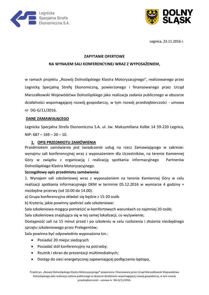 Legnica, 23.11.2016 r. ZAPYTANIE OFERTOWE NA WYNAJEM SALI KONFERENCYJNEJ WRAZ Z WYPOSAŻENIEM, w ramach projektu „Rozwój Dolnośląskiego Klastra Motoryzacyjnego”, realizowanego przez Legnicką Specjalną Strefę Ekonomiczną, powierzonego i finansowanego przez Urząd Marszałkowski Województwa Dolnośląskiego jako realizacja zadania publicznego w obszarze działalności wspomagającej rozwój gospodarczy, w tym rozwój przedsiębiorczości - umowa nr DG-G/11/2016. DANE ZAMAWIAJĄCEGO Legnicka Specjalna Strefa Ekonomiczna S.A. ul. św. Maksymiliana Kolbe 14 59-220 Legnica, NIP: 687 – 169 – 20 – 10. 1. OPIS PRZEDMIOTU ZAMÓWIENIA Przedmiotem zamówienia jest świadczenie usług na rzecz Zamawiającego w zakresie: wynajmu sali konferencyjnej wraz z wyposażeniem dla Uczestników, na terenie Kamiennej Góry w związku z organizacją i realizacją spotkania informacyjnego Partnerów Dolnośląskiego Klastra Motoryzacyjnego. Szczegółowy opis przedmiotu zamówienia: 1. Wynajem sali szkoleniowej wraz z wyposażeniem na terenie Kamiennej Góry w celu realizacji spotkania informacyjnego DKM w terminie 05.12.2016 w wymiarze 4 godziny + niezbędne przerwy (od 10.00 do 14.00). a) Grupa konferencyjna składać się będzie z 15-20 osób b) Kryteria, jakie powinny spełniać sale szkoleniowe: Sala szkoleniowa mogąca pomieścić w komfortowych warunkach co najmniej 20 osób; Sala szkoleniowa znajdująca się w tej samej lokalizacji, co wyżywienie; Dostępność sali na 15 minut przed i po szkoleniu w celu rozłożenia i złożenia niezbędnego sprzętu szkoleniowego przez Prelegentów; Sala powinna być odpowiednio wyposażona tzn.: Posiadać 20 miejsc siedzących Posiadać stół konferencyjny na potrzeby; Rzutnik i ekran do prezentacji multimedialnych; Dostęp do sieci energetycznej zapewniającej podłączenia laptopa, Projekt pn. „Rozwój Dolnośląskiego Klastra Motoryzacyjnego” powierzony i finansowany przez Urząd Marszałkowski Województwa Dolnośląskiego jako realizacja zadania publicznego w obszarze działalności wspomagającej rozwój gospodarczy, w tym rozwój przedsiębiorczości - umowa nr DG-G/11/2016. Dostęp do Internetu; Stolik na sprzęt multimedialny, przedłużacz, itp. Sala autonomiczna; Inne kryteria: Bezpłatne miejsca parkingowe dla uczestników, wykładowcy i obsługi szkolenia. Zapewnienie sali zastępczej o nie niższym standardzie niż wymieniony w przedmiocie zamówienia – w przypadku niemożliwości korzystania z wybranej sali szkoleniowej z przyczyn losowych; 2. MIEJSCE ORAZ TERMIN DOSTARCZANIA OFERT 1. Ofertę należy przesłać w terminie do dnia 25.12.2016 r., do godz. 12.00 do na adres mailowy: [email protected] lub do siedziby przy ul. św. Maksymiliana Kolbe 14, 59-220 Legnica z dopiskiem: „Oferta na wynajem sali konferencyjnej”. 2. Wykonawca może, przed upływem terminu przesyłania ofert, zmienić lub wycofać ofertę. 3. W toku badania i oceny ofert Zamawiający może zażądać od Wykonawców wyjaśnień dotyczących treści złożonych ofert. 3. OCENA OFERT Kryterium oceny ofert: 1. Cena – 100% Zamawiający udzieli zamówienia Wykonawcy, który zaoferował najlepszą ofertę . W przypadku nie wybrania Wykonawcy (np. brak ofert, odrzucenie ofert) Zamawiający dopuszcza możliwość ponownego rozpoczęcia procedury zapytania ofertowego. 4. INFORMACJE DOTYCZĄCE WYBORU OFERTY 1. O wyborze najkorzystniejszej oferty Zamawiający zawiadomi niezwłocznie zainteresowane strony. 2. Zamawiającemu przysługuje prawo zamknięcia trybu niniejszego zapytania bez wybrania którejkolwiek z ofert. 5. PRZESŁANKI ODRZUCENIA OFERTY. Zamawiający odrzuci ofertę, jeżeli: 1. Jej treść nie będzie odpowiadać treści zapytania ofertowego; 2. Zostanie złożona po terminie składania ofert; 3. Będzie nieważna na podstawie odrębnych przepisów; 6. UNIEWAŻNIENIE POSTĘPOWANIA. 1. Zamawiający zastrzega sobie prawo do unieważnienia powyższego postępowania bez konieczności podania przyczyny unieważnienia. 2. Zamawiający unieważni postępowanie, gdy postępowanie obarczone jest wadą uniemożliwiającą zawarcie ważnej umowy lub gdy nastąpi rozwiązanie umowy pomiędzy LSSE S.A. a Urzędem Marszałkowskim Województwa Dolnośląskiego. Projekt pn. „Rozwój Dolnośląskiego Klastra Motoryzacyjnego” powierzony i finansowany przez Urząd Marszałkowski Województwa Dolnośląskiego jako realizacja zadania publicznego w obszarze działalności wspomagającej rozwój gospodarczy, w tym rozwój przedsiębiorczości - umowa nr DG-G/11/2016.