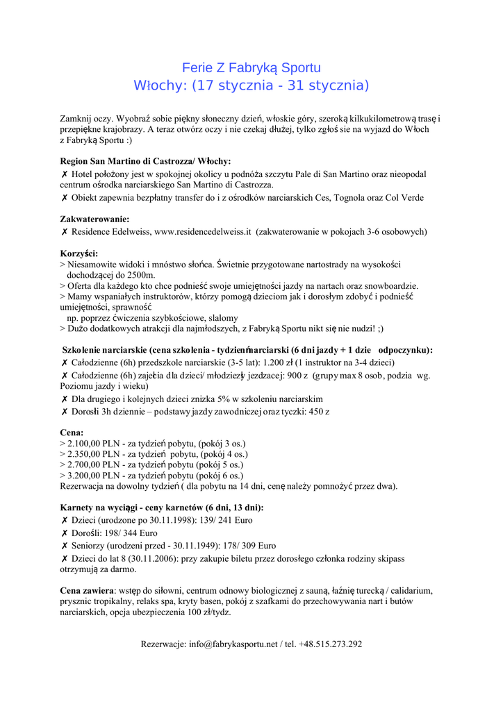 Ferie Z Fabryką Sportu Włochy: (17 stycznia - 31 stycznia) Zamknij oczy. Wyobraź sobie piękny słoneczny dzień, włoskie góry, szeroką kilkukilometrową trasę i przepiękne krajobrazy. A teraz otwórz oczy i nie czekaj d łużej, tylko zg ło ś sie na wyjazd do W łoch z Fabryką Sportu :) Region San Martino di Castrozza/ Włochy: ✗ Hotel położony jest w spokojnej okolicy u podnóża szczytu Pale di San Martino oraz nieopodal centrum ośrodka narciarskiego San Martino di Castrozza. ✗ Obiekt zapewnia bezpłatny transfer do i z ośrodków narciarskich Ces, Tognola oraz Col Verde Zakwaterowanie: ✗ Residence Edelweiss, www.residencedelweiss.it (zakwaterowanie w pokojach 3-6 osobowych) Korzyści: > Niesamowite widoki i mnóstwo słońca. Świetnie przygotowane nartostrady na wysokości dochodzącej do 2500m. > Oferta dla każdego kto chce podnieść swoje umiejętności jazdy na nartach oraz snowboardzie. > Mamy wspaniałych instruktorów, którzy pomogą dzieciom jak i dorosłym zdobyć i podnieść umiejętności, sprawność np. poprzez ćwiczenia szybkościowe, slalomy > Dużo dodatkowych atrakcji dla najmłodszych, z Fabryką Sportu nikt się nie nudzi! ;) Szkolenie narciarskie (cena szkolenia - tydzien ńnarciarski (6 dni jazdy + 1 dzie odpoczynku): ✗ Całodzienne (6h) przedszkole narciarskie (3-5 lat): 1.200 z ł (1 instruktor na 3-4 dzieci) ✗ Całodzienne (6h) zajecia ł dla dzieci/ młodziezył jezdzacej: 900 z (grupy max 8 osob, podzia wg. Poziomu jazdy i wieku) ✗ Dla drugiego i kolejnych dzieci znizka 5% w szkoleniu narciarskim ✗ Dorosli ł 3h dziennie – podstawy jazdy zawodniczej oraz tyczki: 450 z Cena: > 2.100,00 PLN - za tydzień pobytu, (pokój 3 os.) > 2.350,00 PLN - za tydzień pobytu, (pokój 4 os.) > 2.700,00 PLN - za tydzień pobytu (pokój 5 os.) > 3.200,00 PLN - za tydzień pobytu (pokój 6 os.) Rezerwacja na dowolny tydzień ( dla pobytu na 14 dni, cenę należy pomnożyć przez dwa). Karnety na wyciągi - ceny karnetów (6 dni, 13 dni): ✗ Dzieci (urodzone po 30.11.1998): 139/ 241 Euro ✗ Dorośli: 198/ 344 Euro ✗ Seniorzy (urodzeni przed - 30.11.1949): 178/ 309 Euro ✗ Dzieci do lat 8 (30.11.2006): przy zakupie biletu przez doros łego cz łonka rodziny skipass otrzymują za darmo. Cena zawiera: wstęp do siłowni, centrum odnowy biologicznej z sauną, łaźnię turecką / calidarium, prysznic tropikalny, relaks spa, kryty basen, pokój z szafkami do przechowywania nart i butów narciarskich, opcja ubezpieczenia 100 zł/tydz. Rezerwacje: [email protected] / tel. +48.515.273.292