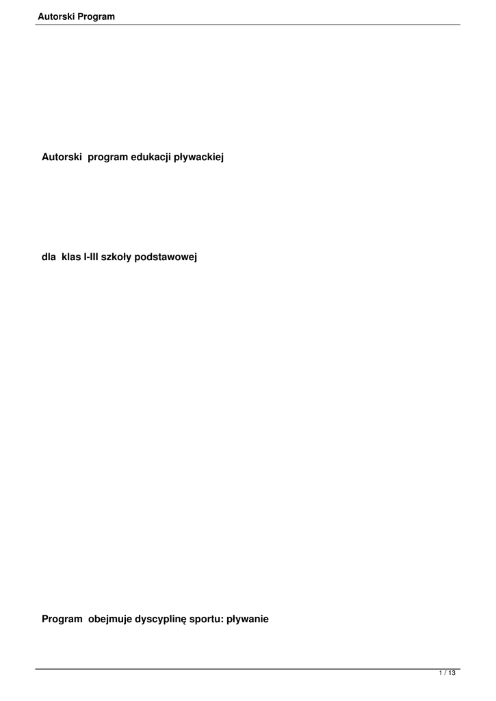 Autorski Program Autorski program edukacji pływackiej dla klas I-III szkoły podstawowej Program obejmuje dyscyplinę sportu: pływanie 1 / 13 Autorski Program Opracowała: mgr Żaneta Adamczyk nauczyciel wychowania fizycznego w Zespole Szkół Ogólnokształcących nr 7 2 / 13 Autorski Program w Katowicach ,, Trzeba zapewnić ciału dostatek światła i powietrza: rzeczą istotną jest pokierować metodycznie jego rozwojem. Aby osiągnąć jak najpełniejszy rozwój, konieczne jest wydobycie z ciała wszystkich jego sił witalnych. 3 / 13 Autorski Program Na tym polega obowiązek nauczyciela…” Isadory Duncan Celowość opracowania autorskiego programu edukacji pływackiej w klasach I-III szkoły podstawowej 4 / 13 Autorski Program Edukacja pływacka w szkole, w której pracuję, rozpoczyna się w czwartej klasie szkoły podstawowej i kończy na trzeciej klasie gimnazjum. Prowadząc lekcje pływania na poszczególnych etapach nauczania, można zaobserwować u uczniów bardzo duże postępy, które mają swoje odzwierciedlenie w wyniku sportowym na szczeblu miasta i województwa. Wśród uczniów zwiększył się też poziom zdolności motorycznych, który ma swoje ujście w harmonijnym rozwoju młodzieży, ogólnym stanie zdrowia. Rosnący poziom wyników w pływaniu, sprzyja większemu zapotrzebowaniu na tę dyscyplinę, popularyzacji sportu pływackiego, dlatego też Dyrekcja szkoły, nauczyciele wychowania fizycznego łącznie z moją osobą, pragniemy wyjść naprzeciw oczekiwaniom i zapoczątkować pływanie już w pierwszej klasie szkoły podstawowej, co pozwoli utworzyć solidny fundament do realizacji treningu pływackiego w starszych klasach. Możliwość wyboru rozpoczęcia edukacji pływackiej już w pierwszej klasie szkoły podstawowej, stwarza wszechstronne wykorzystanie zdrowotno-higienicznych walorów wychowania fizycznego, wprowadza w świat wzorów wartości i wzorów zachowań, gdzie świat człowieka to świat kultury, celem którego jest przygotowanie do uczestnictwa w kulturze i pomnażanie jej dorobku. Program jest stworzony dla wyselekcjonowanej grupy dzieci, które są oswojone z wodą, posiadają podstawowe umiejętności pływackie, gdzie budżet godzin dla klasy pierwszej o rozszerzonej edukacji pływackiej opracowano w oparciu o dwie godziny obowiązkowych zajęć tygodniowo na pływalni. Zajęcia będą prowadzone przez nauczycieli wychowania fizycznego z uprawnieniami instruktorskimi. 5 / 13 Autorski Program Założenia dydaktyczne i wychowawcze -zdrowy i wszechstronny rozwój fizyczny dzieci -kształtowanie pozytywnych cech charakteru i osobowości -kształtowanie wytrwałości oraz współpracy w grupie -rozwijanie potrzeby usprawniania się i samodoskonalenia -rozwijanie zdolności motorycznych -kształtowanie świadomej dyscypliny -kształtowanie nawyków zdrowotno-higienicznych 6 / 13 Autorski Program -popularyzowanie sportu pływackiego i aktywnych form wypoczynku -zaspokojenie potrzeb psychomotorycznych Cele kształcenia i wychowania 7 / 13 Autorski Program -harmonijny rozwój organizmu -kształtowanie aktywności ruchowej niezbędnej w różnych przejawach działalności człowieka -rozwój psychiki ( uwzględniając właściwą korelację między rozwojem fizycznym, umysłowym i emocjonalnym ) -kształtowanie charakteru i pożądanych postaw w działaniu zarówno indywidualnym jak i zespołowym -wyposażanie uczniów w niezbędny zasób wiedzy o kulturze fizycznej -osiągniecie poziomu wiedzy i umiejętności umożliwiających dbanie o zdrowie i higienę własnego ciała -wszechstronny rozwój sprawności kondycyjno-koordynacyjnej -rozwijanie poczucia odpowiedzialności za zdrowie własne i innych 8 / 13 Autorski Program -wszechstronne przygotowanie ucznia do pływania sportowymi technikami pływania Cel zadania oraz rodzaj działań przy realizacji zadania 9 / 13 Autorski Program -popularyzacja sportu pływackiego -popularyzowanie aktywnych form wypoczynku wśród dzieci -upowszechnianie sportowego, zdrowego stylu życia -wszechstronne przygotowanie fizyczne ucznia do opanowania i doskonalenia sportowych technik pływania -uwzględnianie zainteresowań dzieci -popularyzowanie zawodów pływackich, uwzględniając Szkolną Ligę Pływacką -współzawodnictwo sportowe -poznanie swoich możliwości wobec umiejętności innych uczniów -kształtowanie tolerancji względem innych kibiców, kultura i tolerancja wobec kolegów, dyscyplina, przepisy BHP 10 / 13 Autorski Program Szczegółowe cele edukacyjne, założone osiągnięcia i metody ich oceny, 11 / 13 Autorski Program procedury osiągania celów ( wskazówki metodyczne) oraz edukacja zdrowotna dla klas I-III szkoły podstawowej - Klasa I Klasa II Klasa III 12 / 13 Autorski Program 13 / 13