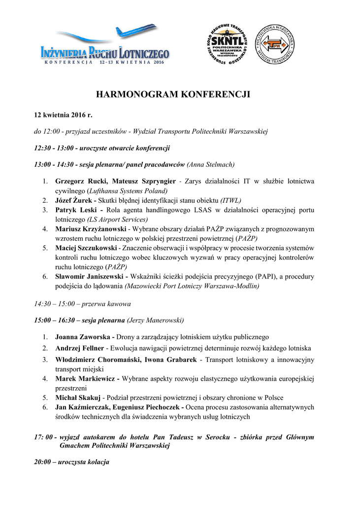 HARMONOGRAM KONFERENCJI 12 kwietnia 2016 r. do 12:00 - przyjazd uczestników - Wydział Transportu Politechniki Warszawskiej 12:30 - 13:00 - uroczyste otwarcie konferencji 13:00 - 14:30 - sesja plenarna/ panel pracodawców (Anna Stelmach) 1. 2. 3. 4. 5. 6. Grzegorz Rucki, Mateusz Szpryngier - Zarys działalności IT w służbie lotnictwa cywilnego (Lufthansa Systems Poland) Józef Żurek - Skutki błędnej identyfikacji stanu obiektu (ITWL) Patryk Leski - Rola agenta handlingowego LSAS w działalności operacyjnej portu lotniczego (LS Airport Services) Mariusz Krzyżanowski - Wybrane obszary działań PAŻP związanych z prognozowanym wzrostem ruchu lotniczego w polskiej przestrzeni powietrznej (PAŻP) Maciej Szczukowski - Znaczenie obserwacji i współpracy w procesie tworzenia systemów kontroli ruchu lotniczego wobec kluczowych wyzwań w pracy operacyjnej kontrolerów ruchu lotniczego (PAŻP) Sławomir Janiszewski - Wskaźniki ścieżki podejścia precyzyjnego (PAPI), a procedury podejścia do lądowania (Mazowiecki Port Lotniczy Warszawa-Modlin) 14:30 – 15:00 – przerwa kawowa 15:00 – 16:30 – sesja plenarna (Jerzy Manerowski) 1. Joanna Zaworska - Drony a zarządzający lotniskiem użytku publicznego 2. Andrzej Fellner - Ewolucja nawigacji powietrznej determinuje rozwój każdego lotniska 3. Włodzimierz Choromański, Iwona Grabarek - Transport lotniskowy a innowacyjny transport miejski Marek Markiewicz - Wybrane aspekty rozwoju elastycznego użytkowania europejskiej przestrzeni Michał Skakuj - Podział przestrzeni powietrznej i obszary chronione w Polsce Jan Kaźmierczak, Eugeniusz Piechoczek - Ocena procesu zastosowania alternatywnych środków technicznych dla świadczenia wybranych usług lotniczych 4. 5. 6. 17: 00 - wyjazd autokarem do hotelu Pan Tadeusz w Serocku - zbiórka przed Głównym Gmachem Politechniki Warszawskiej 20:00 – uroczysta kolacja 13 kwietnia 2016 r. 7:00 – 9:00 – śniadanie 9:00 – 10:30 – sesja plakatowa (Anna Kwasiborska) 1. Krzysztof Banaszek, Michał Kozłowski Operacyjne aspekty koncepcji utworzenia duoportu dla aglomeracji warszawskiej 2. Jacek Bartosiewicz, Jerzy Manerowski, Anna Stelmach Identyfikacja modelu matematycznego opisującego tor lotu samolotu według procedury CDA z wykorzystaniem sieci neuronowych 3. Izabela Budzisz Nowe technologie w systemach nawigacji satelitarnej 4. Mateusz Cieślak, Jacek Skorupski Metoda szacowania czasu dotarcia pasażera do bramki odlotowej 5. Błażej Dikunow, Karolina Krzykowska, Mirosław Siergiejczyk Wykorzystanie systemów satelitarnych w radiolokacji lotniczej na przykładzie Polski północno-wschodniej 6. Ewa Dudek, Michał Kozłowski Koncepcja zastosowania metodyki DMAIC do zapewnienia jakości danych lotniczych 7. Jakub Dyrcz, Anton Pashkevich Analiza punktualności w regularnym transporcie lotniczym na przykładzie portu lotniczego Kraków-Balice 8. Radosław Fellner, Adrian Łach, Adam Mańka UAV elementem zarządzania bezpieczeństwem portu lotniczego 9. Agnieszka Gąsior Konkurencyjność transportu śródlądowego względem transportu drogowego na obszarze Dolnej Wisły na odcinku Gdańsk-Tczew 10. Agata Głączyńska, Iga Karolak Ocena możliwości wykorzystania jednostki ratowniczo-gaśniczej Ochotniczej Straży Pożarnej Dęblin-Masów w sytuacji wystąpienia wypadku lotniczego 11. Dariusz Górczyński, Sebastian Swat Zwiększenie możliwości operowania śmigłowców w terenie o obniżonej nośności 12. Paweł Janik, Sławomir Michalak, Sławomir Paszek ADS-B - przyszłość nawigacji. Nowe perspektywy rozwoju 13. Roksana Konstanty, Dariusz Ungiert Ocena czynników sukcesu przedsięwzięcia inwestycyjnego – port lotniczy 14. Edyta Kornacka Innowacyjne rozwiązania zbiorowych środków ratunkowych w transporcie morskim 15. Michał Kozłowski, Mateusz Rudnicki Koncepcja metody analizy ryzyka naziemnego 16. Ewelina Krakowiak, Małgorzata Żmigrodzka Bezpieczeństwo cywilnych operacji lotniczych bezzałogowych statków powietrznych 17. Anna Kruk, Michał Kozłowski Ochrona bagażu rejestrowanego z zastosowaniem metody HAZOP 18. Mariusz Krzyżanowski, Paulina Rutkowska Analiza ryzyka elementów systemu WAM dla przyjętego modelu funkcjonalnego 19. Mateusz Łukasik, Anna Stelmach Analiza wpływu warunków meteorologicznych na możliwość wykonania operacji lądowania 20. Jacek Skorupski, Robert Szymczak Analiza procedury przydzielania skrótów dolotowych w TMA Warszawa 21. Jacek Skorupski, Piotr Uchroński Skuteczność kontroli bezpieczeństwa osób przy użyciu WTMD w ujęciu praktycznym 22. Anna Stelmach, Anna Wiraszka Propozycja lokalizacji sieci lotnisk w Polsce dla Systemu Transportu Małymi Samolotami na przykładzie wybranego województwa 23. Tomasz Ustjanycz Konkurencyjność transportu intermodalnego versus transport samochodowy 10:30 – 11:00 – przerwa kawowa 11:00 – 13:00 – sesja plenarna (Jacek Skorupski) 1. 2. 3. 4. 5. 6. 7. Klaudia Adamowicz, Iwona Grabarek - Wybrane zagadnienia oceny obciążenia pracą kontrolera ruchu lotniczego Andrzej Fellner, Katarzyna Kostur-Balcerzak - Niezawodność bezzałogowej maszyny latającej w monitorowaniu infrastruktury krytycznej portu lotniczego Wojciech Kaleta - Podejście do lądowania typu LPV szansą na zredukowanie czynnika ryzyka kontrolowanego zderzenia z ziemią (CFIT) Krzysztof Blacha, Mariusz Wesołowski - Nawierzchnie lotniskowe jako element systemu bezpieczeństwa szkolenia lotniczego na obiektach lotniskowych Sił Zbrojnych RP Teresa Idzikowska - Normy jako narzędzie wspierające bezpieczeństwo bezzałogowych statków latających Jakub Marszałkiewicz - System Transportu Małymi Samolotami oraz perspektywy jego wykorzystania w Województwie Pomorskim Rafał Zajkowski - Wczoraj, dziś i jutro szkolenia kontrolerów ruchu lotniczego Podsumowanie i zakończenie konferencji 13:00 – 14:00 – obiad Po 14:00 – wyjazd uczestników