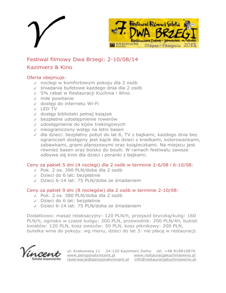 Festiwal filmowy Dwa Brzegi: 2-10/08/14 Kazimierz & Kino Oferta obejmuje: ✔ noclegi w komfortowym pokoju dla 2 osób ✔ śniadania bufetowe każdego dnia dla 2 osób ✔ 5% rabat w Restauracji Kuchnia i Wino ✔ miłe powitanie ✔ dostęp do internetu Wi-Fi ✔ LED TV ✔ dostęp biblioteki pełnej książek ✔ bezpłatne udostępnienie rowerów ✔ udostępnienie do kijów trekingowych ✔ nieograniczony wstęp na letni basen ✔ dla dzieci: bezpłatny pobyt do lat 6, TV z bajkami, każdego dnia bez ograniczeń dostępny jest kącik dla dzieci z kredkami, kolorowankami, zabawkami, grami planszowymi oraz książeczkami. Na miejscu jest również basen oraz boisko do boulli. W ramach festiwalu zawsze odbywa się kino dla dzieci i poranki z bajkami. Ceny za pakiet 5 dni (4 noclegi) dla 2 osób w terminie 2-6/08 i 6-10/08: ✔ Pok. 2 os. 390 PLN/doba dla 2 osób ✔ Dzieci do 6 lat: bezpłatnie ✔ Dzieci 6-14 lat: 75 PLN/doba ze śniadaniem Ceny za pakiet 9 dni (8 noclegów) dla 2 osób w terminie 2-10/08: ✔ Pok. 2 os. 380 PLN/doba dla 2 osób ✔ Dzieci do 6 lat: bezpłatnie ✔ Dzieci 6-14 lat: 75 PLN/doba ze śniadaniem Dodatkowo: masaż relaksacyjny: 120 PLN/h, przejazd bryczką/kulig: 160 PLN/h, ognisko w czasie kuligu: 200 PLN, przewodnik: 200 PLN/4h, bukiet kwiatów: 120 PLN, kosz owoców: 50 PLN, kosz piknikowy: 200 PLN, butelka wina do pokoju: wg menu, dzieci do lat 3: nie płacą w restauracji. ul. Krakowska 11 24-120 Kazimierz Dolny tel. +48 818810876 www.pensjonatvincent.pl www.restauracjakuchniaiwino.pl [email protected] [email protected]