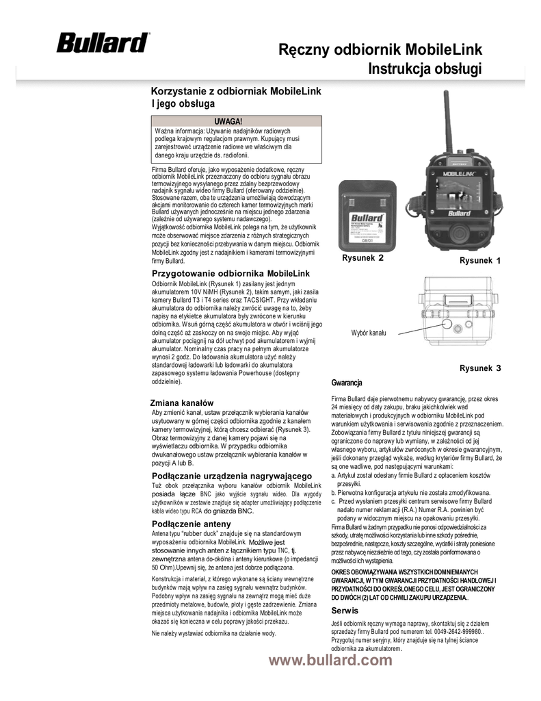R czny odbiornik MobileLink Instrukcja obsugi Korzystanie z odbiorniak MobileLink I jego obsuga UWAGA! W ana informacja: Uywanie nadajników radiowych podlega krajowym regulacjom prawnym. Kupujcy musi zarejestrowa urzdzenie radiowe we w aciwym dla danego kraju urzdzie ds. radiofonii. Firma Bullard oferuje, jako wyposaenie dodatkowe, rczny odbiornik MobileLink przeznaczony do odbioru sygna u obrazu termowizyjnego wysy anego przez zdalny bezprzewodowy nadajnik sygna u wideo firmy Bullard (oferowany oddzielnie). Stosowane razem, oba te urzdzenia umoliwiaj dowodzcym akcjami monitorowanie do czterech kamer termowizyjnych marki Bullard uywanych jednoczenie na miejscu jednego zdarzenia (zalenie od uywanego systemu nadawczego). Wyjtkowo odbiornika MobileLink polega na tym, e uytkownik moe obserwowa miejsce zdarzenia z rónych strategicznych pozycji bez koniecznoci przebywania w danym miejscu. Odbiornik MobileLink zgodny jest z nadajnikiem i kamerami termowizyjnymi firmy Bullard. Rysunek 2 Rysunek 1 Przygotowanie odbiornika MobileLink Odbiornik MobileLink (Rysunek 1) zasilany jest jednym akumulatorem 10V NiMH (Rysunek 2), takim samym, jaki zasila kamery Bullard T3 i T4 series oraz TACSIGHT. Przy wk adaniu akumulatora do odbiornika naley zwróci uwag na to, eby napisy na etykietce akumulatora by y zwrócone w kierunku odbiornika. Wsu górn cz akumulatora w otwór i wcinij jego doln cz a zaskoczy on na swoje miejsc. Aby wyj akumulator pocignij na dó uchwyt pod akumulatorem i wyjmij akumulator. Nominalny czas pracy na pe nym akumulatorze wynosi 2 godz. Do adowania akumulatora uy naley standardowej adowarki lub adowarki do akumulatora zapasowego systemu adowania Powerhouse (dostpny oddzielnie). Zmiana kanaów Aby zmieni kana , ustaw prze cznik wybierania kana ów usytuowany w górnej czci odbiornika zgodnie z kana em kamery termowizyjnej, któr chcesz odbiera (Rysunek 3). Obraz termowizyjny z danej kamery pojawi si na wywietlaczu odbiornika. W przypadku odbiornika dwukana owego ustaw prze cznik wybierania kana ów w pozycji A lub B. Podczanie urzdzenia nagrywajcego Tu obok prze cznika wyboru kana ów odbiornik MobileLink posiada cze BNC jako wyjcie sygna u wideo. Dla wygody uytkowników w zestawie znajduje si adapter umoliwiajcy pod czenie kabla wideo typu RCA do gniazda BNC. Podczenie anteny Antena typu “rubber duck” znajduje si na standardowym wyposaeniu odbiornika MobileLink. Moliwe jest stosowanie innych anten z cznikiem typu TNC, tj. zewntrzna antena do-okólna i anteny kierunkowe (o impedancji 50 Ohm).Upewnij si, e antena jest dobrze pod czona. Konstrukcja i materia , z którego wykonane s ciany wewntrzne budynków maj wp yw na zasig sygna u wewntrz budynków. Podobny wp yw na zasig sygna u na zewntrz mog mie due przedmioty metalowe, budowle, p oty i gste zadrzewienie. Zmiana miejsca uytkowania nadajnika i odbiornika MobileLink moe okaza si konieczna w celu poprawy jakoci przekazu. Nie naley wystawia odbiornika na dzia anie wody. Wybór kana u Rysunek 3 Gwarancja Firma Bullard daje pierwotnemu nabywcy gwarancj, przez okres 24 miesicy od daty zakupu, braku jakichkolwiek wad materia owych i produkcyjnych w odbiorniku MobileLink pod warunkiem uytkowania i serwisowania zgodnie z przeznaczeniem. Zobowizania firmy Bullard z tytu u niniejszej gwarancji s ograniczone do naprawy lub wymiany, w zalenoci od jej w asnego wyboru, artyku ów zwróconych w okresie gwarancyjnym, jeli dokonany przegld wykae, wed ug kryteriów firmy Bullard, e s one wadliwe, pod nastpujcymi warunkami: a. Artyku zosta odes any firmie Bullard z op aceniem kosztów przesy ki. b. Pierwotna konfiguracja artyku u nie zosta a zmodyfikowana. c. Przed wys aniem przesy ki centrum serwisowe firmy Bullard nada o numer reklamacji (R.A.) Numer R.A. powinien by podany w widocznym miejscu na opakowaniu przesy ki. Firma Bullard w adnym przypadku nie ponosi odpowiedzialnoci za szkody, utrat moliwoci korzystania lub inne szkody porednie, bezporednie, nastpcze, koszty szczególne, wydatki i straty poniesione przez nabywc niezalenie od tego, czy zosta a poinformowana o moliwoci ich wystpienia. OKRES OBOWIZYWANIA WSZYSTKICH DOMNIEMANYCH GWARANCJI, W TYM GWARANCJI PRZYDATNOCI HANDLOWEJ I PRZYDATNOCI DO OKRELONEGO CELU, JEST OGRANICZONY DO DWÓCH (2) LAT OD CHWILI ZAKUPU URZDZENIA.. Serwis Jeli odbiornik rczny wymaga naprawy, skontaktuj si z dzia em sprzeday firmy Bullard pod numerem tel. 0049-2642-999980.. Przygotuj numer seryjny, który znajduje si na tylnej ciance odbiornika za akumulatorem. www.bullard.com Specyfikacja odbiornika MobileLink Systemy sygna u telewizyjnego ...................................NTSC/PAL (zalenie od wyjcia wideo kamery) Wzgldna wilgotno......................................10% do 90% Wymagane zasilanie ......................................Akumulator T3 NiMH Zasilanie W ejcie............................................ Akumulator T3 NiMH Wymiary .................................................... 15.3 cm wysoko, 10.7 cm szeroko, 11.4 cm g boko (bez anteny i paska rcznego, ale z zainstalowanym akumulatorem) Z anten wysoko odbiornika jest wiksza o 8 cm Waga ........................................................ ....1.9 funta (30.4 uncji, 863 g) z paskiem I akumulatorem, 1.28 funta (20.5 uncji, 581 g) bez akumulatora Czstotliwo odbioru ....................................Zgodnie z przepisami prawnymi dot. urzdze radiofonicznych danego kraju europejskiego Wyjcie Wideo (BNC)................ ......................75-Ohm 1 Volt P-P Gwarancja.. ......................................................24 miesice E.D. Bullard Company owiadcza niniejszym, e niniejsza kamera termowizyjna spe nia podstawowe wymagania oraz inne stosowne postanowienia dyrektywy 1999/5/EC. Pe ny tekst deklaracji zgodnoci znajduje si poniej. Bullard 1898 Safety Way Cynthiana, KY 41031-9303 Toll free: 877-BULLARD (285-5273) Tel: 859-234-6616 Fax: 859-234-8987 www.bullard.com Bullard GmbH Lilienthalstrasse 12 53424 Remagen Germany phone: +49-2642 999980