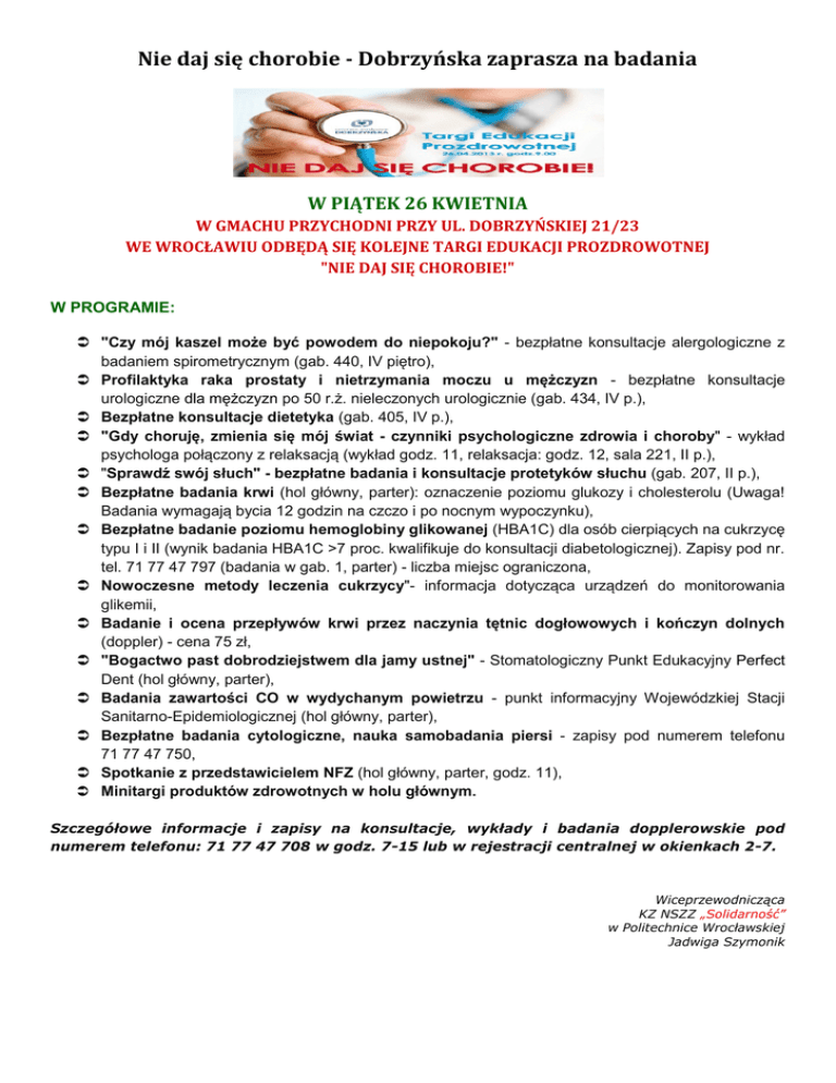 Nie daj się chorobie - Dobrzyńska zaprasza na badania W PIĄTEK 26 KWIETNIA W GMACHU PRZYCHODNI PRZY UL. DOBRZYŃSKIEJ 21/23 WE WROCŁAWIU ODBĘDĄ SIĘ KOLEJNE TARGI EDUKACJI PROZDROWOTNEJ "NIE DAJ SIĘ CHOROBIE!" W PROGRAMIE: "Czy mój kaszel może być powodem do niepokoju?" - bezpłatne konsultacje alergologiczne z badaniem spirometrycznym (gab. 440, IV piętro), Profilaktyka raka prostaty i nietrzymania moczu u mężczyzn - bezpłatne konsultacje urologiczne dla mężczyzn po 50 r.ż. nieleczonych urologicznie (gab. 434, IV p.), Bezpłatne konsultacje dietetyka (gab. 405, IV p.), "Gdy choruję, zmienia się mój świat - czynniki psychologiczne zdrowia i choroby" - wykład psychologa połączony z relaksacją (wykład godz. 11, relaksacja: godz. 12, sala 221, II p.), "Sprawdź swój słuch" - bezpłatne badania i konsultacje protetyków słuchu (gab. 207, II p.), Bezpłatne badania krwi (hol główny, parter): oznaczenie poziomu glukozy i cholesterolu (Uwaga! Badania wymagają bycia 12 godzin na czczo i po nocnym wypoczynku), Bezpłatne badanie poziomu hemoglobiny glikowanej (HBA1C) dla osób cierpiących na cukrzycę typu I i II (wynik badania HBA1C >7 proc. kwalifikuje do konsultacji diabetologicznej). Zapisy pod nr. tel. 71 77 47 797 (badania w gab. 1, parter) - liczba miejsc ograniczona, Nowoczesne metody leczenia cukrzycy"- informacja dotycząca urządzeń do monitorowania glikemii, Badanie i ocena przepływów krwi przez naczynia tętnic dogłowowych i kończyn dolnych (doppler) - cena 75 zł, "Bogactwo past dobrodziejstwem dla jamy ustnej" - Stomatologiczny Punkt Edukacyjny Perfect Dent (hol główny, parter), Badania zawartości CO w wydychanym powietrzu - punkt informacyjny Wojewódzkiej Stacji Sanitarno-Epidemiologicznej (hol główny, parter), Bezpłatne badania cytologiczne, nauka samobadania piersi - zapisy pod numerem telefonu 71 77 47 750, Spotkanie z przedstawicielem NFZ (hol główny, parter, godz. 11), Minitargi produktów zdrowotnych w holu głównym. Szczegółowe informacje i zapisy na konsultacje, wykłady i badania dopplerowskie pod numerem telefonu: 71 77 47 708 w godz. 7-15 lub w rejestracji centralnej w okienkach 2-7. Wiceprzewodnicząca KZ NSZZ „Solidarność” w Politechnice Wrocławskiej Jadwiga Szymonik