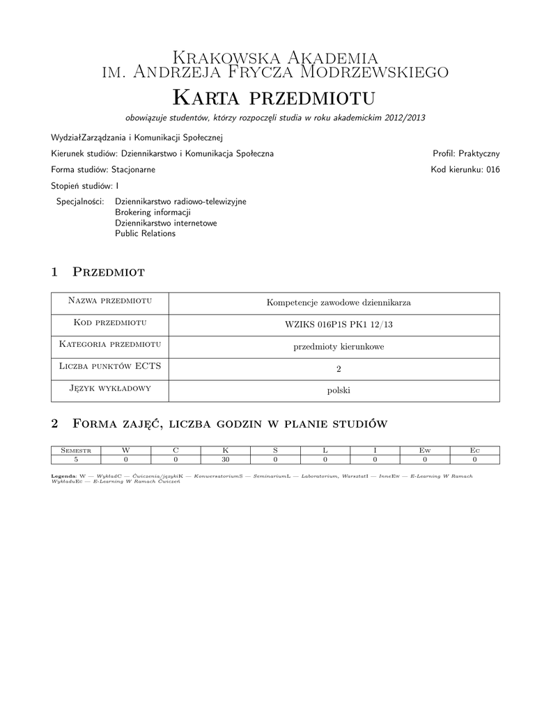 Krakowska Akademia im. Andrzeja Frycza Modrzewskiego Karta przedmiotu obowiązuje studentów, którzy rozpoczęli studia w roku akademickim 2012/2013 WydziałZarządzania i Komunikacji Społecznej Kierunek studiów: Dziennikarstwo i Komunikacja Społeczna Profil: Praktyczny Forma studiów: Stacjonarne Kod kierunku: 016 Stopień studiów: I Specjalności: 1 2 Dziennikarstwo radiowo-telewizyjne Brokering informacji Dziennikarstwo internetowe Public Relations Przedmiot Nazwa przedmiotu Kompetencje zawodowe dziennikarza Kod przedmiotu WZIKS 016P1S PK1 12/13 Kategoria przedmiotu przedmioty kierunkowe Liczba punktów ECTS 2 Język wykładowy polski Forma zajęć, liczba godzin w planie studiów Semestr 5 W 0 C 0 K 30 S 0 L 0 I 0 Ew 0 Ec 0 Legenda: W — WykładC — Ćwiczenia/językiK — KonwersatoriumS — SeminariumL — Laboratorium, Warsztat I — InneEw — E-Learning W Ramach WykładuEc — E-Learning W Ramach Ćwiczeń Krakowska Akademia im. Andrzeja Frycza Modrzewskiego 3 Cele przedmiotu Cel 1 Uświadomienie studentom kompetencji zawodowych dziennikarza. 4 Wymagania wstępne 1 Brak wymagań. 5 Modułowe efekty kształcenia MW1 Student zna kompetencje zawodowe dziennikarza. MU2 Na podstawie zdobytej wiedzy określi swoje kompetencje w roli dziennikarza i wybierze kierunek rozwoju zawodowego. MK3 Jest otwarty na wyzwania zawodowe i kontakty miedzyludzkie. 6 Treści programowe Lp K1 K2 K3 K4 K5 K6 K7 K8 K9 K10 Konwersatorium Tematyka zajęć Opis szczegółowy bloków tematycznych Dziennikarz jako człowiek dobrze wykształcony. Dziennikarz jako człowiek dobrze zorientowany w życiu społecznym i politycznym. Dziennikarz jako człowiek poszukujący. Dziennikarz jako lider zespołu realizacyjnego. Dziennikarz jako człowiek kierujący się zasadami etyki. Dziennikarz jako fachowiec sprawnie posługujący się różnymi technikami warsztatowymi. Dziennikarz jako człowiek świadomy konieczności samodoskonalenia. Dziennikarz jako pracownik umiejętnie budujący karierę zawodową. Dziennikarz jako kreator własnego wizerunku. Dziennikarz jako człowiek wykraczający poza ramy zawodu, podejmujący różne formy aktywności społecznej. Razem 7 Metody dydaktyczne M1. M5. M10. M16. Burza mózgów Dyskusja Prezentacje multimedialne Wykłady Strona 2/4 Liczba godzin 3 3 3 3 3 3 3 3 3 3 30 Krakowska Akademia im. Andrzeja Frycza Modrzewskiego 8 Obciążenie pracą studenta Średnia liczba godzin na zrealizowanie aktywności Forma aktywności Godziny kontaktowe z nauczycielem akademickim, w tym: Godziny wynikające z planu studiów 30 Konsultacje przedmiotowe 0 Egzaminy i zaliczenia w sesji 0 Godziny bez udziału nauczyciela akademickiego wynikające z nakładu pracy studenta, w tym: Przygotowanie się do zajęć, w tym studiowanie zalecanej literatury 10 Opracowanie wyników 0 Przygotowanie raportu, projektu, prezentacji, dyskusji 5 Zapoznanie się ze wskazanymi materiałami dziennikarskimi. 5 Sumaryczna liczba godzin dla przedmiotu wynikająca z 50 całego nakładu pracy studenta 2 Sumaryczna liczba punktów ECTS dla przedmiotu 9 Metody oceny Ocena podsumowująca P11. Aktywność na zajęciach P8. Zaliczenie pisemne Warunki zaliczenia przedmiotu 1 Pozytywna ocena z zaliczenia pisemnego i ocena aktywności podczas zajęć. Kryteria oceny Na ocenę 3 Na ocenę 3.5 Na ocenę 4 Na ocenę 4.5 Na ocenę 5 10 Udział w dyskusjach w czasie zajęć oraz zaliczenie pracy pisemnej na ocenę dostateczną. Aktywny udział w dyskusjach w czasie zajęć oraz zaliczenie pracy pisemnej na ocenę dostateczną. Bardzo aktywny udział w dyskusjach w czasie zajęć oraz zaliczenie pracy pisemnej na ocenę dobrą. Bardzo aktywny i twórczy udział w dyskusjach w czasie zajęć oraz zaliczenie pracy pisemnej na ocenę dobrą. Bardzo aktywny i twórczy udział w dyskusjach w czasie zajęć oraz zaliczenie pracy pisemnej na ocenę bardzo dobrą. Macierz realizacji przedmiotu Modułowe efekty kształcenia dla przedmiotu MW1 K_W10, K_W04 MU1 K_U06, K_U07 Odniesienie do efektów kierunkowych Treści programowe Metody dydaktyczne K1, K2, K3, K4, K5, K6, K7, K8, K9, K10 K1, K2, K3, K4, K5, K6, K7, K8, K9, K10 M1, M5, M10, M16 M1, M5, M10, M16 Strona 3/4 Sposoby oceny P11, P8 P11, P8 Krakowska Akademia im. Andrzeja Frycza Modrzewskiego Modułowe efekty kształcenia dla przedmiotu MK1 11 Odniesienie do efektów kierunkowych K_K04, K_K05, K_K02 Treści programowe Metody dydaktyczne Sposoby oceny K1, K2, K3, K4, K5, K6, K7, K8, K9, K10 M1, M5, M10, M16 P11, P8 Wykaz literatury Literatura podstawowa: [1] Ryszad Kapuściński — Autoportret reportera, Kraków, 2013, Społeczny Instytut Wydawniczy Znak [2] Andrzej Skworz, Andrzej Niziołek — Biblia dziennikarstwa, Kraków, 2010, Znak [3] Krzysztof Mroziewicz — Dziennikarz w globalnej wiosce, Warszawa, 2004, WSiP Literatura uzupełniająca: [1] Maciej Iłowiecki — Pilnowanie strażników. Etyka dziennikarska w praktyce, Warszawa, 2012, Fronda [2] Teresa Torańska — Ja, My, Oni, Warszawa, 2013, Agora SA 12 Informacje o nauczycielach akademickich Oboba odpowiedzialna za kartę mgr Piotr Matusiak (kontakt: [email protected]) Strona 4/4