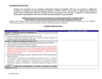 ZASTRZEŻENIE PRAWNE Niniejsza lista kontrolna nie jest oficjalnym dokumentem Komisji Europejskiej. Może być ona pomocnym, dodatkowym narzędziem w kontekście stosowania rozporządzenia Komisji nr 651/2014 z dnia 17 czerwca 2014 r. (ogólnego rozporządzenia w sprawie wyłączeń blokowych), jednak nie zastępuje ona tego rozporządzenia. Aby skorzystać z wyłączenia z wymogu zgłoszenia określonego w rozporządzeniu, konieczne jest zachowanie pełnej zgodności z jego przepisami. Ogólne rozporządzenie w sprawie wyłączeń blokowych (rozporządzenie 651/2014) - dokument roboczy Pomoc mająca na celu naprawienie szkód spowodowanych niektórymi klęskami żywiołowymi Najpierw należy sprawdzić ogólne warunki stosowania ogólnego rozporządzenia w sprawie wyłączeń blokowych (12 warunków, art. 1-12), a następnie warunki dotyczące pomocy na wyrównanie szkód spowodowanych niektórymi klęskami żywiołowymi A. Ogólne warunki stosowania OGÓLNE WARUNKI ZGODNOŚCI Artykuł 1 - Wykluczenie niektórych działań (ust. 2) Nie ma zastosowania do: • pomocy przyznawanej na działalność związaną z wywozem; • pomocy uwarunkowanej pierwszeństwem użycia towarów produkcji krajowej w stosunku do towarów sprowadzanych z zagranicy. Artykuł 1 - Wykluczenie niektórych sektorów (ust. 3) • sektora rybołówstwa i akwakultury* (podobnie jak w rozporządzeniu 1379/2013); • sektora produkcji podstawowej produktów rolnych*; • przetwórstwa i wprowadzania do obrotu produktów rolnych*, jeśli wysokość pomocy ustalana jest na podstawie ceny lub ilości takich produktów nabytych od producentów surowców lub wprowadzonych na rynek przez przedsiębiorstwa objęte pomocą; lub kiedy przyznanie pomocy zależy od faktu przekazania jej w części lub w całości producentom surowców; • pomocy państwa ułatwiającej zamykanie niekonkurencyjnych kopalń węgla (decyzja Rady nr 2010/787). *W przypadku przedsiębiorstwa prowadzącego działalność również w sektorach wchodzących w zakres rozporządzenia, rozporządzenie ma zastosowanie do pomocy przyznanej w związku z działalnością w tych sektorach, pod warunkiem że państwa członkowskie zapewnią, że działalność w wyłączonych sektorach nie odniesie korzyści z pomocy. Artykuł 1 - Wykluczenie przedsiębiorstw, do których zastosowanie ma zasada Deggendorf (ust. 4) Czerwiec 2015 KONTROLA ZGODNOŚCI (OK?) ZASTRZEŻENIE PRAWNE Niniejsza lista kontrolna nie jest oficjalnym dokumentem Komisji Europejskiej. Może być ona pomocnym, dodatkowym narzędziem w kontekście stosowania rozporządzenia Komisji nr 651/2014 z dnia 17 czerwca 2014 r. (ogólnego rozporządzenia w sprawie wyłączeń blokowych), jednak nie zastępuje ona tego rozporządzenia. Aby skorzystać z wyłączenia z wymogu zgłoszenia określonego w rozporządzeniu, konieczne jest zachowanie pełnej zgodności z jego przepisami. nd. Artykuł 1 - Wykluczenie przedsiębiorstw znajdujących się w trudnej sytuacji (ust. 4) nd. Artykuł 1 - Wykluczenie środków pomocy naruszających prawo Unii (ust. 5) Nie ma zastosowania do środków pomocy państwa, które nierozerwalnie wiążą się z naruszeniem prawa Unii, w szczególności: a) jeśli przyznanie pomocy uwarunkowane jest obowiązkiem posiadania przez beneficjenta siedziby w danym państwie członkowskim lub prowadzeniem przez niego działalności w przeważającej mierze w danym państwie członkowskim. Dozwolony jest wymóg posiadania w momencie wypłaty pomocy zakładu lub oddziału w państwie członkowskim przyznającym pomoc; b) jeśli przyznanie pomocy uwarunkowane jest obowiązkiem korzystania z towarów produkcji krajowej lub usług krajowych; c) do środków pomocy ograniczających możliwości beneficjentów w zakresie wykorzystania wyników działalności badawczej, rozwojowej i innowacyjnej w innych państwach członkowskich. Artykuł 4 - Progi pomocy powodujące obowiązek zgłoszenia nd. Artykuł 5 - Przejrzystość pomocy Ma zastosowanie tylko do pomocy przejrzystej. Za pomoc przejrzystą uznaje się: • dotacje oraz dotacje na spłatę odsetek; • pożyczki (gdzie ekwiwalent dotacji brutto oblicza się na podstawie stopy referencyjnej obowiązującej w dniu przyznania pomocy); • gwarancje (ekwiwalent dotacji brutto obliczony na podstawie bezpiecznych stawek określonych w obwieszczeniu Komisji lub ekwiwalent dotacji brutto zatwierdzony przed wprowadzeniem środka na podstawie obwieszczenia Komisji w sprawie gwarancji, a przyjęta metoda obliczania wyraźnie odnosi się do przedmiotowego rodzaju gwarancji i rodzaju transakcji bazowej w 2 ZASTRZEŻENIE PRAWNE Niniejsza lista kontrolna nie jest oficjalnym dokumentem Komisji Europejskiej. Może być ona pomocnym, dodatkowym narzędziem w kontekście stosowania rozporządzenia Komisji nr 651/2014 z dnia 17 czerwca 2014 r. (ogólnego rozporządzenia w sprawie wyłączeń blokowych), jednak nie zastępuje ona tego rozporządzenia. Aby skorzystać z wyłączenia z wymogu zgłoszenia określonego w rozporządzeniu, konieczne jest zachowanie pełnej zgodności z jego przepisami. kontekście stosowania ogólnego rozporządzenia w sprawie wyłączeń blokowych); • korzyści podatkowe (gdzie przewidziano pułap zapobiegający przekroczeniu obowiązującego progu); • zaliczki zwrotne, jeżeli łączna nominalna kwota zaliczek zwrotnych nie przekracza progów obowiązujących na mocy tego rozporządzenia lub jeżeli metoda obliczania ekwiwalentu dotacji brutto zaliczki zwrotnej została — po zgłoszeniu jej Komisji — zaakceptowana przed wprowadzeniem środka. Artykuł 6 - Efekt zachęty • Warunki, które należy spełnić, zostały określone w art. 50. Artykuł 7 - Koszty kwalifikowalne Do celów obliczania intensywności pomocy: • stosuje się kwoty przed potrąceniem podatku lub innych opłat; • pomoc przyznawana w formie innej niż dotacja, kwotę pomocy stanowi ekwiwalent dotacji brutto pomocy; • pomoc wypłacana w kilku ratach