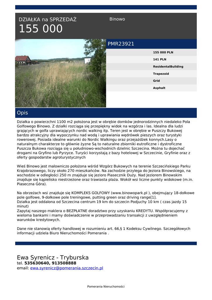 Binowo DZIAŁKA na SPRZEDAŻ 155 000 PMR23921 155 000 PLN 141 PLN ResidentalBuilding Trapezoid Grid Asphalt Opis Działka o powierzchni 1100 m2 położona jest w obrębie domków jednorodzinnych niedaleko Pola Golfowego Binowo. Z działki rozciąga się przepiękny widok na wzgórza i las. Idealna dla ludzi grających w golfa uprawiających nordic walking itp. Teren jest w obrębie w Puszczy Bukowej bardzo atrakcyjny dla wypoczynku nad wodą i uprawiania wędrówek pieszych oraz turystyki rowerowej. Posiada idealne warunki do Nordic Walkingu oraz przejażdżek konnych.Lasy o naturalnym charakterze to głównie żyzne Są to naturalne zbiorniki eutroficzne i dystroficzne Puszcza Bukowa rozciąga się u południowo-wschodnich dzielnic Szczecina. Można tu dojechać drogami na Gryfino lub Pyrzyce. Turyści korzystają z bazy hotelowej w Szczecinie, Gryfinie oraz z oferty gospodarstw agroturystycznych Wieś Binowo jest malowniczo położona wśród Wzgórz Bukowych na terenie Szczecińskiego Parku Krajobrazowego, liczy około 270 mieszkańców. Na zachodzie przylega do Jeziora Binowskiego, na wschodzie w odległości 250 m znajduje się jezioro Piasecznik Duży. Nad Jeziorem Binowskim znajduje się kąpielisko niestrzeżone oraz trawiasta plaża. Wokół wsi liczne punkty widokowe (m.in. Piaseczna Góra). Na obrzeżach wsi znajduje się KOMPLEKS GOLFOWY (www.binowopark.pl ), obejmujący 18-dołkowe pole golfowe, 9-dołkowe pole treningowe, putting green oraz driving range[1]. Działka jest oddalona od Szczecina centrum 19 km do szczecin Podjuchy 10 km ( czas jazdy 15 minut) Zapytaj naszego maklera o BEZPŁATNE doradztwo przy uzyskaniu KREDYTU. Współpracujemy z wieloma bankami i mamy doświadczenie w przeprowadzaniu transakcji z uwzględnieniem warunków kredytowych. Dane nie stanowią oferty handlowej w rozumieniu art. 66,§ 1 Kodeksu Cywilnego. Szczegółowych informacji udziela Biuro Nieruchomości Pomerania . Ewa Syrenicz - Tryburska tel. 535630640, 913508888 email: [email protected] Pomerania Nieruchomości Pomerania Nieruchomości Powered by TCPDF (www.tcpdf.org)