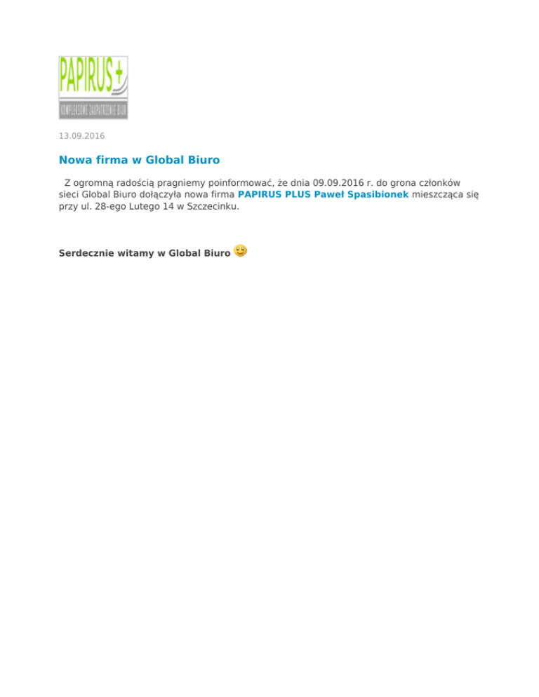 13.09.2016 Nowa firma w Global Biuro Z ogromną radością pragniemy poinformować, że dnia 09.09.2016 r. do grona członków sieci Global Biuro dołączyła nowa firma PAPIRUS PLUS Paweł Spasibionek mieszcząca się przy ul. 28-ego Lutego 14 w Szczecinku. Serdecznie witamy w Global Biuro