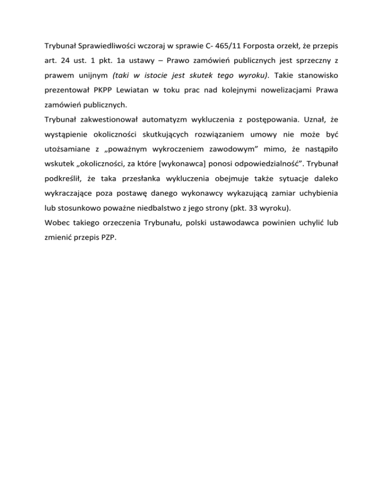 Trybunał Sprawiedliwości wczoraj w sprawie C- 465/11 Forposta orzekł, że przepis art. 24 ust. 1 pkt. 1a ustawy – Prawo zamówień publicznych jest sprzeczny z prawem unijnym (taki w istocie jest skutek tego wyroku). Takie stanowisko prezentował PKPP Lewiatan w toku prac nad kolejnymi nowelizacjami Prawa zamówień publicznych. Trybunał zakwestionował automatyzm wykluczenia z postępowania. Uznał, że wystąpienie okoliczności skutkujących rozwiązaniem umowy nie może być utożsamiane z „poważnym wykroczeniem zawodowym” mimo, że nastąpiło wskutek „okoliczności, za które [wykonawca] ponosi odpowiedzialność”. Trybunał podkreślił, że taka przesłanka wykluczenia obejmuje także sytuacje daleko wykraczające poza postawę danego wykonawcy wykazującą zamiar uchybienia lub stosunkowo poważne niedbalstwo z jego strony (pkt. 33 wyroku). Wobec takiego orzeczenia Trybunału, polski ustawodawca powinien uchylić lub zmienić przepis PZP.