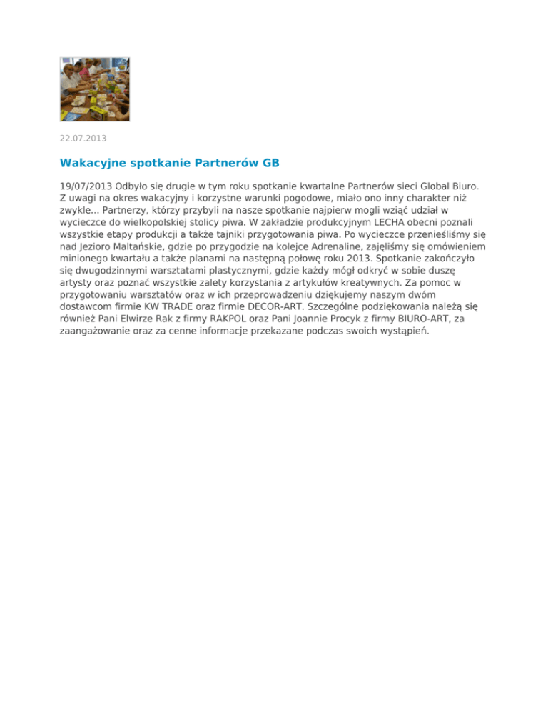 22.07.2013 Wakacyjne spotkanie Partnerów GB 19/07/2013 Odbyło się drugie w tym roku spotkanie kwartalne Partnerów sieci Global Biuro. Z uwagi na okres wakacyjny i korzystne warunki pogodowe, miało ono inny charakter niż zwykle... Partnerzy, którzy przybyli na nasze spotkanie najpierw mogli wziąć udział w wycieczce do wielkopolskiej stolicy piwa. W zakładzie produkcyjnym LECHA obecni poznali wszystkie etapy produkcji a także tajniki przygotowania piwa. Po wycieczce przenieśliśmy się nad Jezioro Maltańskie, gdzie po przygodzie na kolejce Adrenaline, zajęliśmy się omówieniem minionego kwartału a także planami na następną połowę roku 2013. Spotkanie zakończyło się dwugodzinnymi warsztatami plastycznymi, gdzie każdy mógł odkryć w sobie duszę artysty oraz poznać wszystkie zalety korzystania z artykułów kreatywnych. Za pomoc w przygotowaniu warsztatów oraz w ich przeprowadzeniu dziękujemy naszym dwóm dostawcom firmie KW TRADE oraz firmie DECOR-ART. Szczególne podziękowania należą się również Pani Elwirze Rak z firmy RAKPOL oraz Pani Joannie Procyk z firmy BIURO-ART, za zaangażowanie oraz za cenne informacje przekazane podczas swoich wystąpień.