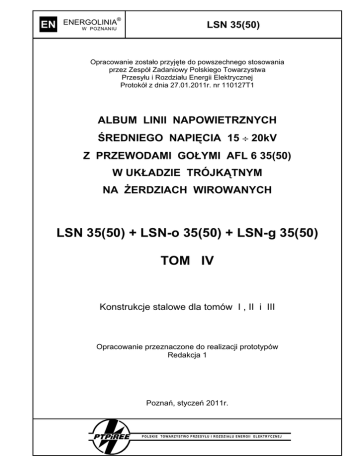 EN ENERGOLINIA® W POZNANIU LSN 35(50) Opracowanie zostaáo przyjĊte do powszechnego stosowania przez Zespóá Zadaniowy Polskiego Towarzystwa Przesyáu i Rozdziaáu Energii Elektrycznej Protokóá z dnia 27.01.2011r. nr 110127T1 ALBUM LINII NAPOWIETRZNYCH ĝREDNIEGO NAPIĉCIA 15 y 20kV Z PRZEWODAMI GOàYMI AFL 6 35(50) W UKàADZIE TRÓJKĄTNYM NA ĩERDZIACH WIROWANYCH LSN 35(50) + LSN-o 35(50) + LSN-g 35(50) TOM IV Konstrukcje stalowe dla tomów I , II i III Opracowanie przeznaczone do realizacji prototypów Redakcja 1 PoznaĔ, styczeĔ 2011r. POLSKIE TOWARZYSTWO PRZESYáU I ROZDZIAáU ENERGII ELEKTRYCZNEJ EN ENERGOLINIA W POZNANIU LSN 35(50) Oferta PTPiREE w zakresie opracowaĔ typizacyjnych 01/1998 - Albumy linii napowietrznych niskiego napiĊcia z przewodami goáymi AL 25-95 mm2 na Īerdziach wirowanych Lnn 02/1999 - Albumy linii napowietrznych wielotorowych niskiego napiĊcia z przewodami izolowanymi samonoĞnymi o przekroju 25-120 mm2 Lnni 03/1999 - Album przyáączy napowietrznych i kablowych niskiego napiĊcia Lnn-pi 04/2000 - Album linii napowietrznych niskiego napiĊcia Lnn + Lnni z przewodami izolowanymi samonoĞnymi AsXS i AsXSn na istniejących liniach niskiego napiĊcia z przewodami goáymi na sáupach z Īerdzi ĩN 05/1998 - Albumy sáupowych stacji transformatorowych typu STSR na Īerdziach wirowanych 21/2007 - Album sáupowych stacji transformatorowych SN/nn STN, STNu z transformatorami o mocy do 630 kVA na Īerdziach wirowanych 06/2001 - Albumy sáupowych stacji transformatorowych typu STSd na Īerdziach drewnianych 07/2002 - Albumy linii napowietrznych Ğredniego napiĊcia 15-20 kV z przewodami goáymi w ukáadzie trójkątnym na Īerdziach wirowanych typu E i ELV LSN 35(50) i 70(50) 24/2011 - Albumy linii napowietrznych Ğredniego napiĊcia 15-20 kV z przewodami goáymi w ukáadzie trójkątnym na Īerdziach wirowanych typu E i ELV LSN 35(50) i 70(50) 08/2000 - Albumy linii napowietrznych Ğredniego napiĊcia 15-20 kV z przewodami goáymi w ukáadzie páaskim na Īerdziach wirowanych LSN 70 (50) 23/2008 - Albumy linii napowietrznych Ğredniego napiĊcia 15-20 kV z przewodami goáymi w ukáadzie páaskim na Īerdziach wirowanych LSN 70 (50) 09/1998 - Albumy linii napowietrznych Ğredniego napiĊcia 15-20 kV z przewodami goáymi na Īerdziach wirowanych LSN 120 (70) - ukáad przewodów páaski i trójkątny 14/2001 - Albumy linii dwutorowych Ğredniego napiĊcia 15-20 kV z przewodami goáymi na Īerdziach wirowanych LSN 12/2000 - Albumy sáupów z rozáącznikami sterowanymi radiowo dla linii Ğredniego napiĊcia 15-20 kV 13/2001 - Album linii napowietrznych Ğredniego napiĊcia 15-20 kV z przewodami goáymi w ukáadzie trójkątnym na Īerdziach drewnianych LSNd 35 (50) 70 22/2008 - Album punktów pomiarowych w liniach napowietrznych Ğredniego napiĊcia 15÷20 kV LSN – PR 10/2003 - Albumy linii napowietrznych Ğredniego napiĊcia 15-20 kV z przewodami niepeánoizolowanymi LSNi 50÷120 na Īerdziach wirowanych – ukáad przewodów páaski i pionowy 11/2005 - Albumy linii napowietrznych dwutorowych Ğredniego napiĊcia 15-20 kV z przewodami niepeánoizolowanymi o przekrojach 2x70÷120 mm2 w ukáadzie pionowym na Īerdziach wirowanych 15/2005 - Albumy linii napowietrznych dwunapiĊciowych Ğredniego napiĊcia z przewodami niepeánoizolowanych i peánoizolowanymi niskiego napiĊcia z przewodami izolowanymi na Īerdziach wirowanych LSNi + LnNi 20/2007 - Albumy linii napowietrznych Ğredniego napiĊcia 15 y 20 kV z przewodami niepeánoizolowanymi w ukáadzie pionowym na Īerdziach drewnianych LSNid 50y120 16/1996 - Albumy linii napowietrznych izolowanych Ğredniego i niskiego napiĊcia LSNi / SAXKA + Lnni 18/1999 - Katalog oĞwietlenia ulicznego 19/1998 - Katalogi sáupów i fundamentów linii 110 kV Peána informacja na temat wydawnictw PTPiREE zamieszczona zostaáa na stronach www PTPiREE o adresie: www.ptpiree.pl w dziale „Oferta” / „Wydawnictwa” Rozpowszechnianie: Polskie Towarzystwo Przemysáu i Rozdziaáu Energii Elektrycznej w Poznaniu ul. WoáyĔska 22, 60 – 637 PoznaĔ tel. +48 61 846-02-33, fax +48 61 846-02-09 Powielanie i rozpowszechnianie powyĪszych opracowaĔ bez zgody Polskiego Towarzystwa Przesyáu i Rozdziaáu Energii Elektrycznej oraz zespoáu autorskiego jest wzbronione. POLSKIE TOWARZYSTWO PRZESYáU I ROZDZIAáU ENERGII ELEKTRYCZNEJ EN ENERGOLINIA® LSN 35(50) W POZNANIU Wydawca opracowania Polskie Towarzystwo Przesyáu i Rozdziaáu Energii Elektrycznej ul. WoáyĔska 22, 60-637 PoznaĔ tel. +48 61 846 02 00, fax. +48 61 846 02 09 www.ptpiree.pl, e-mail: [email protected] Rozpowszechnianie albumów Biuro Polskiego Towarzystwa Przesyáu i Rozdziaáu Energii Elektrycznej ul. WoáyĔska 22, 60-637 PoznaĔ tel. +48 61 846 02 33, fax. +48 61 846 02 09 e-mail: [email protected] Powielanie i rozpowszechnianie opracowania bez zgody Polskiego Towarzystwa Przesyáu i Rozdziaáu Energii Elektrycznej jest wzbronione Autor opracowania EN £ ENERGOLINIA spóáka z o.o. ul. Kramarska 26, 61-765 PoznaĔ tel./fax. +48 61 852 46 63 e-mail: [email protected] NIP 778-01-62-287 REGON 630174554 Zespóá autorski: inĪ. Czesáaw Olejniczak mgr inĪ. Rafaá Nowicki tech. Andrzej Kubiak mgr inĪ. Rafaá Trafny POLSKIE TOWARZYSTWO PRZESYáU I ROZDZIAáU ENERGII ELEKTRYCZNEJ EN ENERGOLINIA W POZNANIU LSN 35(50) Spis tomów Tom I - Album linii napowietrznych Ğredniego napiĊcia 15 y 20kV z przewodami goáymi na Īerdziach wirowanych LSN 35(50) - Przewody AFL-6 35 i 50mm2 - Ukáad trójkątny Tom II - Album sáupów z odáącznikami i rozáącznikami dla linii napowietrznych Ğredniego napiĊcia 15 y 20kV z przewodami goáymi na Īerdziach wirowanych LSN-o 35(50) - Przewody AFL-6 35 i 50mm2 - Ukáad trójkątny Tom III - Album sáupów z gáowicami kablowymi, odáącznikami i rozáącznikami dla linii napowietrznych Ğredniego napiĊcia 15 y 20kV z przewodami goáymi na Īerdziach wirowanych LSN-g 35(50) - Przewody AFL-6 35 i 50mm2 - Ukáad trójkątny Tom IV - Album