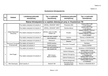 Tabela nr 2 Tabela nr 2 Zestawienie klimatyzatorów Lp. Oddział Lokalizacja jednostki zewnętrznej Typ, nr jednostki zewnetrznej Lokalizacja jednostki wewnętrznej Typ, nr jednostki wewnętrznej Wykaz klimatyzatorów w szpitalu dziecięcym przy ul. Krysiewicza 7/8 1 Przy wejściu awaryjnym do budynku A AIRVELL ODUWAP 12RCT Pracownia USG Przy wejściu awaryjnym do budynku A AIRVELL ODUWAP 12RCT Dyżurka lekarzy Zakład Diagnostyki Przy wejściu awaryjnym do budynku A Obrazowej Przy wejściu awaryjnym do budynku A Przy wejściu awaryjnym do budynku A 2. Ptacownia Tomografii Przy wejściu do budynku A Komputerowej Przy wejściu do budynku A Przy wejściu do budynku A AIRVELL DUO 18-18RC 7SP091139 nr SINCLAIR ASH-12AINPT 4341310001241 nr Mitsubischi DAIKIN pdwójny Korytarz Ciemnia Ścienny nr 63229914452 Pracownia RTG z aparatem Siemens Ścienny nr 727104223 Pracownia Tomografii DAIKIN pdwójny SINCLAIR ASP/ASGE36AI nr 9551400000108 Izba Przyjęć Przy wejściu awaryjnym do budynku A MDV Corona M40A-27HRDN1 Poczekalnia Gabinet Chirurgiczny Gabinet Pediatryczny Dyżurka pielęgniarek 4. Blok Operacyjny Dach budynku A McQUAY M5 Strona 1 z 20 Kanałowy Ścienny DAIKIN Gabinet Zabiegowy 3 Ścienny SPLIT AIR nr 2271534422 Ścienny SPLIT AIR nr 2271852422 Sufitowy AIRVELL DUO18-1 nr 2271545864 Sufitowy AIRVELL DUO18-1 nr 2271545863 Wentylatorownia, chłodzenie UPS Kanałowy nr 9193780000035 Sufitowy MDV Corona nr c10119428410414130019 Sufitowy MDV Corona nr 70300962160 Sufitowy MDV Corona nr c101199428041041413008 Sufitowy MDV Corona nr 812640002 Ścienny nr 20520206-00513 Tabela nr 2 Lp. Oddział Lokalizacja jednostki zewnętrznej Typ, nr jednostki zewnetrznej Lokalizacja jednostki wewnętrznej Ściana zewnętrzna budynku A od strony Portierni DAIKIN RN35DAV3B I piętro Dyzurka lekarzy I piętro Gabinet Ordynatora 5. Chirurgia Ściana zewnętrzna budynku A od strony Portierni SINCLAIR MC-E-36AI 9868110000278 nr Sala chorych nr 1 Sala chorych nr 2 Sala chorych nr 3 Ściana zewnętrzna budynku A od strony Portierni Ściana zewnętrzna budynku A od strony Portierni DAIKIN RN 35 DAV3B Dyzurka lekarzy DAIKIN RN 25 DAV3B Gabinet Zabiegowy Korytarz 6. Laryngologia Balkon na III piętrze SINCLAIR MC-E-36AI 9868120000475 nr Dyżurka pielęgniarek Pokój matek Pokój matek Strona 2 z 20 Typ, nr jednostki wewnętrznej Ścienny DAIKIN FT 6000303/6000472 Ścienny SINCLAIR nr 4c 9311000011 Ścienny SINCLAIR nr 4c 9311000267 Ścienny SINCLAIR nr 4c 9311000267 Ścienny SINCLAIR nr 4c 9311000274 Ścienny DAIKIN nr G000637/G000615 Ścienny DAIKIN nr G000706/G001123 Sufitiwy MC-C-18 AI nr 9139010000183 Ścienny MC-H-12AICPT nr 4c 92420000360 Ścienny MC-H-12AICPT nr 4c 93110000191 Ścienny MC-H-12AICPT nr 4c 92420000302 Tabela nr 2 Lp. Oddział Lokalizacja jednostki zewnętrznej Dach budynku A 7. Ortopedia Typ, nr jednostki zewnetrznej DAIKIN FCQ 35 Lokalizacja jednostki wewnętrznej Sala chorych nr 5 Dach budynku A Dach budynku A Balkon na III piętrze FUJI ELECTRIC RS12US DAIKIN DAIKIN Pokój zabiegowy Dyżurka lekarska Przejście do wentylatorowni Dyżurka Ppielęgniarek Balkon na III piętrze FUJI ELECTRIC RJZ14LB Sala chorych nr 2 Balkon na III piętrze McQUAY MWMO Balkon na III piętrze McQUAY M5 8. Dzieci Starszych I 9. Poradnia Reumatologiczna 10. Poradnia Chirurgiczna Ściana zewnętrzna budynku A od strony Portierni 11. Rozdzielnia w budynku A Przy wejściu do budynku A Przy wejściu do poradni DAIKIN McQUAY MWM1 potrójny Climavent Strona 3 z 20 Dyżurka lekarska Dyżurka pielęgniarska Gabinet zabiegowy Gabinet lekarski (reumatolog) Rejestracja Korytarz Gabinet lekarski (chirurg) Rozdzielnia elektryczna Typ, nr jednostki wewnętrznej Sufitiwy FCQ 35C7VEB nr 2908608 Sufitiwy FCQ 35C7VEB Ścienny E027671 Ścienny FIN 25DV343 Ścienny FIN 25DV343 Ścienny RJZ 14LBC nr E6001357 Ścienny nr 2051030502643 Ścienny nr 2051030502672 Ścienny nr 5051171201001 Ścienny nr G001677 Ścienny nr 2050210500494 Ścienny nr 2050210500493 Ścienny nr 2050210500498 Scienny Tabela nr 2 Lp. Oddział Lokalizacja jednostki zewnętrznej Na ścianie budynku B nad budynkiem Pracowni Endoskopowej Na ścianie budynku B nad stolarnią Na ścianie budynku B nad stolarnią Na ścianie budynku B nad budynkiem Pracowni Endoskopowej Na ścianie budynku B nad stolarnią Na ścianie budynku B nad stolarnią 12. Typ, nr jednostki zewnetrznej Lokalizacja jednostki wewnętrznej Typ, nr jednostki wewnętrznej DAIKIN I piętro Gabinet zabiegowy Ścienny nr G002490 DAIKIN I piętro Dyżurka lekarska I piętro Dyżurka pielęgniarek Ścienny nr G001168 DAIKIN II piętro Gabinet zabiegowy Ścienny nr G001169 DAIKIN II piętro Dyżurka lekarska Ścienny nr G001344 Ścienny MC-H-09AICPT nr 4c 92420002526 Ścienny MC-H-09AICPT nr 4c 92420002597 Sufitowy MC-C-12AI nr 8138920000674 Sufitowy MC-C-12AI nr 8138920000782 Sufitowy MC-C-12AI nr 8138920000791 DAIKIN SINCLAIR MC-E-18AI 4A 41610004301 nr II piętro sala chorych nr 5 II piętro sala chorych nr 6 Wewnętrzny Hwmatologiczny II piętro sala chorych nr 1 Na ścianie budynku B nad budynkiem Pracowni Endoskopowej SINCLAIR MC-E-18AI 4A 41610004301 nr II piętro sala chorych nr 2 II piętro sala chorych nr 3 Na ścianie budynku B nad budynkiem Pracowni Endoskopowej LG UU18WH.UE1 nr 301KAKN00013 Na ścianie budynku B z tyłu LG MU3M19.UE2 nr 301KABF01461 Strona 4 z 20 Ścienny nr G001390 I piętro korytarz lewa strona Kanałowy LG UB18H.NG1 nr 303KANY00007 I piętro korytarz lewa strona Ścienny LG MSO 9AQ nr 304KAPB00144 Ścienny LG MSO 9AQ nr 304KAPB00133 Tabela nr 2 Lp. 13. Oddział Typ, nr jednostki zewnetrznej Lokalizacja jednostki wewnętrznej Na ścianie budynku C za oknem LUX ASW-09 nr E147406207 Na ścianie budynku C za oknem LUX ASWE1054062070020 Drugie pomieszczenie Ruchu chorych Pierwsze pomieszczenie Ruchu chorych Na ścianie budynku C za oknem DAIKIN FHQ 60 Lokalizacja jednostki zewnętrznej Ruch chorych 14. Świetlica 15. Pracownia Endoskopowa 18. 19. 20. 21. Pomieszczenie informatyków