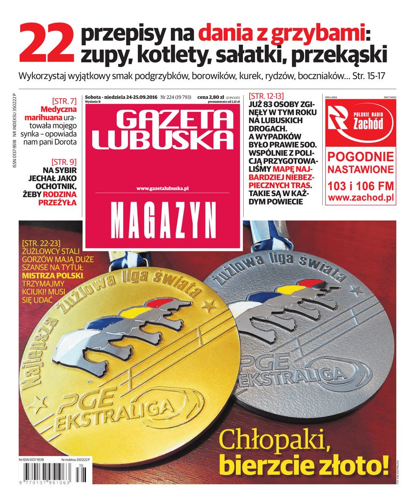 22 przepisy na dania z grzybami: zupy, kotlety, sałatki, przekąski [STR. 7] Medyczna marihuana uratowała mojego synka – opowiada nam pani Dorota Sobota - niedziela 24-25.09.2016 Nr 224 (19 793) Wydanie B [STR. 9] NA SYBIR JECHAŁ JAKO OCHOTNIK, ŻEBY RODZINA PRZEŻYŁA www.gazetalubuska.pl cena 2,80 zł (Z 8%VAT) prenumerata od 1,12 zł [STR. 12-13] JUŻ 83 OSOBY ZGINĘŁY W TYM ROKU NA LUBUSKICH DROGACH. A WYPADKÓW BYŁO PRAWIE 500. WSPÓLNIE Z POLICJĄ PRZYGOTOWALIŚMY MAPĘ NAJBARDZIEJ NIEBEZPIECZNYCH TRAS. TAKIE SĄ W KAŻDYM POWIECIE REKLAMA 006734583 [STR. 22-23] ŻUŻLOWCY STALI GORZÓW MAJĄ DUŻE SZANSE NA TYTUŁ MISTRZA POLSKI. TRZYMAJMY KCIUKI! MUSI SIĘ UDAĆ Nr ISSN 0137-9518 Nr indeksu 350222 P Chłopaki, bierzcie złoto! FOT. PGE EKSTRALIGA ISSN 0137-9518 NR INDEKSU 350222 P Wykorzystaj wyjątkowy smak podgrzybków, borowików, kurek, rydzów, boczniaków... Str. 15-17 Gazeta Lubuska Sobota–niedziela, 24–25 września 2016 www.gazetalubuska.pl pogoda na weekend 24-25.09.2016 Rusz się. Dwie propozycje na weekend NIEDZIELA PONIEDZIAŁEK FOT. BEST FILM SOBOTA FOT. FORUM FILM POLAND 02// Peryskop Region Imieniny – sobota: Gerard, Herman, Jaromir, Maria, Tomir niedziela: Aurelia, Franciszek, Kamil, Rufus, Wawrzyniec, Władysław Kalendarium A 1935 – 81 lat temu. 25 września zmarł prezes Towarzystwa Rzemieślników Polskich w Grünbergu (Zielonej Górze) Kazimierz Lisowski. Żył 72 lata. A 1965 – 51 lat temu. 24 września pierwsza inauguracja roku akademickiego w Wyższej Szkole Inżynierskiej w Zielonej Górze. A 1999 – 17 lat temu. 24 września w Gorzowie rozwiązano 4. Nadwarciańską Brygadę Saperów. A 2005 – 11 lat temu. 25 września w Tunezji zmarł dr hab. Kazimierz Głazek, matematyk, himalaista, związany z Uniwersytetem Zielonogórskim. Żył 66 lat. MAX MIN. MAX MIN. MAX MIN. 18 12 19 9 19 10 W sobotę będzie pochmurno, ale bez opadów deszczu. W niedzielę trochę więcej słońca, również nie powinno padać. KINO „Plan Maggie” – komedia romantyczna: Maggie (Greta Gerwig) chce tylko zajść w ciążę, ale zakochuje się, i to wcale nie w tym wymarzonym mężczyźnie (Ethana Hawke nigdy za wiele – patrz film obok). (HAK) KINO „Siedmiu wspaniałych” – nowa wersja klasycznego westernu z 1960 roku. Z m.in. Denzelem Washingtonem i Ethanem Hawke w siodle i z coltem w dłoni. Siedmiu najemników kontra armia bandytów. (HAK) Czasami lepiej jest się nie wyróżniać Tydzień z „Gazetą Lubuską” Komentarz Szymon Kozica sekretarz redakcji FOT. MAREK SZAWDYN FOT. WALDEMAR WYLEGALSKI O Poniedziałek Szkoła po nowemu, czyli minister Zalewska przedstawia A Pierwszy mecz finału ekstraligi: Get Well – Stal 49:41, finał pocieszenia: Sparta – Falubaz 42:48. A Nowa reforma polskiej oświaty. Na razie jest bardzo dużo pytań, obaw i wątpliwości... u już marszałek Elżbietę Annę Polak ratował rzecznik. Z jakim skutkiem? Otóż zapewnił, że w finale pani marszałek będzie kibicowała Stali. I dodał: „Marszałek – oprócz tego, że jest marszałkiem – jest także kibicem, który kibicuje takiej drużynie, jakiej chce. Marszałek Polak kibicowała Falubazowi do chwili, gdy ten liczył się w rozgrywkach o złoto. Natomiast kiedy na polu walki o mistrzostwo Polski pozostała Stal Gorzów, marszałek kibicuje Stali Gorzów, jako drużynie reprezentującej woj. lubuskie”. ho, to w niedzielę każdy będzie mógł krzyknąć: sprawdzam! Pani marszałek dostała bowiem od kibiców z Gorzowa bilet VIP na finał i szalik Stali. Podpowiem tylko, że korzystnie byłoby ubrać się na żółto. Żeby znów się nie wyróżniać... a ¹ O FOT. JAKUB PIKULIK Wtorek Środa A Budowa odcinka trasy S3 z Bolkowa do granicy z Czechami stanęła pod znakiem zapytania. Komisja Europejska odrzuciła wniosek o dofinansowanie. Do granicy w Lubawce zabraknie 31 km. A Sprzed bloku przy ul. Kraljevskiej w Zielonej Górze ktoś ukradł samochód, którym Krystyna Bohonos woziła do ośrodka rehabilitacyjnego Promyk swojego niepełnosprawnego syna Krzysia. A W Mościcach pod Kostrzynem stanęła kukła z suszarką, przypominająca policjanta drogówki. Kierowców „suszyła” jednak tylko cztery dni. Na polecenie zarządu dróg została usunięta. Środa Czwartek Czwartek A Przedstawiciele policji i prokuratury ustalili, jak hamować zapędy kierowców na trasie Zielona Góra – Nowogród Bobrzański. Pojawią się tu dodatkowe znaki, a później odcinkowy pomiar prędkości. A Stefan Niesiołowski oficjalnie przestał być członkiem PO. – Platforma, zamiast skutecznie walczyć z PiS, zajmuje się konfliktami wewnętrznymi. Mamy rozwiązywanie struktur partii – oświadczył. A Nowaki z Zielonej Góry – Kamil Piróg, Adrianna Borek i Tomek Marciniak – będą gospodarzami niedzielnego wieczoru „Kabaret na żywo”. Transmisja w Polsacie rozpocznie się o godzinie 20.05. FOT. MARIUSZ KAPAŁA FOT. PIOTR SMOLIŃSKI FOT. ZDZISŁAW HACZEK Wtorek FOT. PIOTR JĘDZURA T T W obiektywie FOT. MARIUSZ KAPAŁA FOT. MARIUSZ KAPAŁA Poniedziałek Falubaz pędzi po brąz, Stal z szansami na złoto j, wymsknęło się marszałek Elżbiecie Annie Polak, wymsknęło... „Byłam wczoraj na meczu, więc nie będziemy mistrzem Polski, ale byliśmy ośmiokrotnie” – powiedziała na konferencji prasowej dzień po tym, jak żużlowcy Falubazu Zielona Góra nie awansowali do finału ekstraligi. Ktoś rozsądnie zauważył, że przecież mistrzem wciąż być możemy, bo do finału wjechała – i to w jakim stylu! – Stal Gorzów. Wszak mieszkamy w województwie lubuskim, urząd marszałkowski też lubuski jest, a i Elżbieta Anna Polak za marszałka wszystkich Lubuszan uchodzi. Elżbieta Anna Polak odparła jednak tak: „Dokładnie, słuszna uwaga, sorry, więc ośmiokrotny mistrz Polski Falubaz, ośmiokrotny Stal i właśnie w Łodzi ktoś tam był z Torunia i powiedział, że w tym roku będzie Toruń i chyba tak będzie”. u już zdębiałem. I w