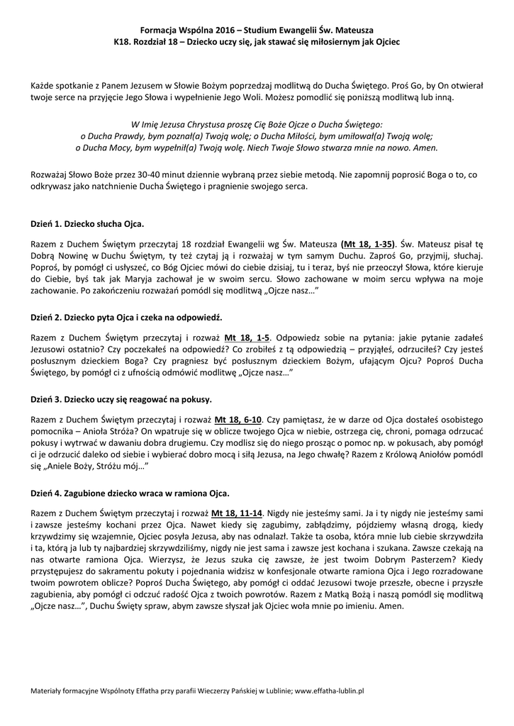 Formacja Wspólna 2016 – Studium Ewangelii Św. Mateusza K18. Rozdział 18 – Dziecko uczy się, jak stawać się miłosiernym jak Ojciec Każde spotkanie z Panem Jezusem w Słowie Bożym poprzedzaj modlitwą do Ducha Świętego. Proś Go, by On otwierał twoje serce na przyjęcie Jego Słowa i wypełnienie Jego Woli. Możesz pomodlić się poniższą modlitwą lub inną. W Imię Jezusa Chrystusa proszę Cię Boże Ojcze o Ducha Świętego: o Ducha Prawdy, bym poznał(a) Twoją wolę; o Ducha Miłości, bym umiłował(a) Twoją wolę; o Ducha Mocy, bym wypełnił(a) Twoją wolę. Niech Twoje Słowo stwarza mnie na nowo. Amen. Rozważaj Słowo Boże przez 30-40 minut dziennie wybraną przez siebie metodą. Nie zapomnij poprosić Boga o to, co odkrywasz jako natchnienie Ducha Świętego i pragnienie swojego serca. Dzień 1. Dziecko słucha Ojca. Razem z Duchem Świętym przeczytaj 18 rozdział Ewangelii wg Św. Mateusza (Mt 18, 1-35). Św. Mateusz pisał tę Dobrą Nowinę w Duchu Świętym, ty też czytaj ją i rozważaj w tym samym Duchu. Zaproś Go, przyjmij, słuchaj. Poproś, by pomógł ci usłyszeć, co Bóg Ojciec mówi do ciebie dzisiaj, tu i teraz, byś nie przeoczył Słowa, które kieruje do Ciebie, byś tak jak Maryja zachował je w swoim sercu. Słowo zachowane w moim sercu wpływa na moje zachowanie. Po zakończeniu rozważań pomódl się modlitwą „Ojcze nasz…” Dzień 2. Dziecko pyta Ojca i czeka na odpowiedź. Razem z Duchem Świętym przeczytaj i rozważ Mt 18, 1-5. Odpowiedz sobie na pytania: jakie pytanie zadałeś Jezusowi ostatnio? Czy poczekałeś na odpowiedź? Co zrobiłeś z tą odpowiedzią – przyjąłeś, odrzuciłeś? Czy jesteś posłusznym dzieckiem Boga? Czy pragniesz być posłusznym dzieckiem Bożym, ufającym Ojcu? Poproś Ducha Świętego, by pomógł ci z ufnością odmówić modlitwę „Ojcze nasz…” Dzień 3. Dziecko uczy się reagować na pokusy. Razem z Duchem Świętym przeczytaj i rozważ Mt 18, 6-10. Czy pamiętasz, że w darze od Ojca dostałeś osobistego pomocnika – Anioła Stróża? On wpatruje się w oblicze twojego Ojca w niebie, ostrzega cię, chroni, pomaga odrzucać pokusy i wytrwać w dawaniu dobra drugiemu. Czy modlisz się do niego prosząc o pomoc np. w pokusach, aby pomógł ci je odrzucić daleko od siebie i wybierać dobro mocą i siłą Jezusa, na Jego chwałę? Razem z Królową Aniołów pomódl się „Aniele Boży, Stróżu mój…” Dzień 4. Zagubione dziecko wraca w ramiona Ojca. Razem z Duchem Świętym przeczytaj i rozważ Mt 18, 11-14. Nigdy nie jesteśmy sami. Ja i ty nigdy nie jesteśmy sami i zawsze jesteśmy kochani przez Ojca. Nawet kiedy się zagubimy, zabłądzimy, pójdziemy własną drogą, kiedy krzywdzimy się wzajemnie, Ojciec posyła Jezusa, aby nas odnalazł. Także ta osoba, która mnie lub ciebie skrzywdziła i ta, którą ja lub ty najbardziej skrzywdziliśmy, nigdy nie jest sama i zawsze jest kochana i szukana. Zawsze czekają na nas otwarte ramiona Ojca. Wierzysz, że Jezus szuka cię zawsze, że jest twoim Dobrym Pasterzem? Kiedy przystępujesz do sakramentu pokuty i pojednania widzisz w konfesjonale otwarte ramiona Ojca i Jego rozradowane twoim powrotem oblicze? Poproś Ducha Świętego, aby pomógł ci oddać Jezusowi twoje przeszłe, obecne i przyszłe zagubienia, aby pomógł ci odczuć radość Ojca z twoich powrotów. Razem z Matką Bożą i naszą pomódl się modlitwą „Ojcze nasz…”, Duchu Święty spraw, abym zawsze słyszał jak Ojciec woła mnie po imieniu. Amen. Materiały formacyjne Wspólnoty Effatha przy parafii Wieczerzy Pańskiej w Lublinie; www.effatha-lublin.pl Dzień 5. Dziecko Boże uczy się porozumiewać z drugim dzieckiem Bożym. Razem z Duchem Świętym przeczytaj i rozważ Mt 18, 15-20. Ojciec pragnie, abyśmy miłowali się wzajemnie tak, jak On nas umiłował. On nas kocha nieustająco pomimo, że czasami jesteśmy trudni do kochania. Nie uprzedza się do nas, nie odwraca plecami, nie jest zwolennikiem „cichych dni”. Razem z Duchem Świętym przyjrzyj się twoim trudnym relacjom, módl się za siebie i za tych, z którymi jesteś w tych relacjach, zapraszaj pomiędzy was Ducha Świętego. Poproś Maryję, aby modliła się z tobą w parze, aby pomogła ci oddać Jezusowi twoje poczucia krzywdy i poczucia winy, aby pomogła ci zrozumieć braci i siostry, a im pomogła zrozumieć ciebie, aby z pomocą łaski od Ojca pomogła wam się porozumieć. Opowiedz Matce Bożej i naszej o konkretnych trudnych sytuacjach. Razem z Nią pomódl się „Ojcze nasz”. Dzień 6. Dziecko Boże uczy się naśladować Miłosiernego Ojca. Razem z Duchem Świętym przeczytaj i rozważ Mt 18, 21-35. Przypatrz się każdemu z bohaterów tej opowieści. Jaki jesteś? Jaki pragniesz być? Razem z Duchem Świętym przyjrzyj się konkretnej sytuacji w twoim obecnym życiu, konkretnej relacji, w której potrzebujesz przebaczenia oraz takiej, w której pragniesz przebaczyć. Podziękuj za te konkretne sytuacje, w których otrzymałeś przebaczenie i te, w których przebaczyłeś. Podziękuj za łaski od Boga Ojca, dzięki którym było to możliwe. Razem z Matką Bożą i naszą pomódl się modlitwą „Ojcze nasz…” Materiały formacyjne Wspólnoty Effatha przy parafii Wieczerzy Pańskiej w Lublinie; www.effatha-lublin.pl