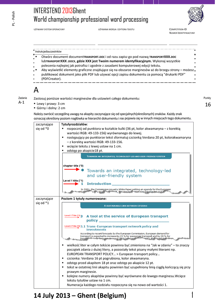 PL ‐ Polish INTERSTENO 2013Ghent World championship professional word processing UŻYWANY SYSTEM OPERACYJNY UŻYWANA WERSJA EDYTORA TEKSTU COMPETITION‐ID NUMER IDENTYFIKACYJNY Instrukcjedlauczestników Otwórz document documentTRANSPORT.DOC i od razu zapisz go pod nazwą TRANSPORTXXX.DOC lubTRANSPORTXXX .DOCX, gdzie XXX jest Twoim numerem identyfikacyjnym. Wykonaj wszystkie polecenia najlepiej jak potrafisz i zgodnie z zasadami komputerowej edycji tekstu. Aby wyświetlić elementy graficzne znajdujące się na obszarze marginesów aż do brzegu strony – możesz publikować dokument jako plik PDF lub używać opcji zapisu dokumentu za pomocą "drukarki PDF" (PDFCreator). A Zadanie A‐1 Punkty Zastosuj poniższe wartości marginesów dla ustawień całego dokumentu: Lewy i prawy: 3 cm Górny i dolny: 2 cm 16 Należy zwrócić szczególną uwagą na akapity zaczynające się od specjalnych(określonych) znaków. Każdy znak oznaczaj określony poziom nagłówka w hierarchii dokumentu i nie pojawia się w innych miejscach tego dokumentu. zaczynające się od *0 Tytułyrozdziałów: rozpocznij od punktora w kształcie kulki (36 pt, kolor akwamaryna – z korektą wartości RGB: 49‐133‐156) wyrównanego do lewej. następujący po punktorze tekst sformatuj czcionką Verdana 20 pt, kolorakwamaryna – z korektą wartości RGB: 49‐133‐156. wcięcie tekstu z lewej ustaw na 1 cm. odstęp po akapicie18 pt. zaczynające się od *1 Poziom 1 tytuły numerowane: wielkość liter w całym tekście powinna być zmieniona na “Jak w zdaniu” – to znaczy początek zdania z dużej litery, a pozostały tekst pisany małymi literami np. EUROPEAN TRANSPORT POLICY… > European transport policy… czcionka: Verdana 16 pt pogrubiona, kolor akwamaryna. odstęp przed akapitem 18 pt oraz odstęp po akapicie 12 pt. tekst w ostatniej linii akapitu powinien być uzupełniony linią ciągłą kończącą się przy prawym marginesie. kolejne numery akapitów powinny być wyrównane do lewego marginesu.Wcięce tekstu tytułów ustaw na 1 cm. Numeracja każdego rozdziału rozpoczyna się na nowo od wartości 1. 14 July 2013 – Ghent (Belgium) 1 PL ‐ Polish INTERSTENO 2013Ghent World championship professional word processing zaczynające się od *2 Poziom2tytułynumerowane: czcionka: Verdana 13pt pogrubiona, kolor akwamaryna. odstęp przed akapiem 12pt oraz odstęp po akapicie 6 pt. kolejne numery akapitów powinny byc wyrównane do lewego marginesu.Wcięce tekstu tytułów ustaw na 1 cm. zaczynające się od *3 Poziom 3 tytuły: czcionka: Verdana 11pt pogrubiona, kolor akwamaryna odstęp przed akapitem 10pt oraz odstęp po akapicie 6 pt. tekst wyrównany do lewego marginesu.Nie numeruj tych tytułów. zaczynające się od # Dwa tytuły zaczynające się znakiem#. Tytuły te powinny być napisane w kole o wypełnieniu w kolorze akwamaryny, każdy na oddzielnej stronie Koło ma wymiary 11 x 11 cm, położone jest w odległości dokładnie 12 cm od górnej krawędzi strony i kończy się na prawym marginesie. Tekst powinien być sformatowany czcionką Arial 36 pt, częściowo pogrubiony (A sustainablefuture ‐ Europe) i ustawiony jak na rysunku. Oba tytuły nie są numerowane i nie są częścią spisu treści! Na koniec usuńwszystkie znaczniki #, *0, *1, *2 oraz *3 znajdujące się na początku wszystkich akapitów z tytułami. Zadanie A‐2 Punkty Tekst główny (całość tekstu): 3 czcionka Verdana 10 pt odstęp po akapicie 6pt interlinia pojedyncza Zadanie A‐3 Wiele wartości procentowych jest przedstawionych w tekście przy użuciu znaku %, poprzedzonego znakiem spacji. Zaktualizuj dokument w ten sposób, aby znak % nie występował na początku wiersza tekstu jeśli nie mieści się na końcu poprzedniego wiersza. W takim przypadku wartość łącznie ze znakiem % powinna zostać przeniesiona do następnej linii. 14 July 2013 – Ghent (Belgium) 2 Punkty 3 PL ‐ Polish INTERSTENO 2013Ghent World championship professional word processing Zadanie A‐4 Punkty Wszystkieakapityzaczynającesięznakiem*Xsąelementami automatycznego wypunktowania. Jako punktora użyj następującego znaku (kuli). Dla punktoraustaw wysunięcie 0,2 cm w kierunku lewego marginesu, dla punktora ustaw kolor akwamaryna. 4 Tekst za punktorami powinien być wyrównany do lewej i zaczyna się w odstępie2 ptod punktora. Nie zapomnij usunąć wszystkich znaków *X. Zadanie A‐5 Punkty Dokument zawiera wiele numerowanych odnośników: są to liczby umieszczone w okrągłych nawiasach, wartości od 1 do maksymalnie 99. Usuń wszystkie odnośniki razem z nawiasami. Uważaj na spacje! 6 Zadanie A‐6 Punkty Wstaw nową, pustą stronę na początek dokumentu. 4 Wstaw rysunek COVER.JPGna górę tej strony, zachowując jego oryginalny rozmiar. Rysunek powinien zajmować całą szerokość strony,od krawędzi do krawędzie (jak na rysunku obok). Niektóre części rysunku znajdują się poza stroną i nie są widoczne, ponieważ rysunek w oryginalnej wersji jest zbyt szeroki w porównaniu do szerokości strony. Nie zwracaj na to uwagi! W dolnej części rysunku umieść tekst A substainablefuture for transport sformatowanyczcionką Arial 26 pt w kolorze białym. Trzy pierwsze słowa tekstu powinny być pogrubione. Ostatni znak tekstu powinien znaleźć się dokładnie przy prawym marginesie. Zadanie A‐7 Punkty Na dole każdej strony, z wyjątkiem pierwszej strony tytułowej, należy wstawić rysunek ICONS.JPG. Dolna krawędź tego rysunku powinna zjadować się w odległości 0,5 cm od dolnej krawędzi strony. 3 14 July 2013 – Ghent (Belgium) 3 PL ‐ Polish INTERSTENO 2013Ghent World championship professional word processing Zadanie A‐8 Punkty Na stronie następnej za stroną tytułową należy wstawić spis treści. Wprowadź jako tytuł spisu treści wyraz ‘Zawartość’ ‐ umieść go w tytule rozdziału przewidzianym w szablonie. 8 Spis treści powinien zawieraćć następujące poziomy: pozycje 'tytuły rozdziałów'