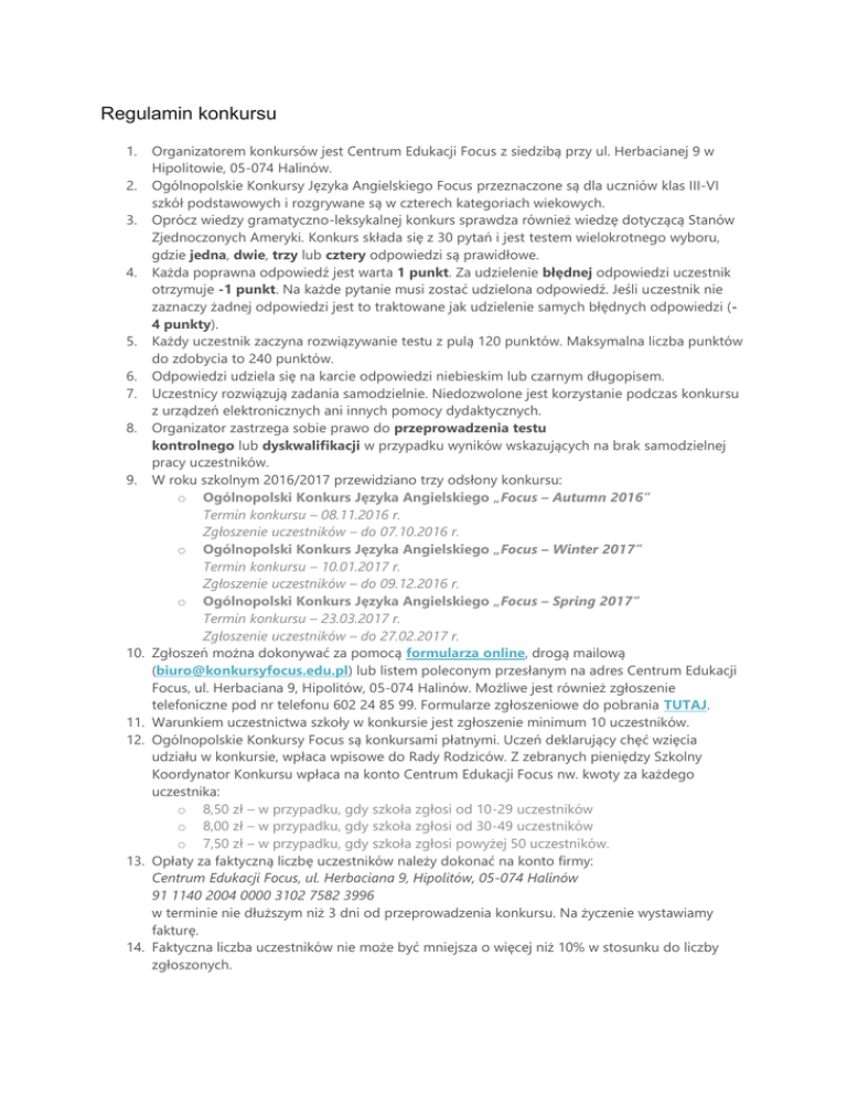 Regulamin konkursu 1. 2. 3. 4. 5. 6. 7. 8. 9. 10. 11. 12. 13. 14. Organizatorem konkursów jest Centrum Edukacji Focus z siedzibą przy ul. Herbacianej 9 w Hipolitowie, 05-074 Halinów. Ogólnopolskie Konkursy Języka Angielskiego Focus przeznaczone są dla uczniów klas III-VI szkół podstawowych i rozgrywane są w czterech kategoriach wiekowych. Oprócz wiedzy gramatyczno-leksykalnej konkurs sprawdza również wiedzę dotyczącą Stanów Zjednoczonych Ameryki. Konkurs składa się z 30 pytań i jest testem wielokrotnego wyboru, gdzie jedna, dwie, trzy lub cztery odpowiedzi są prawidłowe. Każda poprawna odpowiedź jest warta 1 punkt. Za udzielenie błędnej odpowiedzi uczestnik otrzymuje -1 punkt. Na każde pytanie musi zostać udzielona odpowiedź. Jeśli uczestnik nie zaznaczy żadnej odpowiedzi jest to traktowane jak udzielenie samych błędnych odpowiedzi (4 punkty). Każdy uczestnik zaczyna rozwiązywanie testu z pulą 120 punktów. Maksymalna liczba punktów do zdobycia to 240 punktów. Odpowiedzi udziela się na karcie odpowiedzi niebieskim lub czarnym długopisem. Uczestnicy rozwiązują zadania samodzielnie. Niedozwolone jest korzystanie podczas konkursu z urządzeń elektronicznych ani innych pomocy dydaktycznych. Organizator zastrzega sobie prawo do przeprowadzenia testu kontrolnego lub dyskwalifikacji w przypadku wyników wskazujących na brak samodzielnej pracy uczestników. W roku szkolnym 2016/2017 przewidziano trzy odsłony konkursu: o Ogólnopolski Konkurs Języka Angielskiego „Focus – Autumn 2016” Termin konkursu – 08.11.2016 r. Zgłoszenie uczestników – do 07.10.2016 r. o Ogólnopolski Konkurs Języka Angielskiego „Focus – Winter 2017” Termin konkursu – 10.01.2017 r. Zgłoszenie uczestników – do 09.12.2016 r. o Ogólnopolski Konkurs Języka Angielskiego „Focus – Spring 2017” Termin konkursu – 23.03.2017 r. Zgłoszenie uczestników – do 27.02.2017 r. Zgłoszeń można dokonywać za pomocą formularza online, drogą mailową ([email protected]) lub listem poleconym przesłanym na adres Centrum Edukacji Focus, ul. Herbaciana 9, Hipolitów, 05-074 Halinów. Możliwe jest również zgłoszenie telefoniczne pod nr telefonu 602 24 85 99. Formularze zgłoszeniowe do pobrania TUTAJ. Warunkiem uczestnictwa szkoły w konkursie jest zgłoszenie minimum 10 uczestników. Ogólnopolskie Konkursy Focus są konkursami płatnymi. Uczeń deklarujący chęć wzięcia udziału w konkursie, wpłaca wpisowe do Rady Rodziców. Z zebranych pieniędzy Szkolny Koordynator Konkursu wpłaca na konto Centrum Edukacji Focus nw. kwoty za każdego uczestnika: o 8,50 zł – w przypadku, gdy szkoła zgłosi od 10-29 uczestników o 8,00 zł – w przypadku, gdy szkoła zgłosi od 30-49 uczestników o 7,50 zł – w przypadku, gdy szkoła zgłosi powyżej 50 uczestników. Opłaty za faktyczną liczbę uczestników należy dokonać na konto firmy: Centrum Edukacji Focus, ul. Herbaciana 9, Hipolitów, 05-074 Halinów 91 1140 2004 0000 3102 7582 3996 w terminie nie dłuższym niż 3 dni od przeprowadzenia konkursu. Na życzenie wystawiamy fakturę. Faktyczna liczba uczestników nie może być mniejsza o więcej niż 10% w stosunku do liczby zgłoszonych. 15. Każda szkoła zgłoszona do konkursu otrzyma pakiet gotowych materiałów do przeprowadzenia konkursu na terenie szkoły na kilka dni przed jego terminem. W każdym zestawie znajdą Państwo: o odpowiednią liczbę testów o karty odpowiedzi o protokół wraz z instrukcją o kopertę zwrotną. 16. Konkurs odbywa się w podanym w p. 9 terminie; godzinę ustala Szkolny Koordynator Konkursu. Czas przewidziany na przeprowadzenie konkursu to 60 min wraz z czasem na sprawy organizacyjne. 17. Po przeprowadzeniu konkursu wypełnione karty odpowiedzi wraz z podpisanym protokołem oraz dowodem wpłaty Szkolny Koordynator Konkursu przesyła listem poleconym w kopercie zwrotnej w terminie nie dłuższym niż 3 dni (decyduje data wysyłki). Przesyłki kierować na adres: Centrum Edukacji Focus ul. Herbaciana 9 Hipolitów, 05-074 Halinów. 18. Wyniki konkursu wraz z dyplomami oraz nagrodami organizator zobowiązuje się przekazać do szkół w ciągu dwóch miesięcy od przeprowadzenia konkursu. 19. Wyniki konkursu są ostateczne i nie podlegają odwołaniu. 20. Dyplomy laureata konkursu oraz nagrody otrzymują uczniowie z najlepszymi wynikami do 7. miejsca włącznie. 21. Dla wszystkich uczestników przewidziano dyplomy uznania. 22. Dla zaangażowanych nauczycieli organizator przewidział zaświadczenia o przeprowadzeniu w szkole Ogólnopolskiego Konkursu Języka Angielskiego Focus. 23. Dla szkół zgłaszających największą liczbę uczestników w konkursie przewidziano nagrody książkowe. W przypadku dodatkowych wątpliwości zachęcamy do kontaktu telefonicznego pod numerem 602 24 85 99 lub mailowego [email protected] Centrum Edukacji Focus Lista zagadnień na rok szkolny 2016/2017. Klasa III Słownictwo 1. 2. 3. 4. 5. 6. 7. 8. 9. 10. 11. 12. 13. 14. 15. 16. 17. 18. Czas wolny (sporty, ruch, hobby) Zabawki i zabawy na podwórku Części domu, meble Kolory i liczby Kształty Nazwy części ciała Nazwy członków rodziny Nazwy czynności codziennych Nazwy miejsc w mieście Nazwy miesięcy, dni tygodnia, pory roku, pogoda Nazwy państw, stolice, narodowości Nazwy posiłków i artykułów spożywczych Nazwy sklepów Nazwy zwierząt i ich części ciała oraz pokrycie ciała Pory dnia Przybory szkolne + wyposażenie klasy Przymiotniki opisujące wygląd, ubrania Cykl życia żaby i motyla Gramatyka 1. 2. 3. 4. 5. 6. 7. 8. 9. 10. Czas Present Continuous (opisywanie obrazka) Czas Present Simple (rutyna, upodobania) Czasowniki: be, have got, can Konstrukcja there is/are Pytania ogólne z czasownikiem: be, have got, can, like Pytania szczegółowe: what, where, how (old, many), who Tryb rozkazujący Przyimki miejsca: next to, opposite, in, on, between Zaimki wskazujące: this, that Liczba mnoga rzeczowników Komunikacja 1. 2. 3. 4