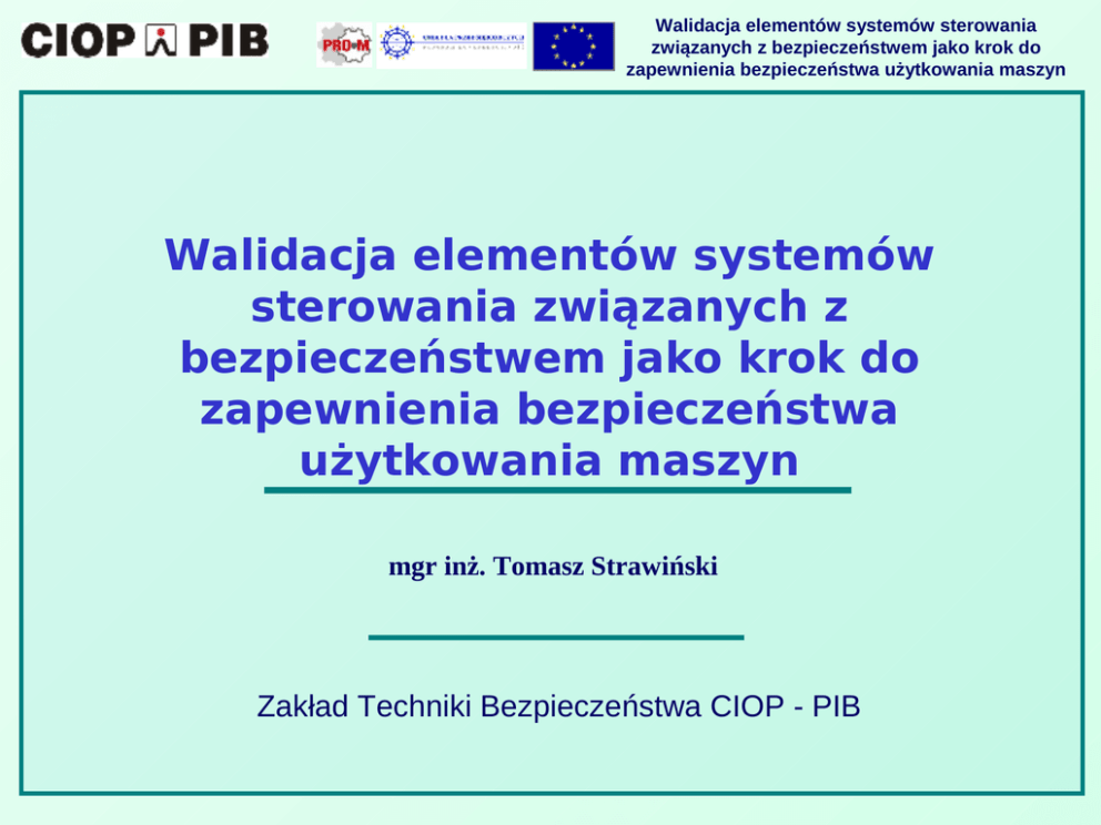 Walidacja elementów systemów sterowania związanych z bezpieczeństwem jako krok do zapewnienia bezpieczeństwa użytkowania maszyn Walidacja elementów systemów sterowania związanych z bezpieczeństwem jako krok do zapewnienia bezpieczeństwa użytkowania maszyn mgr inż. Tomasz Strawiński Zakład Techniki Bezpieczeństwa CIOP - PIB Walidacja elementów systemów sterowania związanych z bezpieczeństwem jako krok do zapewnienia bezpieczeństwa użytkowania maszyn Walidacja Walidacja elementów systemów sterowania maszyn związanych z bezpieczeństwem (ESSZB) jest zespołem działań, które w systematyczny sposób pozwolą zebrać dowody na spełnienie założeń bezpieczeństwa i upewnić wprowadzających maszynę na rynek, że spełniono w tym zakresie wymagania zasadnicze. Walidacja jest obecnie jedyną polecaną metodą potwierdzania wymaganych właściwości ESSZB i dotyczy nawet najprostszych maszyn. Wynika to z faktu, że podstawowe funkcje sterowania maszyn, jakimi są uruchamianie i zatrzymywanie normalne, zostały uznane za funkcje bezpieczeństwa. Walidacja elementów systemów sterowania związanych z bezpieczeństwem jako krok do zapewnienia bezpieczeństwa użytkowania maszyn Normy zawierające wymagania dotyczące walidacji ESSZB PN-EN ISO 13849‑2:2005 Bezpieczeństwo maszyn -- Elementy systemów sterowania związane z bezpieczeństwem -Część 2: Walidacja (cały arkusz normy) PN-EN 62061:2005 Bezpieczeństwo maszyn -Bezpieczeństwo funkcjonalne elektrycznych, elektronicznych i programowalnych elektronicznych systemów sterowania związanych z bezpieczeństwem (oryg.) (rozdział 8) Seria norm PN-EN 61508 Bezpieczeństwo funkcjonalne elektrycznych/elektronicznych/programowalnych systemów związanych z bezpieczeństwem (części 1-7) (walidacja całkowita bezpieczeństwa, walidacja układów E/E/EP, walidacja oprogramowania odpowiednio w częściach 1, 2 i 3) Walidacja elementów systemów sterowania związanych z bezpieczeństwem jako krok do zapewnienia bezpieczeństwa użytkowania maszyn Walidacja – podstawowe wymagania W ramach walidacji należy wykonać analizy i badania funkcji bezpieczeństwa przewidzianych do realizacji w ESSZB projektowanym według racjonalnych przesłanek i zgodnie z normami. Zakres analiz i badań powinien obejmować właściwości charakterystyczne funkcji bezpieczeństwa oraz ich osiągnięte właściwości związane z bezpieczeństwem funkcjonalnym (kategoria, PL, SIL). Walidacja powinna być prowadzona zgodnie z planem z zastosowaniem ogólnego schematu działań. Walidację należy rozpocząć najwcześniej, jak to jest tylko możliwe, i równolegle z procesem projektowania, tak aby problemy mogły być rozwiązane wcześnie, gdy stosunkowo łatwo można je skorygować. Analizy dla potrzeb walidacji należy prowadzić w oparciu o dokumentację zgromadzoną w procesie projektowania. W przypadku systemów dużych ze względu na rozmiar, złożoność lub zintegrowanie systemu sterowania (z maszyną) można prowadzić walidację części ESSZB oddzielnie przed połączeniem, a następnie walidację skutków połączenia tych części między sobą i pozostałą częścią maszyny. Proces walidacji powinien obejmować przeanalizowanie zachowania się ESSZB przy wszystkich defektach, które należy rozważyć. Podstawą do analizy powinny być odpowiednie, wynikające z doświadczenia, wykazy defektów podstawowych i szczególnych. Walidacja elementów systemów sterowania związanych z bezpieczeństwem jako krok do zapewnienia bezpieczeństwa użytkowania maszyn Walidacja – ogólny schemat działań Start Listy defektów Kryteria wykluczenia defektów Ustalenia projektowe Plan walidacji Dokumenty Analiza Zasady walidacji Czy analiza wystarcza? Nie Tak Badania Czy badania wystarczają? Tak Protokół walidacji Koniec Nie Walidacja elementów systemów sterowania związanych z bezpieczeństwem jako krok do zapewnienia bezpieczeństwa użytkowania maszyn Plan walidacji - wymagania W planie walidacji należy zidentyfikować i sformułować wymagania dotyczące przeprowadzenia procesu walidacji określonych funkcji bezpieczeństwa oraz ich kategorii. Należy w nim także zidentyfikować środki, których należy użyć w procesie walidacji wyszczególnionych funkcji bezpieczeństwa i ich właściwości w zakresie bezpieczeństwa funkcjonalnego (kategorii. We właściwych przypadkach należy w nim także określić: • identyfikację dokumentów zawierających warunki techniczne, warunki pracy oraz środowiskowe, • podstawowe zasady bezpieczeństwa, • wypróbowane zasady bezpieczeństwa, • wypróbowane elementy, • założenia dotyczące defektów i wykluczenia defektów, które należy rozpatrzyć, • analizy i badania, które należy zastosować. Walidacja elementów systemów sterowania związanych z bezpieczeństwem jako krok do zapewnienia bezpieczeństwa użytkowania maszyn Metodyka prowadzenia projektowania i walidacji ESSZB maszyn (1) • • • • • Projekt ESSZB maszyny składa się z pewnej liczby projektów umownie określonych funkcji bezpieczeństwa. Projekt umownie określonej funkcji bezpieczeństwa obejmuje jedną lub więcej rzeczywistych funkcji bezpieczeństwa realizowanych w jednym połączonym procesie projektowania i następnie walidacji. W przypadku dużych złożonych systemów umownie określona funkcja bezpieczeństwa może określać rzeczywistą funkcję bezpieczeństwa, do której realizacji wykorzystano podzespoły i wyniki uzyskane w procesie projektowania i walidacji innych umownych funkcji bezpieczeństwa (w ramach których powstały użyte podzespoły). Proces projektowania umownie określonej funkcji bezpieczeństwa należy podzielić na etapy. Liczba etapów projektowania i zakres prac projektowych wchodzących do etapu jest dowolny (powinno to wynikać z przyjętych zasad realizacji projektów i być dostosowane do właściwości i wymagań związanych z realizowanym układem). Walidac