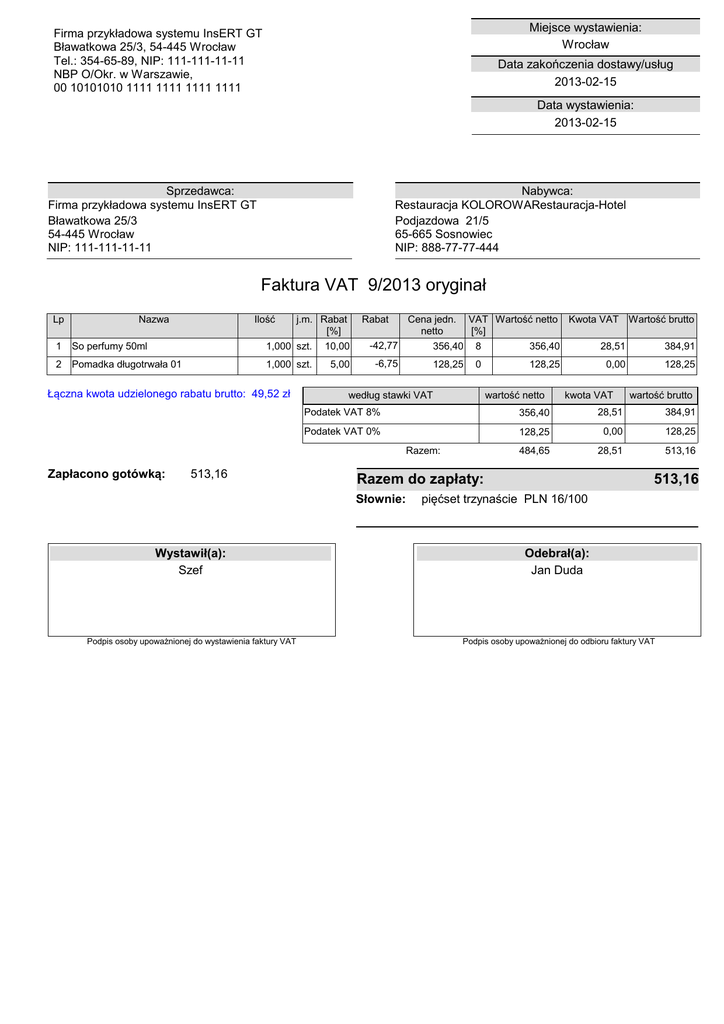 Miejsce wystawienia: Wrocław Firma przykładowa systemu InsERT GT Bławatkowa 25/3, 54-445 Wrocław Tel.: 354-65-89, NIP: 111-111-11-11 NBP O/Okr. w Warszawie, 00 10101010 1111 1111 1111 1111 Data zakończenia dostawy/usług 2013-02-15 Data wystawienia: 2013-02-15 Sprzedawca: Firma przykładowa systemu InsERT GT Bławatkowa 25/3 54-445 Wrocław NIP: 111-111-11-11 Nabywca: Restauracja KOLOROWARestauracja-Hotel Podjazdowa 21/5 65-665 Sosnowiec NIP: 888-77-77-444 Faktura VAT 9/2013 oryginał Lp Nazwa Ilość j.m. Rabat [%] Rabat Cena jedn. netto VAT Wartość netto [%] Kwota VAT Wartość brutto 1 So perfumy 50ml 1,000 szt. 10,00 -42,77 356,40 8 356,40 28,51 384,91 2 Pomadka długotrwała 01 1,000 szt. 5,00 -6,75 128,25 0 128,25 0,00 128,25 Łączna kwota udzielonego rabatu brutto: 49,52 zł według stawki VAT wartość netto 513,16 wartość brutto 356,40 28,51 384,91 Podatek VAT 0% 128,25 0,00 128,25 484,65 28,51 513,16 Razem: Zapłacono gotówką: kwota VAT Podatek VAT 8% Razem do zapłaty: Słownie: 513,16 pięćset trzynaście PLN 16/100 Wystawił(a): Szef Odebrał(a): Jan Duda Podpis osoby upoważnionej do wystawienia faktury VAT Podpis osoby upoważnionej do odbioru faktury VAT
