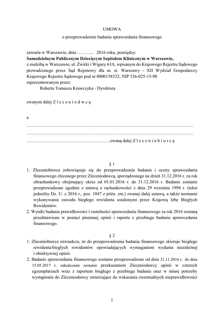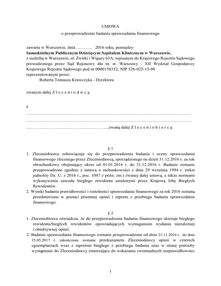 UMOWA o przeprowadzenie badania sprawozdania finansowego zawarta w Warszawie, dnia ……….. 2016 roku, pomiędzy: Samodzielnym Publicznym Dziecięcym Szpitalem Klinicznym w Warszawie, z siedzibą w Warszawie, ul. Żwirki i Wigury 63A, wpisanym do Krajowego Rejestru Sądowego prowadzonego przez Sąd Rejonowy dla m. st. Warszawy - XII Wydział Gospodarczy Krajowego Rejestru Sądowego pod nr 0000158332; NIP 526-025-15-98 reprezentowanym przez: Roberta Tomasza Krawczyka - Dyrektora zwanym dalej Z l e c e n i o d w c ą a ………………………………………………………………………………………………… ………………………………………………………………………………………………… ………………………………………………..zwaną dalej Z l e c e n i o b i o r c ą §1 1. Zleceniobiorca zobowiązuje się do przeprowadzenia badania i oceny sprawozdania finansowego zleconego przez Zleceniodawcą, sporządzonego na dzień 31.12.2016 r. za rok obrachunkowy obejmujący okres od 01.01.2016 r. do 31.12.2016 r. Badanie zostanie przeprowadzone zgodnie z ustawą o rachunkowości z dnia 29 września 1994 r. (tekst jednolity Dz. U. z 2016 r., poz. 1047 z późn. zm.) zwanej dalej ustawą, a także normami wykonywania zawodu biegłego rewidenta ustalonymi przez Krajową Izbę Biegłych Rewidentów. 2. Wyniki badania prawidłowości i rzetelności sprawozdania finansowego za rok 2016 zostaną przedstawione w postaci pisemnej opinii i raportu z przebiegu badania sprawozdania finansowego. §2 1. Zleceniobiorca oświadcza, że do przeprowadzenia badania finansowego skieruje biegłego rewidenta/biegłych rewidentów opowiadających wymaganiom wydania niezależnej i obiektywnej opinii. 2. Badanie sprawozdania finansowego zostanie przeprowadzone od dnia 21.11.2016 r. do dnia 15.05.2017 r. zakończone zostanie przekazaniem Zleceniodawcy opinii w czterech egzemplarzach wraz z raportem biegłego z przebiegu badania oraz w miarę potrzeby wystąpienie do Zleceniodawcy zmierzające do wskazania ewentualnych nieprawidłowości 1 lub zaniedbań, których usunięcie jest konieczne, a ujawnienie w raporcie i opinii nie byłoby wskazane. 3. Opinia i raport, o których mowa w ust. 2 będą w szczególności zawierać stwierdzenia wymagane przepisami art. 65 wyżej powołanej ustawy o rachunkowości. §3 1. Badanie sprawozdania finansowego zostanie przez Zleceniobiorcę przeprowadzone na tak dobranych próbach operacji gospodarczych, wynikających z ksiąg rachunkowych i dowodów księgowych, aby dokumentacja rewizyjna z badania stanowiła wystarczającą podstawę do sformułowania opinii o badanym sprawozdaniu finansowym. 2. Przegląd funkcjonowania u Zleceniodawcy systemów: rachunkowości, organizacyjnego i kontroli wewnętrznej oraz identyfikacja podmiotu badanego poprzedzi dobór operacji gospodarczych z ksiąg rachunkowych i dowodów księgowych do badania. §4 1. W razie wydania opinii zawierającej istotne zastrzeżenia co do prawidłowości, kompletności lub rzetelności sprawozdania finansowego albo wydania opinii negatywnej, Zleceniodawca otrzyma pisemne uzasadnienie tej opinii. 2. W przypadku zrzeczenia się wyrażenia opinii o sprawozdaniu finansowym na skutek np. ograniczenia zakresu lub metody badań, powody zostaną przedstawione niezwłocznie Zleceniodawcy. §5 1. Zleceniobiorca zobowiązuje się do zakończenia badania sprawozdania finansowego w określonym § 2 ust. 2 terminie, pod warunkiem udostępnienia przez Zleceniodawcę do badania ksiąg rachunkowych i dowodów księgowych oraz niezbędnych danych oraz innych informacji, o których mowa w art. 67 ust. 1-4 i art. 67a ustawy z dnia 29 września 1994 r. o rachunkowości maksymalnie do dnia 15.04.2017 r. 2. W przypadku nie dotrzymania przez Zleceniodawcę warunku ustalonego w ust. 1 okres badania sprawozdania finansowego przez Zleceniobiorcę, zostanie ponownie ustalony przez strony niniejszej umowy, z uwzględnieniem możliwości wywiązania się przez podmiot badany z obowiązków ustawowych, związanych z procedurą zatwierdzenia sprawozdania finansowego. §6 1. Zleceniodawca zlecając badanie sprawozdania finansowego zobowiązuje się do udostępnienia Zleceniobiorcy mającemu przeprowadzić badanie sprawozdania finansowego, oraz wskazanym przez niego innym bezpośrednim wykonawcom umowy, zatrudnionym do badania przez Zleceniobiorcę wymaganych dokumentów i wyjaśnień: 1) założycielskich i organizacyjnych podmiotu badanego, 2) dotyczących regulaminów pracy organów statutowych, zasad funkcjonowania systemu kontroli wewnętrznej, rachunkowości (w tym zakładowego planu kont), 3) poręczeń i innych dokumentów, 4) ksiąg rachunkowych i dowodów księgowych będących podstawą sporządzenia sprawozdania finansowego, 2 5) sprawozdania finansowego obejmującego: bilans, rachunek zysków i strat, informację dodatkową według wzoru ustalonego przez podmiot badany na podstawie przepisów ustawy z dnia 29 września 1994 r. o rachunkowości, 6) innych dokumentów mających związek z przedmiotem niniejszej umowy wymaganych przez w/w ustawę, 7) udzielania wyczerpujących informacji i wyjaśnień niezbędnych do opracowania opinii i raportu, 8) przekazania Zleceniobiorcy harmonogramu prac związanych ze sporządzeniem sprawozdania finansowego, 9) składania przedstawicielom Zleceniobiorcy pisemnych oświadczeń dotyczących w szczególności: a) uznania przez Dyrekcję Zleceniodawcy odpowiedzialności za prawidłowość, kompletność i rzetelność sprawozdania finansowego i innych sprawozdań podlegających badaniu, b) stwierdzenia, że według wiedzy Zleceniodawcy, sprawozdanie finansowe, o którym zostanie wydana opinia jest wolne od istotnych błędów i przeoczeń, c) potwierdzenia kompletności udostępnionych przedstawicielom Zleceniobiorcy ksiąg rachunkowych i sprawozdania finansowego. 2. Zleceniodawca zobowiązuje się do złożenia oświadczeń o: 1) przestrz