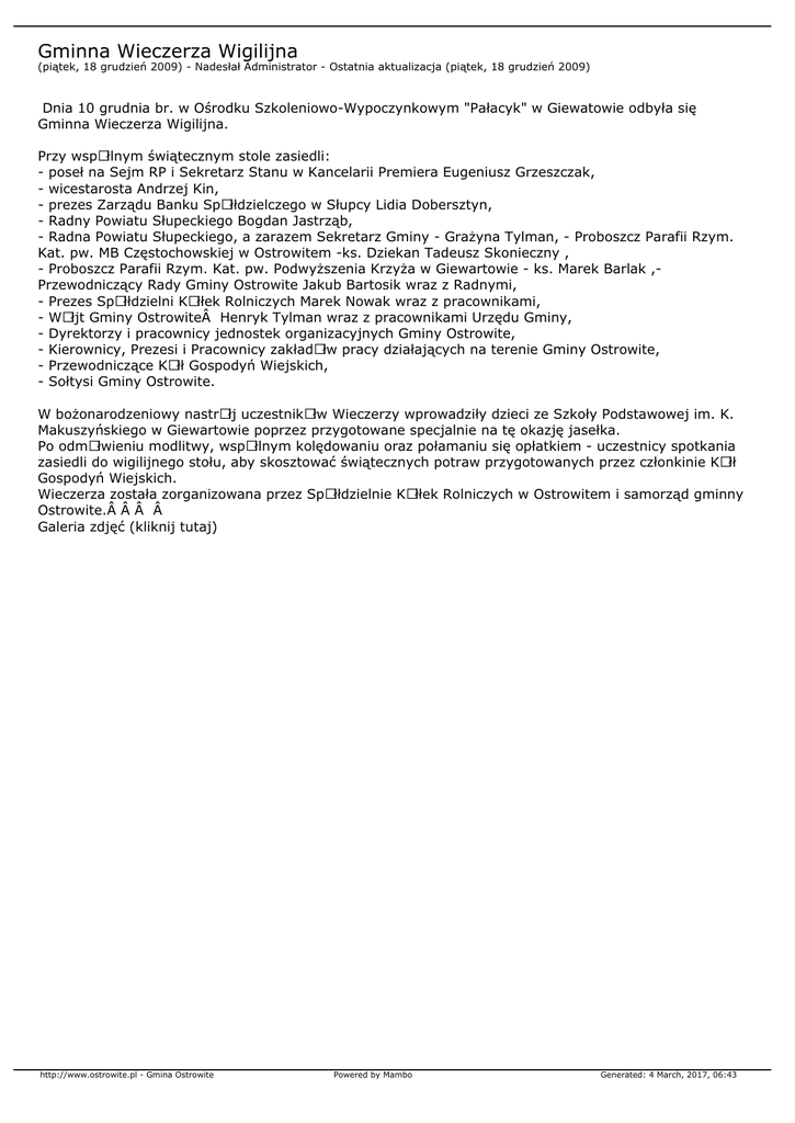 Gminna Wieczerza Wigilijna (piątek, 18 grudzień 2009) - Nadesłał Administrator - Ostatnia aktualizacja (piątek, 18 grudzień 2009) Dnia 10 grudnia br. w Ośrodku Szkoleniowo-Wypoczynkowym "Pałacyk" w Giewatowie odbyła się Gminna Wieczerza Wigilijna. Przy wspÃłlnym świątecznym stole zasiedli: - poseł na Sejm RP i Sekretarz Stanu w Kancelarii Premiera Eugeniusz Grzeszczak, - wicestarosta Andrzej Kin, - prezes Zarządu Banku SpÃłłdzielczego w Słupcy Lidia Dobersztyn, - Radny Powiatu Słupeckiego Bogdan Jastrząb, - Radna Powiatu Słupeckiego, a zarazem Sekretarz Gminy - Grażyna Tylman, - Proboszcz Parafii Rzym. Kat. pw. MB Częstochowskiej w Ostrowitem -ks. Dziekan Tadeusz Skonieczny , - Proboszcz Parafii Rzym. Kat. pw. Podwyższenia Krzyża w Giewartowie - ks. Marek Barlak ,Przewodniczący Rady Gminy Ostrowite Jakub Bartosik wraz z Radnymi, - Prezes SpÃłłdzielni KÃłłek Rolniczych Marek Nowak wraz z pracownikami, - WÃłjt Gminy Ostrowite Henryk Tylman wraz z pracownikami Urzędu Gminy, - Dyrektorzy i pracownicy jednostek organizacyjnych Gminy Ostrowite, - Kierownicy, Prezesi i Pracownicy zakładÃłw pracy działających na terenie Gminy Ostrowite, - Przewodniczące KÃłł Gospodyń Wiejskich, - Sołtysi Gminy Ostrowite. W bożonarodzeniowy nastrÃłj uczestnikÃłw Wieczerzy wprowadziły dzieci ze Szkoły Podstawowej im. K. Makuszyńskiego w Giewartowie poprzez przygotowane specjalnie na tę okazję jasełka. Po odmÃłwieniu modlitwy, wspÃłlnym kolędowaniu oraz połamaniu się opłatkiem - uczestnicy spotkania zasiedli do wigilijnego stołu, aby skosztować świątecznych potraw przygotowanych przez członkinie KÃłł Gospodyń Wiejskich. Wieczerza została zorganizowana przez SpÃłłdzielnie KÃłłek Rolniczych w Ostrowitem i samorząd gminny Ostrowite.    Galeria zdjęć (kliknij tutaj) http://www.ostrowite.pl - Gmina Ostrowite Powered by Mambo Generated: 4 March, 2017, 06:43