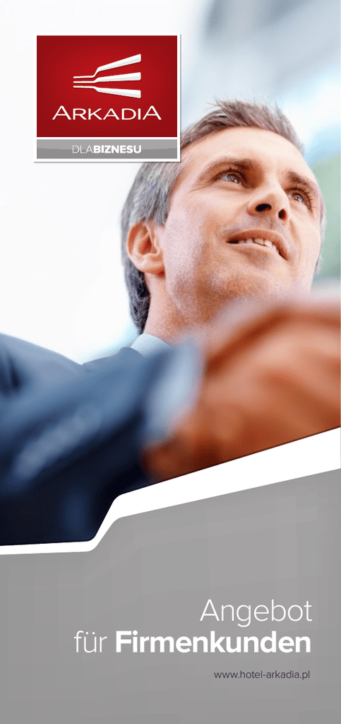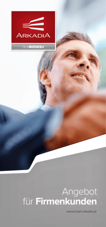 Angebot für Firmenkunden www.hotel-arkadia.pl Hotel & Restaurant Arkadia 59-220 Legnica, ul. Gliwicka 6 Recepcja-Hotel: tel. +48 76 8507 800 fax +48 76 8507 802 [email protected] [email protected] www.hotel-arkadia.pl Konferenzen Das Hotel bietet unseren Firmenkunden bis zu 200 Übernachtungsmöglichkeiten in geschmackvoll eingerichteten Einzelzimmern, Doppelzimmern und Apartments. Die Europäische Küche zusammen mit dem professionellen und herzlichen Service gibt Ihnen einen Eindruck der Polnischen Gastfreundschaft. In unseren voll ausgestatteten und klimatisierten Räumen organisieren wir: v Konferenzen v Symposien v Schulungen Zusätzlich bieten wir: v Leinwand, Projektoren, DVD, Verdunkelung, Flipchart v Wireless Internet v Multimedia Projektoren v Kaffee Pausen, Lunch, Abendessen Anzahl Plätze bei folgender Anordnung: Saal Theater Bankett, Konferenz Schulung Konferenzraum „Selena” 21 m2 12 15 15 Konferenzraum „Metis” 45 m2 32 22 24 Konferenzraum „Hemera” 54 m2 50 35 30 Konferenzraum „Atena” 75 m2 80 60 60 40 30 20 Club Saal „Klubowa” 51 + 51 m 50 40 40 Skylight Saal „Świetlik” 170 m2 120 84 100 Ballsaal „Balowa” 345 m2 350 180 200 Bankett Saal VIP „VIP” 46 m2 2