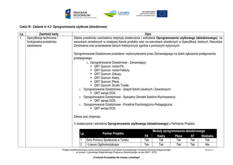 Cześć III - Zadanie nr 4.2: Oprogramowanie użytkowe (dziedzinowe) Lp. Zwartość karty 1 Specyfikacja techniczna / funkcjonalna przedmiotu zamówienia Opis Zakres przedmiotu zamówienia obejmuje dostarczenie i wdrożenie Oprogramowania użytkowego (dziedzinowego) na warunkach określonych w niniejszej Karcie produktu oraz na warunkach określonych w Specyfikacji Istotnych Warunków Zamówienia oraz przeniesienie danych historycznych zgodnie z poniższymi wytycznymi. Oprogramowanie Dziedzinowe posiadane i wykorzystywane przez Zamawiającego na dzień ogłoszenia postępowania przetargowego: o Oprogramowanie Dziedzinowe - Zamawiający: QNT Quorum: moduł FK, QNT Quorum: moduł Faktury, QNT Quorum: Zakupy, QNT Quorum: Kadry, QNT Quorum: Płace, QNT Quorum: Środki Trwałe. o Oprogramowanie Dziedzinowe - Zespół Szkół Licealnych i Zawodowych: QNT wersja DOS, o Oprogramowanie Dziedzinowe - Specjalny Ośrodek Szkolno-Wychowawczy: QNT wersja DOS, o Oprogramowanie Dziedzinowe - Poradnia Psychologiczno-Pedagogiczna: QNT wersja DOS. Zakres prac obejmuje: 1) dostarczenie i wdrożenie Oprogramowania użytkowego (dziedzinowego) u Partnerów Projektu: Lp. 1 2 Partner Projektu Dom Pomocy Społecznej w Tursku I Liceum Ogólnokształcące Moduły oprogramowania dziedzinowego FK Tak Tak Kadry Tak Tak Projekt współfinansowany przez Unię Europejską ze środków Europejskiego Funduszu Rozwoju Regionalnego w ramach Lubuskiego Regionalnego Programu Operacyjnego na lata 2007 – 2013 „Fundusze Europejskie dla rozwoju Lubuskiego” Płace Tak Tak ST Tak Tak Stołówka Tak Nie Strona: 1 3 4 5 6 7 Zespół Szkół Licealnych i Zawodowych Specjalny Ośrodek Szkolno-Wychowawczy Powiatowe Centrum Pomocy Rodzinie Poradnia Psychologiczno-Pedagogiczna Dom Dziecka w Sulęcinie Tak Tak Tak Tak Tak Tak Tak Tak Tak Tak Tak Tak Tak Tak Tak Tak Tak Tak Tak Tak Nie Nie Nie Nie Nie 2) przeniesienie danych historycznych u Partnerów Projektu do wdrażanego Oprogramowania użytkowego (dziedzinowego): Lp. 1 2 3 4 5 6 7 Partner Projektu Dom Pomocy Społecznej w Tursku I Liceum Ogólnokształcące Zespół Szkół Licealnych i Zawodowych Specjalny Ośrodek Szkolno-Wychowawczy Powiatowe Centrum Pomocy Rodzinie Poradnia Psychologiczno-Pedagogiczna Dom Dziecka w Sulęcinie Moduły oprogramowania dziedzinowego FK Nie Nie Tak Tak Nie Tak Nie Kadry Nie Nie Nie Nie Nie Nie Nie Płace Nie Nie Nie Tak Nie Tak Nie ST Nie Nie Nie Nie Nie Nie Nie Stołówka Nie Nie Nie Nie Nie Nie Nie Oprogramowanie użytkowe (dziedzinowe) oczekiwane przez Zamawiającego: QNT Quorum – lub równoważne. Zamawiający dopuszcza zaproponowanie oprogramowania równoważnego - za oprogramowanie równoważne Zamawiający uznaje Oprogramowanie posiadające tożsamą funkcjonalność, co wskazane w opisie przedmiotu zamówienia (Zadanie nr 4.2: Oprogramowanie użytkowe (dziedzinowe)) oraz możliwość pełnej integracji i współpracy z Oprogramowaniem dostarczanym w ramach realizacji Projektu jak również z Oprogramowaniem Dziedzinowym posiadanym i wykorzystywanym przez Zamawiającego. Projekt współfinansowany przez Unię Europejską ze środków Europejskiego Funduszu Rozwoju Regionalnego w ramach Lubuskiego Regionalnego Programu Operacyjnego na lata 2007 – 2013 „Fundusze Europejskie dla rozwoju Lubuskiego” Strona: 2 Zamawiający zastrzega sobie prawo do testów Oprogramowania równoważnego przed zawarciem Umowy. Oprogramowanie użytkowe (dziedzinowe) musi spełniać następujące wymagania minimalne: Moduł FK (finansowo – księgowy): o Konieczność posiadania funkcjonalności umożliwiającej rozliczanie budżetu zadaniowego oraz wspomaganie procesu projektowania tego budżetu. o Ewidencja zdarzeń gospodarczych z uwzględnieniem klasyfikacji budżetowej. o Podgląd obrotów i zapisów w działach, rozdziałach i paragrafach z podziałem na struktury przychodowe i rozchodowe, kosztowe i wydatkowe źródła finansowania, możliwość podglądu dokumentów źródłowych wraz ze śledzeniem rozliczenia umów, z których wynikają. o Możliwość tworzenia standardowego układu typów dokumentów, np. Polecenia księgowania, Faktura, Noty księgowe, Plan wydatków, Zmiana planu, Wyciągi bankowe, Zaangażowanie. o Możliwość prowadzenia dzienników częściowych. o Automatyczna numeracja kolejności poszczególnych typów dokumentów, widoczne kwoty podsumowań obrotów w dokumencie i w syntetykach. o Możliwość wprowadzenia własnych nazw typów dokumentów. o Kontrolowanie na bieżąco poprawności wprowadzonych dekretów i wykonanych księgowań poprzez kontrolę bilansowania się pozycji i dokumentu oraz zgodności kont przeciwstawnych. o Ułatwienie wprowadzania danych poprzez słowniki, podpowiedzi, listy wyboru, autouzupełnianie danych. o Możliwość wyszukiwania dokumentów według wybranych kryteriów, np. zakresu dat, typu dokumentów, numeru konta na wybranym poziomie analityki, identyfikatora, kwoty, numeru kontrahenta, numeru NIP, działania budżetowego, paragrafu, itp. o Możliwość tworzenia przelewów zarówno wprowadzonych ręcznie jak i elektronicznie, na podstawie wprowadzonych dokumentów księgowych. o Bieżące określanie stanu rozrachunków z kontrahentami tj. stanu należności i zobowiązań niezależnie od zamknięcia okresu sprawozdawczego. o Automatyczne rozliczanie rozrachunków oraz możliwość operacji powtórnej (rozdzielenie scalonego rozrachunku) odnosząc je do zaangażowania z umów w podziale na poszczególne paragrafy. o Bieżące informacje o zobowiązaniach i należnościach w żądanych przekrojach: wg okresów sprawozdawczych, narastająco, za miesiąc, Projekt współfinansowany przez Unię Europejską ze środków Europejskiego Funduszu Rozwoju Regionalnego w ramach Lubuskiego Regionalnego Programu Operacyjnego na lata 2007 – 2013 „Fundusze Europejskie dla rozwoju Lubuskiego” Strona: 3 wg kontrahentów, wg wybranej analityki prowadzonej na rozrachunku (klasyfikacja budżetu tradycyjne