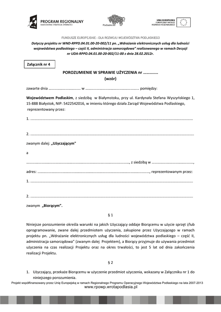 Dotyczy projektu nr WND-RPPD.04.01.00-20-002/11 pn. „Wdrażanie elektronicznych usług dla ludności województwa podlaskiego – część II, administracja samorządowa” realizowanego w ramach Decyzji nr UDA-RPPD.04.01.00-20-002/11-00 z dnia 28.02.2012r. Załącznik nr 4 POROZUMIENIE W SPRAWIE UŻYCZENIA nr ………..… (wzór) zawarte dnia ……………………………. w ………………………………………………... pomiędzy: Województwem Podlaskim, z siedzibą w Białymstoku, przy ul. Kardynała Stefana Wyszyńskiego 1, 15-888 Białystok, NIP: 5422542016, w imieniu którego działa Zarząd Województwa Podlaskiego, reprezentowany przez: 1. .............................................................................................................................................................. 2. ............................................................................................................................................................... zwanym dalej: „Użyczającym" a ……….………………………………………………………………..………….…………, z siedzibą w …………….…………………….…, adres: …………………………………………………………………………………………………..……, reprezentowanym przez: 1. .............................................................................................................................................................. 2. .............................................................................................................................................................. zwanym „Biorącym”. §1 Niniejsze porozumienie określa warunki na jakich Użyczający oddaje Biorącemu w użycie sprzęt i/lub oprogramowanie, zwane dalej przedmiotem użyczenia, zakupione przez Użyczającego w ramach projektu pn. „Wdrażanie elektronicznych usług dla ludności województwa podlaskiego – część II, administracja samorządowa” (zwanym dalej Projektem), a Biorący przyjmuje do używania przedmiot użyczenia na czas realizacji Projektu oraz na okres trwałości, to jest 5 lat od dnia zakończenia realizacji Projektu. §2 1. Użyczający, przekaże Biorącemu w użyczenie przedmiot użyczenia, wskazany w Załączniku nr 1 do niniejszego porozumienia. Projekt współfinansowany przez Unię Europejską w ramach Regionalnego Programu Operacyjnego Województwa Podlaskiego na lata 2007-2013 2. Przekazanie w użyczenie odbędzie się na podstawie protokołu/protokołów, szczegółowo opisujących jakościowo i ilościowo przekazywany sprzęt i/lub oprogramowanie. 3. Dostarczanie przedmiotu użyczenia będzie następować sukcesywnie w trakcie realizacji Projektu, o którym mowa w § 1. 4. Informacje o terminie dostarczenia przedmiotu użyczenia zostaną Biorącemu przekazane przez Użyczającego lub Wykonawców Projektu. 5. Upoważnia się Dyrektora Departamentu Społeczeństwa Informacyjnego do podpisywania protokołów użyczenia ze strony Użyczającego. §3 1. Przekazany przedmiot użyczenia będzie przez Biorącego wykorzystywany do realizacji celów projektu „Wdrażanie elektronicznych usług dla ludności województwa podlaskiego – część II, administracja samorządowa” tj. do: 1) usprawnienia wymiany informacji z mieszkańcami województwa na wszystkich poziomach samorządowych, poprzez zastosowanie usług elektronicznych, 2) rozwijania i usług dla obywateli dostępnych za pomocą technik informatycznych, 3) wywiązania się z ustawy o informatyzacji działalności podmiotów realizujących zadania publiczne, w myśl obowiązującego prawa, 4) integracji z Platformą Usług Administracji Publicznej ePUAP, 5) poprawy rozwoju technologicznego regionu, poprzez zastosowanie nowoczesnych rozwiązań ICT na Platformie Wrota Podlasia. 2. Biorący zobowiązuje się, że będzie używał przedmiotu użyczenia w sposób odpowiadający ich właściwościom, zgodnie z ich przeznaczeniem i wymogami technicznymi oraz do utrzymania ich w należytym stanie. 3. Biorący zobowiązuje się, że będzie korzystał z zainstalowanego oprogramowania zgodnie z obowiązującymi przepisami prawa, w szczególności nie będzie instalował i używał nielegalnego oprogramowania na użyczonym sprzęcie komputerowym oraz nie będzie rozpowszechniał, utrwalał, uzyskiwał lub zwielokrotniał otrzymanego oprogramowania w sposób sprzeczny z udzielonymi licencjami i z powszechnie obowiązującymi przepisami prawa. 4. Biorący zobowiązuje się do zachowania na przekazanym przedmiocie użyczenia wszelkiego rodzaju oznaczeń informujących o współfinansowaniu przedmiotu użyczenia przez Unię Europejską w ramach Regionalnego Programu Operacyjnego Województwa Podlaskiego na lata 2007-2013. 5. Biorący nie może oddać osobie trzeciej rzeczy użyczonej bez pisemnej zgody Użyczającego. Strona 2 §4 1. Użyczający zastrzega sobie prawo kontrolowania stanu oraz sposobu wykorzystywania przedmiotu użyczenia. 2. W przypadku kontroli Projektu przez podmioty uprawnione, przekazany przedmiot użyczenia udostępniany będzie przez Biorącego osobom kontrolującym. §5 Biorący ponosi zwykłe koszty utrzymania i ubezpieczenia przedmiotu użyczenia oraz zobowiązuje się do zabezpieczenia sprzętu przed kradzieżą, uszkodzeniem lub zniszczeniem. §6 1. W przypadku zidentyfikowania przez Biorącego wady w przedmiocie użyczenia, Biorący zgłosi niezwłocznie ten fakt Użyczającemu. 2. Biorący udostępni przedmiot użyczenia, co do którego zidentyfikowano wadę, Wykonawcy celem wykonywania przez niego obowiązków gwarancyjnych, w szczególności diagnozy i odpowiednich napraw, informując Użyczającego o terminie, przebiegu i wyniku realizacji przez Wykonawcę obowiązków gwarancyjnych. 3. W przypadkach, gdy naprawa nie będzie objęta gwarancją, koszty naprawy ponosi Biorący. 4. Biorący ponosi pełne koszty napraw pogwarancyjnych u