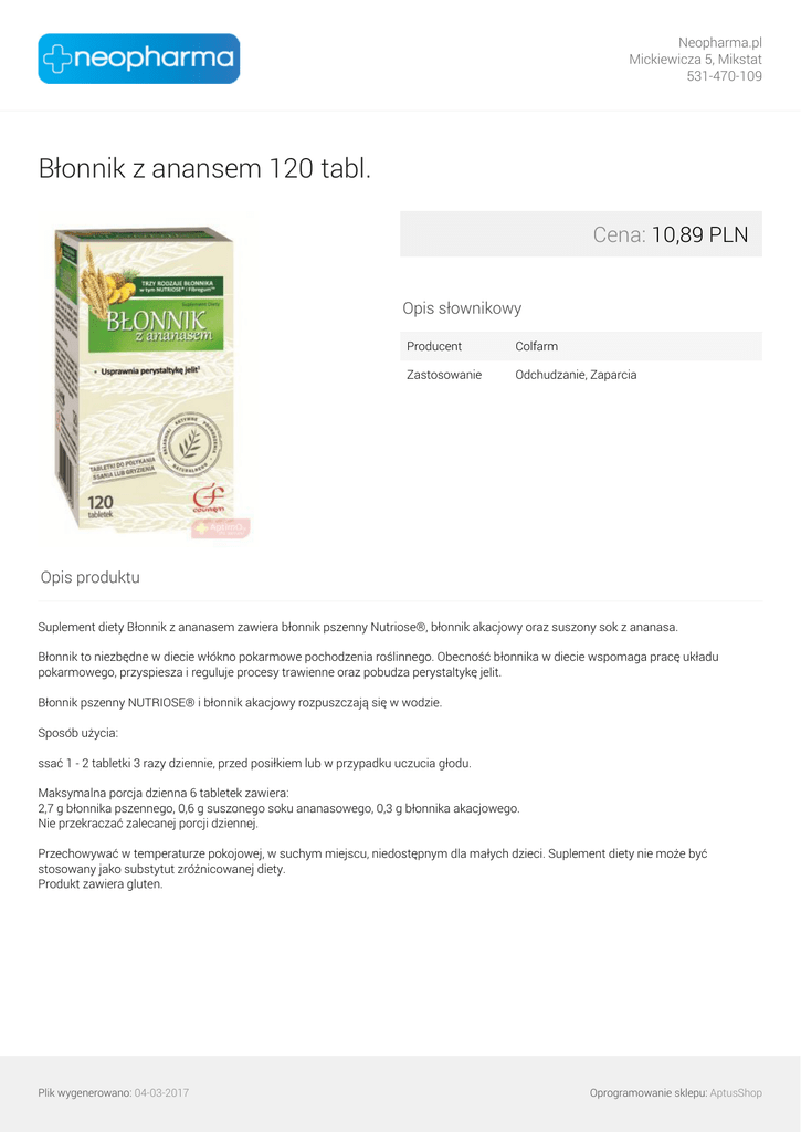 Neopharma.pl Mickiewicza 5, Mikstat 531-470-109 Błonnik z anansem 120 tabl. Cena: 10,89 PLN Opis słownikowy Producent Colfarm Zastosowanie Odchudzanie, Zaparcia Opis produktu Suplement diety Błonnik z ananasem zawiera błonnik pszenny Nutriose®, błonnik akacjowy oraz suszony sok z ananasa. Błonnik to niezbędne w diecie włókno pokarmowe pochodzenia roślinnego. Obecność błonnika w diecie wspomaga pracę układu pokarmowego, przyspiesza i reguluje procesy trawienne oraz pobudza perystaltykę jelit. Błonnik pszenny NUTRIOSE® i błonnik akacjowy rozpuszczają się w wodzie. Sposób użycia: ssać 1 - 2 tabletki 3 razy dziennie, przed posiłkiem lub w przypadku uczucia głodu. Maksymalna porcja dzienna 6 tabletek zawiera: 2,7 g błonnika pszennego, 0,6 g suszonego soku ananasowego, 0,3 g błonnika akacjowego. Nie przekraczać zalecanej porcji dziennej. Przechowywać w temperaturze pokojowej, w suchym miejscu, niedostępnym dla małych dzieci. Suplement diety nie może być stosowany jako substytut zróżnicowanej diety. Produkt zawiera gluten. Plik wygenerowano: 04-03-2017 Powered by TCPDF (www.tcpdf.org) Oprogramowanie sklepu: AptusShop