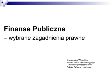 Finanse Publiczne – wybrane zagadnienia prawne dr Jarosław Wierzbicki Katedra Prawa Administracyjnego i Finansowego Przedsiębiorstw Szkoła Główna Handlowa Literatura przedmiotu Podstawowa: System prawa finansowego t I-IV, praca zbiorowa, Oficyna a Wolters Kluwer business, Warszwa 2010 r. Dzwonkowski H., Gołębiowski G., Ustawa o finansach publicznych; Komentarz prawno-finansowy, Wydawnictwo Sejmowe, Warszawa 2014 r. Fojcik-Mastalska E., Mastalski R., Prawo finansowe, Wolters Kluwer, Warszawa 2013 r. Mikos-Sitek A., Zapadka P., Prawo Finansów Publicznych, wyd.3, C.H.Beck Warszawa 2014 r. Uzupełniająca: Buchanan James M., Finanse publiczne w warunkach demokracji: systemy fiskalne decyzje indywidualne, PWN, Warszawa 1997 r. Gaudemet Paul M., Molinier Joel, Finanse publiczne, PWE, Warszawa 2000 r. Musgrave R, Musgrave P, Public Finance in theory and practice, McGraw-Hill, 1989 r. Osiatyński Jerzy, Finanse publiczne ekonomia i polityka, PWN Warszawa 2006 r. Owsiak Stanisław, Finanse publiczne teoria i praktyka, Wydawnictwo Naukowe PWN, Warszawa 2008 r. Rosen Harvey S., Public Finance, McGrawHill, 7th ed. 2005 r. Stiglitz Joseph E., Ekonomia sektora publicznego, PWN, Warszawa 2004 r. System finansów publicznych Całokształt zjawisk oraz procesów związanych z powstawaniem i rozdysponowywaniem pieniężnych środków publicznych zapewniających funkcjonowanie sektora publicznego (Owsiak); zjawiska pieniężne; dysponent / właściciel – podmiot publiczny; formy nabycia; zarządzania; wydatkowania. Zakres prawa finansów publicznych Prawo waluty; Prawo dewizowe; Prawo dochodów publicznych; Formy prawne jednostek sektora finansów publicznych; Dług publiczny i zasady finansowania długiem; Prawo budżetowe i planowanie wieloletnie; Wydatki publiczne i ich racjonalizacja; Sprawozdawczość, nadzór, kontrola i audyt w finansach publicznych; Odpowiedzialność w prawie finansowym; Specyfika sektora ubezpieczeń społecznych; Pozyskiwanie i wykorzystanie środków zagranicznych pomocowych; Prawo finansów samorządu terytorialnego. Samodzielność prawa finansowego Prawo finansowe a prawa administracyjne; Źródła prawa finansowego Metoda regulacji; Normy prawa finansowego; Zasady interpretacji. Źródła prawa finansowego Ustrojowe zasady regulacji prawno-finansowej; Regulacje dochodów publicznych – samodzielność prawa podatkowego; Zasady zarządzania finansami – gospodarka budżetowa; Regulacje sfery wydatkowej; Zasady kontroli i nadzoru; Źródła kompetencji samorządu terytorialnego w finansach publicznych. System źródeł prawa w Polsce I Źródła prawa RP Źródła prawa UE Konstytucja; Umowy międzynarodowe Prawo pierwotne ratyfikowane za uprzednią („konstytucyjne”), traktaty zgodą wyrażoną w ustawie; wspólnotowe; Prawo organizacji m Prawo wtórne: narodowych na które RP Rozporządzenia; przeniosła wykonywanie części uprawnień suwerennych; Dyrektywy; Decyzje; Ustawy; Zalecenia i Opinie. Ratyfikowane umowy międzynarodowe; Rozporządzenia; Lokalne System prawa w Polsce II Zasada numerus clausus źródeł prawa powszechnie obowiązującego; Hierarchia źródeł prawa stanowionego; Kolizje systemowe źródeł prawa (supremacja Konstytucji vs. supremacja prawa wspólnotowego); Przepis prawny a norma prawna Przepis – zdanie w sensie gramatycznym, wyodrębnione w tekście prawnym i oznaczone jako odrębna jednostka układu tekstu normatywnego; Norma prawna – dyrektywa postępowania ustanowiona przez kompetentne organy władzy publicznej. Konstrukcja normy prawnej Koncepcja normy trójczłonowej: Hipoteza; Dyspozycja; Sankcja. Koncepcja norm sprzężonych: Norma sankcjonowana, Norma sankcjonująca. Obowiązywanie norm prawnych Ujęcie aksjologiczne zachowanie aprobowane w świetle wyznawanych wartości; Ujęcie tetyczne oparcie na przymusie posiadanej władzy; Ujęcie behawioralne występowanie adresatów. w faktycznym zachowaniu Przepływy w finansach publicznych Mechanizm transferu bogactwa; Przejęcie wartości od sektora prywatnego; Rozdysponowanie pomiędzy agendami podmiotów publicznych; Wydatkowanie na cele społecznie pożądane i dobra publiczne; Majątkowe przesunięcia (transfery). Zjawiska gospodarcze związane z finansami publicznymi Decyzje alokacyjne: Co do rodzajów dochodów i wydatków (finansowania dóbr społecznie pożądanych i publicznych); Czasu (moment konsumpcji i termin / charakter płatności); Zakresu władzy publicznej (dominacja egzekutywy nad legislatywą bądź odwrotnie). Prawo walutowe i dewizowe Pieniądz - pojęcie centralne Cechy / funkcje ekonomiczne: środek płatności; miernik wartości; środek akumulacji. Prawnie: prawny środek płatniczy (zwalniający ze zobowiązań pieniężnych) w obrocie towarowo-pieniężnym; środek zapłaty danin publicznych. Bank centralny i jego zadania Bank emisyjny; Bank banków; Bank państwa. Monopol na prowadzenie polityki pieniężnej (decydowanie o wartości pieniądza polskiego); Funkcje wykonawcze w sferze polityki dewizowej Kapitał i jego pojmowanie w UE Przepływ kapitału wiąże się z transferem wartości nominowanej w pieniądzu, jako jej mierniku; Może mieć charakter transferu jednostek pieniężnych lub zobowiązania do zapłaty takiej wartości; Obejmuje wszelkie miary wartości, dotyczy więc zarówno waluty, jak i dewizy. Wymiary swobody Pierwszy – płatności był związany z zapewnieniem funkcjonowania pozostałych swobód. Drugi - samoistny przepływ kapitału oryginalnie regulowany miał być przepisami szczególnymi i pierwotnie nie miał charakteru bezpośredniego. Przesłanki różnicowania Przepływ stricte kapitałowy dokonywany jest bez transgranicznego świadczenia wzajemnego, Przepływ typu płatniczego dokonywany jest w następstwie i w zamian za świadczenie, obejmowane przez jedną z pozostałych, wykonywanych trans-granicznie swobód. TRAKTAT O FUNKCJONOWANIU UE I ROZDZIAŁ 4 KAPITAŁ I PŁATNOŚCI Artykuł 63 (dawny artykuł 56 TWE) 1. W 