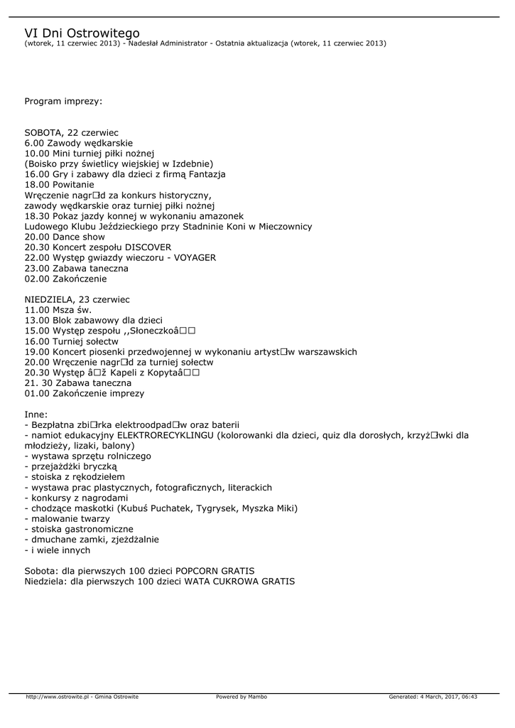 VI Dni Ostrowitego (wtorek, 11 czerwiec 2013) - Nadesłał Administrator - Ostatnia aktualizacja (wtorek, 11 czerwiec 2013) Program imprezy: SOBOTA, 22 czerwiec 6.00 Zawody wędkarskie 10.00 Mini turniej piłki nożnej (Boisko przy świetlicy wiejskiej w Izdebnie) 16.00 Gry i zabawy dla dzieci z firmą Fantazja 18.00 Powitanie Wręczenie nagrÃłd za konkurs historyczny, zawody wędkarskie oraz turniej piłki nożnej 18.30 Pokaz jazdy konnej w wykonaniu amazonek Ludowego Klubu Jeździeckiego przy Stadninie Koni w Mieczownicy 20.00 Dance show 20.30 Koncert zespołu DISCOVER 22.00 Występ gwiazdy wieczoru - VOYAGER 23.00 Zabawa taneczna 02.00 Zakończenie NIEDZIELA, 23 czerwiec 11.00 Msza św. 13.00 Blok zabawowy dla dzieci 15.00 Występ zespołu ,,Słoneczko― 16.00 Turniej sołectw 19.00 Koncert piosenki przedwojennej w wykonaniu artystÃłw warszawskich 20.00 Wręczenie nagrÃłd za turniej sołectw 20.30 Występ „Kapeli z Kopyta― 21. 30 Zabawa taneczna 01.00 Zakończenie imprezy Inne: - Bezpłatna zbiÃłrka elektroodpadÃłw oraz baterii - namiot edukacyjny ELEKTRORECYKLINGU (kolorowanki dla dzieci, quiz dla dorosłych, krzyżÃłwki dla młodzieży, lizaki, balony) - wystawa sprzętu rolniczego - przejażdżki bryczką - stoiska z rękodziełem - wystawa prac plastycznych, fotograficznych, literackich - konkursy z nagrodami - chodzące maskotki (Kubuś Puchatek, Tygrysek, Myszka Miki) - malowanie twarzy - stoiska gastronomiczne - dmuchane zamki, zjeżdżalnie - i wiele innych Sobota: dla pierwszych 100 dzieci POPCORN GRATIS Niedziela: dla pierwszych 100 dzieci WATA CUKROWA GRATIS http://www.ostrowite.pl - Gmina Ostrowite Powered by Mambo Generated: 4 March, 2017, 06:43
