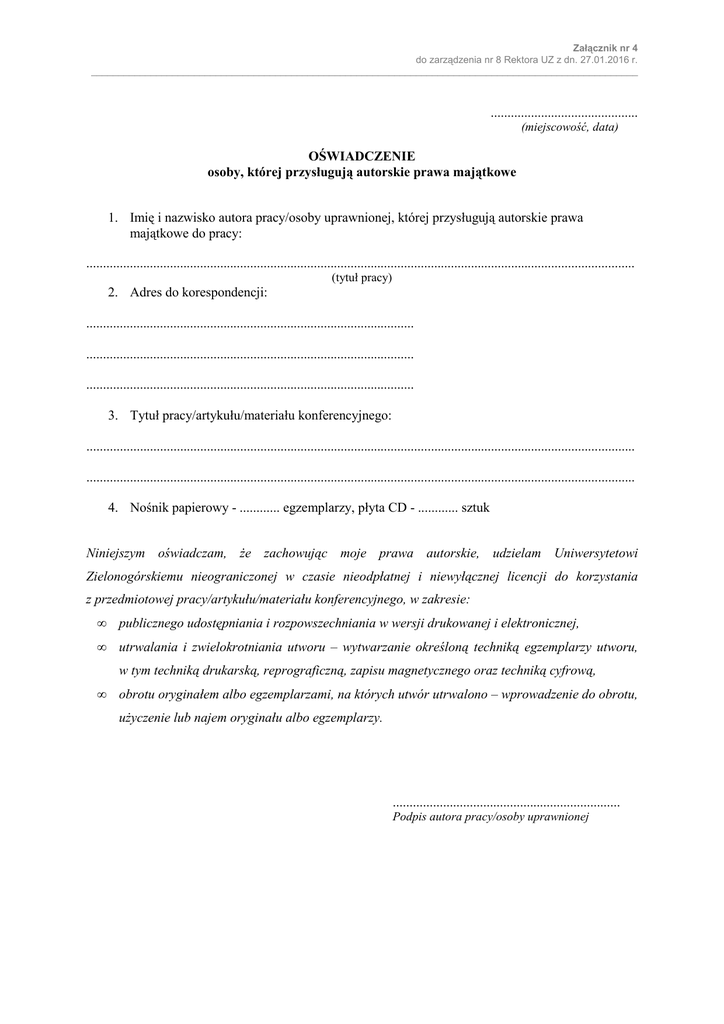 Załącznik nr 4 do zarządzenia nr 8 Rektora UZ z dn. 27.01.2016 r. _____________________________________________________________________________________________________ ............................................ (miejscowość, data) OŚWIADCZENIE osoby, której przysługują autorskie prawa majątkowe 1. Imię i nazwisko autora pracy/osoby uprawnionej, której przysługują autorskie prawa majątkowe do pracy: .................................................................................................................................................................... (tytuł pracy) 2. Adres do korespondencji: .................................................................................................. .................................................................................................. .................................................................................................. 3. Tytuł pracy/artykułu/materiału konferencyjnego: .................................................................................................................................................................... .................................................................................................................................................................... 4. Nośnik papierowy - ............ egzemplarzy, płyta CD - ............ sztuk Niniejszym oświadczam, że zachowując moje prawa autorskie, udzielam Uniwersytetowi Zielonogórskiemu nieograniczonej w czasie nieodpłatnej i niewyłącznej licencji do korzystania z przedmiotowej pracy/artykułu/materiału konferencyjnego, w zakresie: • publicznego udostępniania i rozpowszechniania w wersji drukowanej i elektronicznej, • utrwalania i zwielokrotniania utworu – wytwarzanie określoną techniką egzemplarzy utworu, w tym techniką drukarską, reprograficzną, zapisu magnetycznego oraz techniką cyfrową, • obrotu oryginałem albo egzemplarzami, na których utwór utrwalono – wprowadzenie do obrotu, użyczenie lub najem oryginału albo egzemplarzy. .................................................................... Podpis autora pracy/osoby uprawnionej