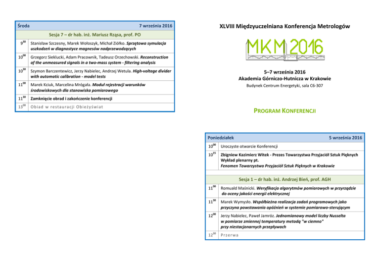 Środa XLVIII Międzyuczelniana zelniana Konferencja Metrologów 7 września 2016 Sesja 7 – dr hab. inż. Mariusz Rząsa,, prof. PO 30 9 00 10 30 10 00 11 30 11 00 13 Stanisław Szczesny, Marek Wołoszyk, Michał Ziółko. Sprzętowa symulacja uszkodzeń w diagnostyce magnesów nadprzewodzących Grzegorz Sieklucki,, Adam Pracownik, Tadeusz Orzechowski. Reconstruction of the unmeasured signals in a two-mass system - filtering analysis 5–7 7 września 2016 Akademia Górniczo-Hutnicza Górniczo w Krakowie Szymon Barczentewicz, Jerzy Nabielec, Andrzej Wetula. High High-voltage divider with automatic calibration - model tests Marek Kciuk, Marcelina Mrógała. Moduł rejestracji warunków środowiskowych dla stanowiska pomiarowego Budynek Centrum Energetyki, sala C6-307 Zamknięcie obrad i zakończenie konferencji Ob iad w r e stau ra cji Ob i eży ś wi at PROGRAM KONFERENCJI Poniedziałek 00 10 15 10 5 września 2016 Uroczyste otwarcie Konferencji Zbigniew Kazimierz Witek - Prezes Towarzystwa Przyjaciół Sztuk Pięknych Wykład plenarny pt. Fenomen Towarzystwa Przyjaciół Sztuk Pięknych w Krakowie Sesja 1 – dr hab. inż. Andrzej Bień, Bień prof. AGH 00 11 30 11 00 12 30 12 Romuald Maśnicki. Weryfikacja algorytmów pomiarowych w przyrządzie do oceny jakości energii elektrycznej Marek Wymysło. Współbieżna realizacja zadań programowych jako przyczyna powstawania opóźnień w systemie pomiarowo-sterującym pomiarowo Jerzy Nabielec, Paweł Jamróz.. Jednomianowy model liczby Nusselta w pomiarze zmiennej temperatury metodą "w ciemno" przy niestacjonarnych przepływach rzepływach Prz er wa Sesja 2 (dydaktyczna) – dr hab. inż. Dariusz Świsulski, prof. PG 00 13 30 13 00 14 30 11 Anna Szlachta. Przyrządy wirtualne wspomagające nauczanie podstaw metrologii Grzegorz Pankanin. Czy studenci wydziałów elektronicznych mogą polubić laboratorium podstaw pomiarów? Ob iad w r e stau ra cji Ob i eży ś wi at Sesja 5 – dr hab. inż. Sławomir Gryś, prof. PCz 00 12 30 12 Sesja 3 – prof. dr hab. inż. Leon Swędrowski 00 15 30 15 00 16 30 16 00 17 Adam Ilnicki, Mariusz R. Rząsa. Stanowisko do badania silnika pneumatycznego Sławomir Gryś. Bezprzewodowy pomiar ciśnienia i temperatury powietrza w kole samochodowym Maria Wrzuszczak, Yuriy Khoma. Error correction of impedance-voltage converter with neural network application Andrzej Ożadowicz, Jakub Grela. System aktywnego zarządzania popytem na energię w budynkach 00 13 00 14 30 14 00 30 15 Wtorek 6 września 2016 Sesja 4 – dr hab. inż. Maria Wrzuszczak, prof. PO 30 9 00 10 30 10 00 11 Mariusz R. Rząsa, Joanna Boguniewicz-Zabłocka. Sposób analizy wyznaczania trajektorii ruchu pęcherzyka gazu poprzez śledzenie jego środka masy i orientacji przestrzennej Dariusz Kasprzak, Andrzej Mrowiec. Pomiar kryzą segmentową strumienia medium dla małych liczb Reynoldsa Marek Kciuk, Sebastian Bartel. Zastosowanie algorytmu genetycznego w celu wyznaczenia współczynników wzmocnienia wzmacniacza wejściowego rejestratora sygnałów Witold Aksamit, Jakub Rzeszutko. Application of GaN transistors to increase efficiency of switched-mode power supplies Krzysztof Tomczyk. Relationship between the number of Monte Carlo trials applied for modelling voltage output accelerometers and the maximum dynamic errors Marta Wiśniewska. A deep-flick standard applied for determination of FMM sensor indication errors Bartosz Dominikowski, Krzysztof Pacholski. Korekcja właściwości metrologicznych przetworników szybkozmiennych sygnałów elektronicznych Ob iad w r e stau ra cji Ob i eży ś wi at Wy jazd n a s e sj ę do Politechniki Krakowskiej Małopolskie Laboratorium Budownictwa Energooszczędnego Sesja 6 (na terenie PK) – mgr inż. Paweł Kwasnowski 15 Ws p óln e wy j śc ie n a Ry n ek Kra ko w ski Zw i ed zan i e Po d zi e mi Ry n ku i u ro czy sta ko lac ja Prz er wa 00 16 30 16 00 17 30 19 Grzegorz Hayduk, Paweł Kwasnowski, Małgorzata Fedorczak-Cisak, Marcin Furtak. Wybrane zagadnienia systemu opomiarowania specjalistycznego w budynku Małopolskiego Laboratorium Budownictwa Energooszczędnego Politechniki Krakowskiej Zbigniew Mikoś, Marcin Jachimski, Grzegorz Hayduk, Grzegorz Wróbel, Paweł Kwasnowski. Algorytmy zamiany odczytów czasowych liczników energii na wirtualne odczyty zdarzeniowe Grzegorz Hayduk, Marcin Jachimski, Paweł Kwasnowski, Zbigniew Mikoś, Grzegorz Wróbel. System akwizycji, rejestracji i wspomagania analizy zużycia energii elektrycznej Grzegorz Wróbel, Marcin Jachimski, Grzegorz Hayduk, Paweł Kwasnowski. Pośrednie pomiary zużycia energii elektrycznej w systemach automatyki budynków Wy c ie czk a t ec h n i czn a Kon w en t S en i oró w