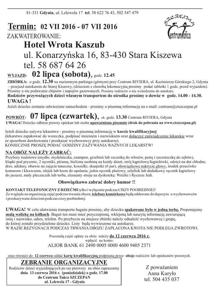 81-331 Gdynia, ul. Lelewela 17 tel. 58 622 76 43, 502 547 479 Termin: 02 VII 2016 - 07 VII 2016 ZAKWATEROWANIE: Hotel Wrota Kaszub ul. Konarzyńska 16, 83-430 Stara Kiszewa tel. 58 687 64 26 02 lipca (sobota), godz. 12.45 WYJAZD: ZBIÓRKA: o godz. 12.30 na naziemnym parkingu (górnym) przy Centrum RIVIERA, ul. Kazimierza Górskiego 2, Gdynia - przejazd autokarem do Starej Kiszewy, (dzieciom z chorobą lokomocyjną prosimy podać tabletki 1 godz. przed wyjazdem). Prosimy o nie podawanie chipsów i napojów gazowanych. Prosimy rodziców o nie wchodzenie do autokaru. Rodziców przywożących dzieci własnym transportem do ośrodka prosimy o dowóz w godz. 14.00 - 14.30. UWAGA ! Jeżeli dziecko zostanie odwiezione samochodem - prosimy o pisemną informację na e-mail: [email protected] POWRÓT: 07 lipca (czwartek), ok. godz. 13.30 Centrum RIVIERA, Gdynia UWAGA! Dziecko odbiera prawny opiekun lub osoba upoważniona pisemnie (druk do pobrania na www.ctszczepan.pl) Jeżeli dziecko zażywa lekarstwa - prosimy o pisemną informację w karcie kwalifikacyjnej (lekarstwa zapakować do woreczka, podpisać imieniem i nazwiskiem oraz dołączyć zaświadczenie lekarskie wraz ze sposobem dawkowania i przekazać wychowawcy przy autokarze). KONIECZNIE PROSZĘ PODAĆ GODZINY ZAŻYWANIA WAŻNYCH LEKARSTW! NA OBÓZ NALEŻY ZABRAĆ: Przybory toaletowe (mydło, mydelniczka, szampon, grzebień lub szczotkę do włosów, pastę i szczoteczkę do zębów), klapki pod prysznic, 2 ręczniki, piżamę, bieliznę osobistą na każdy dzień, strój kąpielowy/kąpielówki, odzież na dni chłodne, dres, adidasy, obuwie na zajęcia taneczne, koszulki, skarpetki (6 par), obowiązkowe nakrycie głowy, środek przeciwko komarom i kleszczom, olejek lub krem do opalania, jeden ręcznik plażowy, szlafrok lub dodatkowy ręcznik kąpielowy do jacuzzi, mały pleczaczek lub torba, elementy stroju na dyskotekę: Wróżki i Rycerze Jedi. Obowiązkowo zabrać dobry humor !! KONTAKT TELEFONICZNY Z DZIEĆMI tylko i wyłącznie podczas CISZY POOBIEDNIEJ! Ze względu na organizację zajęć podczas trwania obozu, telefony komórkowe będą oddawane do depozytu u wychowawców i przekazywane dzieciom podczas ciszy poobiedniej. UWAGA! W celu ułatwienia transportu bagażu prosimy, aby dziecko spakowane było w jedną torbę. Proponujemy małą walizkę na kółkach. Bagaż ten musi mieć przyczepioną, wklejoną lub naszytą informację zawierającą imię i nazwisko, adres, telefon. Po przybyciu na miejsce zbiórki należy odnaleźć wychowawcę i grupę, do której zostało przydzielone dziecko. Listy będą wywieszone na autokarze. W RAZIE REZYGNACJI PODCZAS TRWANIA OBOZU ZAPŁACONA KWOTA NIE PODLEGA ZWROTOWI. Pozostałą część opłaty za obóz należy do 12 czerwca 2016 r. wpłacić na konto: ALIOR BANK 61 2490 0005 0000 4600 9405 2371 oraz również do 12 czerwca oddać kartę kwalifikacyjną podpisaną przez oboje rodziców lub opiekunów prawnych. ZEBRANIE ORGANIZACYJNE Rodziców dzieci wyjeżdżających po raz pierwszy na obóz zapraszamy dnia 13 czerwca 2016 r. (poniedziałek) o godz. 17.00 do Centrum Tańca SZCZEPAN ul. Lelewela 17 - Gdynia Z poważaniem Anna Kuryło tel. 504 435 037