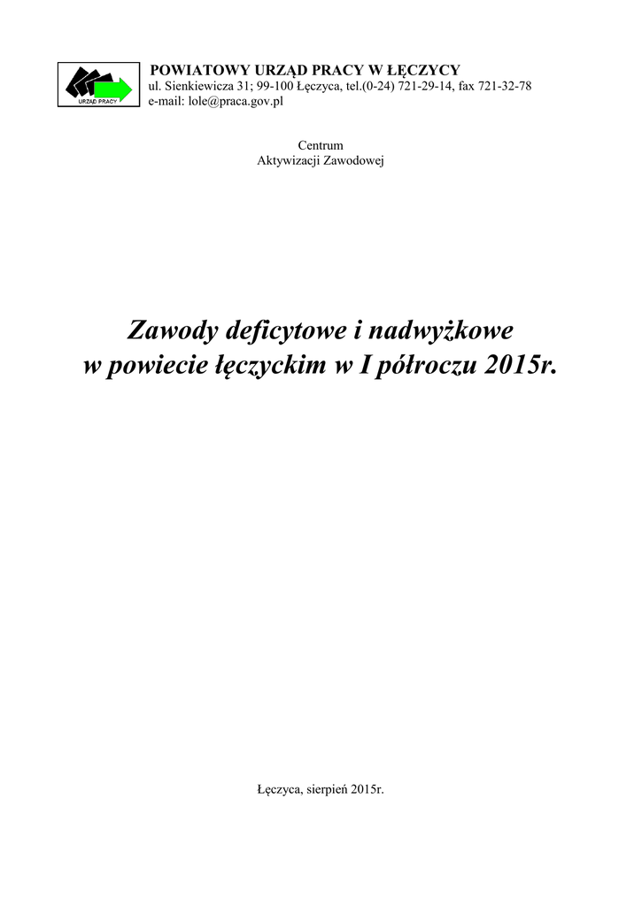 POWIATOWY URZĄD PRACY W ŁĘCZYCY ul. Sienkiewicza 31; 99-100 Łęczyca, tel.(0-24) 721-29-14, fax 721-32-78 e-mail: [email protected] Centrum Aktywizacji Zawodowej Zawody deficytowe i nadwyżkowe w powiecie łęczyckim w I półroczu 2015r. Łęczyca, sierpień 2015r. POWIATOWY URZĄD PRACY W ŁĘCZYCY ul. Sienkiewicza 31; 99-100 Łęczyca, tel.(0-24) 721-29-14, fax 721-32-78 e-mail: [email protected] INFORMACJA SYGNALNA I PÓŁROCZE 2015R. Zawody maksymalnie deficytowe Inżynier automatyki i robotyki Specjalista do spraw pakowania i opakowań Lekarz Audytor DEFICYT Technik automatyk Pozostali operatorzy urządzeń energetycznych Elektryk Operator urządzeń do produkcji pasz Zawody deficytowe Specjalista do spraw kadr Monter konstrukcji stalowych RÓWNOWAGA Goniec Zawody zrównoważone Kierowca autobusu NADWYŻKA Zawody nadwyżkowe Technik prac biurowych Kosmetyczka Brukarz Zawody maksymalnie nadwyżkowe Urzędnik podatkowy Pozostali kasjerzy i sprzedawcy biletów NADWYŻKA Hodowca ryb Monter sieci wodnych i kanalizacyjnych Mechanik/konserwator urządzeń do napełniania i opróżniania zbiorników Przędzarz Monter – elektronik instalacji anten Operator maszyn wykończalniczych wyrobów włókiennych Monter wyrobów z tworzyw sztucznych Robotnik placowy