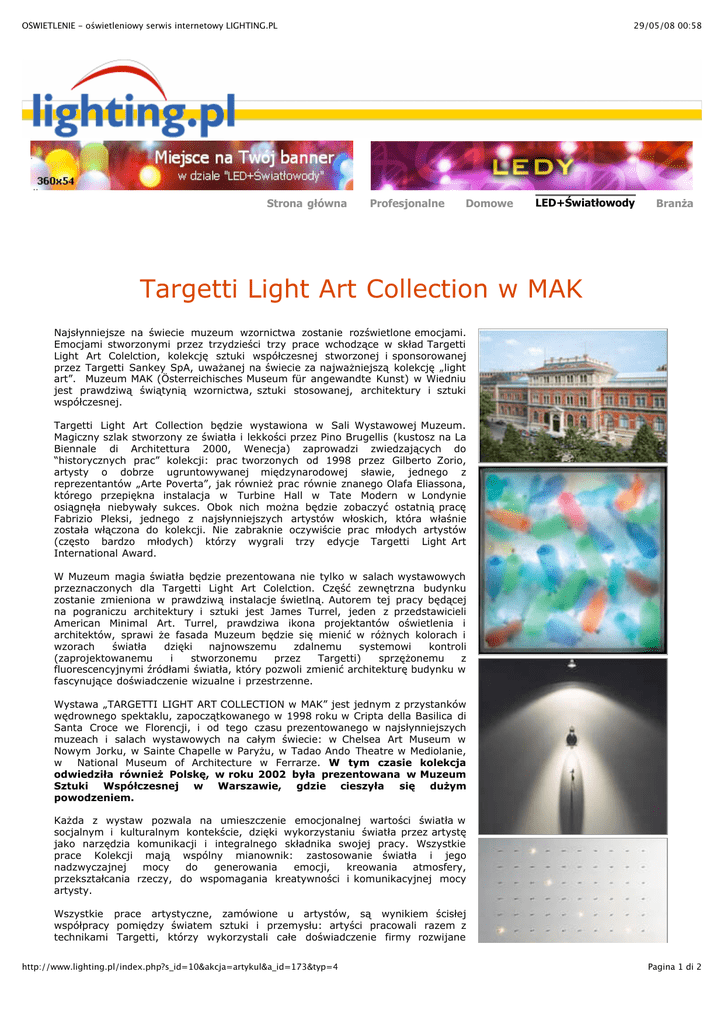 OŚWIETLENIE - oświetleniowy serwis internetowy LIGHTING.PL Strona główna 29/05/08 00:58 Profesjonalne Domowe LED+Światłowody Branża Targetti Light Art Collection w MAK Najsłynniejsze na świecie muzeum wzornictwa zostanie rozświetlone emocjami. Emocjami stworzonymi przez trzydzieści trzy prace wchodzące w skład Targetti Light Art Colelction, kolekcję sztuki współczesnej stworzonej i sponsorowanej przez Targetti Sankey SpA, uważanej na świecie za najważniejszą kolekcję „light art”. Muzeum MAK (Österreichisches Museum für angewandte Kunst) w Wiedniu jest prawdziwą świątynią wzornictwa, sztuki stosowanej, architektury i sztuki współczesnej. Targetti Light Art Collection będzie wystawiona w Sali Wystawowej Muzeum. Magiczny szlak stworzony ze światła i lekkości przez Pino Brugellis (kustosz na La Biennale di Architettura 2000, Wenecja) zaprowadzi zwiedzających do “historycznych prac” kolekcji: prac tworzonych od 1998 przez Gilberto Zorio, artysty o dobrze ugruntowywanej międzynarodowej sławie, jednego z reprezentantów „Arte Poverta”, jak również prac równie znanego Olafa Eliassona, którego przepiękna instalacja w Turbine Hall w Tate Modern w Londynie osiągnęła niebywały sukces. Obok nich można będzie zobaczyć ostatnią pracę Fabrizio Pleksi, jednego z najsłynniejszych artystów włoskich, która właśnie została włączona do kolekcji. Nie zabraknie oczywiście prac młodych artystów (często bardzo młodych) którzy wygrali trzy edycje Targetti Light Art International Award. W Muzeum magia światła będzie prezentowana nie tylko w salach wystawowych przeznaczonych dla Targetti Light Art Colelction. Część zewnętrzna budynku zostanie zmieniona w prawdziwą instalacje świetlną. Autorem tej pracy będącej na pograniczu architektury i sztuki jest James Turrel, jeden z przedstawicieli American Minimal Art. Turrel, prawdziwa ikona projektantów oświetlenia i architektów, sprawi że fasada Muzeum będzie się mienić w różnych kolorach i wzorach światła dzięki najnowszemu zdalnemu systemowi kontroli (zaprojektowanemu i stworzonemu przez Targetti) sprzężonemu z fluorescencyjnymi źródłami światła, który pozwoli zmienić architekturę budynku w fascynujące doświadczenie wizualne i przestrzenne. Wystawa „TARGETTI LIGHT ART COLLECTION w MAK” jest jednym z przystanków wędrownego spektaklu, zapoczątkowanego w 1998 roku w Cripta della Basilica di Santa Croce we Florencji, i od tego czasu prezentowanego w najsłynniejszych muzeach i salach wystawowych na całym świecie: w Chelsea Art Museum w Nowym Jorku, w Sainte Chapelle w Paryżu, w Tadao Ando Theatre w Mediolanie, w National Museum of Architecture w Ferrarze. W tym czasie kolekcja odwiedziła również Polskę, w roku 2002 była prezentowana w Muzeum Sztuki Współczesnej w Warszawie, gdzie cieszyła się dużym powodzeniem. Każda z wystaw pozwala na umieszczenie emocjonalnej wartości światła w socjalnym i kulturalnym kontekście, dzięki wykorzystaniu światła przez artystę jako narzędzia komunikacji i integralnego składnika swojej pracy. Wszystkie prace Kolekcji mają wspólny mianownik: zastosowanie światła i jego nadzwyczajnej mocy do generowania emocji, kreowania atmosfery, przekształcania rzeczy, do wspomagania kreatywności i komunikacyjnej mocy artysty. Wszystkie prace artystyczne, zamówione u artystów, są wynikiem ścisłej współpracy pomiędzy światem sztuki i przemysłu: artyści pracowali razem z technikami Targetti, którzy wykorzystali całe doświadczenie firmy rozwijane http://www.lighting.pl/index.php?s_id=10&akcja=artykul&a_id=173&typ=4 Pagina 1 di 2 OŚWIETLENIE - oświetleniowy serwis internetowy LIGHTING.PL 29/05/08 00:58 podczas jej siedemdziesięciu pięciu lat działania w sektorze oświetlenia architektonicznego. Ta synergia przyniosła Kolekcji Nagrode Guggenheim „Impresa e Cultura” w 1999. Wystawa “TARGETTI LIGHT ART COLLECTION w MAK” (której kuratorem jest Amnon Barzel) będzie otwarta dla zwiedzających od 24 listopada 2004 do 16 stycznia 2005. Artyści: Krzyszytof Bednarski, Fabrizio Corneli, Olafur Eliasson, Franco Ionda, Kristin Jones & Andrew Ginzel, Werner Klotz, Lena Liv, Donatella Mei, Vittorio Messina, Hidestoshi Nagasawa, Fabrizio Plessi, Anne i Patrick Poirier, Rivka Rinn, Gilberto Zorio, Salvo Bonura & Simon Crilley, Nicola Evangelisti, Ferrario Freres, Clara Luiselli, Carlo Nonnis, Fabrizio Rivola, Ely Rozenberg, Nicola Toffolini, Attilio Tono, Patrizio Travagli, Shinji Yamamoto. Więcej informacji o muzeum: www.MAK.at http://www.lighting.pl/index.php?s_id=10&akcja=artykul&a_id=173&typ=4 Pagina 2 di 2