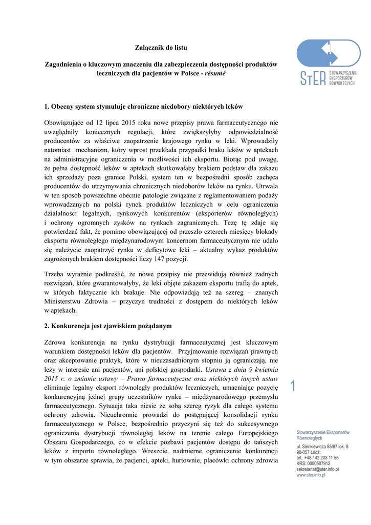 Załącznik do listu Zagadnienia o kluczowym znaczeniu dla zabezpieczenia dostępności produktów leczniczych dla pacjentów w Polsce - résumé 1. Obecny system stymuluje chroniczne niedobory niektórych leków Obowiązujące od 12 lipca 2015 roku nowe przepisy prawa farmaceutycznego nie uwzględniły koniecznych regulacji, które zwiększyłyby odpowiedzialność producentów za właściwe zaopatrzenie krajowego rynku w leki. Wprowadziły natomiast mechanizm, który wprost przekłada przypadki braku leków w aptekach na administracyjne ograniczenia w możliwości ich eksportu. Biorąc pod uwagę, że pełna dostępność leków w aptekach skutkowałaby brakiem podstaw dla zakazu ich sprzedaży poza granice Polski, system ten w bezpośredni sposób zachęca producentów do utrzymywania chronicznych niedoborów leków na rynku. Utrwala w ten sposób powszechne obecnie patologie związane z reglamentowaniem podaży wprowadzanych na polski rynek produktów leczniczych w celu ograniczenia działalności legalnych, rynkowych konkurentów (eksporterów równoległych) i ochrony ogromnych zysków na rynkach zagranicznych. Tezę tę zdaje się potwierdzać fakt, że pomimo obowiązującej od przeszło czterech miesięcy blokady eksportu równoległego międzynarodowym koncernom farmaceutycznym nie udało się należycie zaopatrzyć rynku w deficytowe leki – aktualny wykaz produktów zagrożonych brakiem dostępności liczy 147 pozycji. Trzeba wyraźnie podkreślić, że nowe przepisy nie przewidują również żadnych rozwiązań, które gwarantowałyby, że leki objęte zakazem eksportu trafią do aptek, w których faktycznie ich brakuje. Nie odpowiadają też na szereg – znanych Ministerstwu Zdrowia – przyczyn trudności z dostępem do niektórych leków w aptekach. 2. Konkurencja jest zjawiskiem pożądanym Zdrowa konkurencja na rynku dystrybucji farmaceutycznej jest kluczowym warunkiem dostępności leków dla pacjentów. Przyjmowanie rozwiązań prawnych oraz akceptowanie praktyk, które w nieuzasadnionym stopniu ją ograniczają, nie leży w interesie ani pacjentów, ani polskiej gospodarki. Ustawa z dnia 9 kwietnia 2015 r. o zmianie ustawy – Prawo farmaceutyczne oraz niektórych innych ustaw eliminuje legalny eksport równoległy produktów leczniczych, umacniając pozycję konkurencyjną jednej grupy uczestników rynku – międzynarodowego przemysłu farmaceutycznego. Sytuacja taka niesie ze sobą szereg ryzyk dla całego systemu ochrony zdrowia. Nieuchronnie prowadzi do postępującej konsolidacji rynku farmaceutycznego w Polsce, bezpośrednio przyczyni się też do sukcesywnego ograniczenia dystrybucji równoległej leków na terenie całego Europejskiego Obszaru Gospodarczego, co w efekcie pozbawi pacjentów dostępu do tańszych leków z importu równoległego. Wreszcie, nadmierne ograniczenie konkurencji w tym obszarze sprawia, że pacjenci, apteki, hurtownie, placówki ochrony zdrowia 1 i płatnik publiczny w rosnącym stopniu stają się zakładnikami globalnych koncernów farmaceutycznych. 3. Zdrowy rynek to rynek transparentny Wprowadzone na mocy ustawy z dnia 9 kwietnia ograniczenia w legalnym eksporcie równoległym leków bazują na niejasnych przesłankach. Nie mają realnego związku z zagrożeniem dla bezpieczeństwa, życia i zdrowia pacjentów, nie reprezentują skali proporcjonalnej do faktycznych potrzeb, nie mają też przełożenia na faktyczną poprawę dostępności leków na rynku. Do momentu uruchomienia Zintegrowanego Systemu Monitorowania Obrotu Produktami Leczniczymi nie bazują też na wiedzy, która pozwalałaby Głównemu Inspektorowi Farmaceutycznemu na podejmowanie w tym zakresie decyzji o charakterze innym niż wyłącznie uznaniowy. W tym kontekście na niezwykle krytyczną ocenę zasługuje rażące zignorowanie otrzymanych przez stronę polską zaleceń Komisji Europejskiej dotyczących tworzenia wykazu produktów leczniczych, środków spożywczych specjalnego przeznaczenia żywieniowego i wyrobów medycznych zagrożonych brakiem dostępności na terenie Rzeczypospolitej Polskiej. Stanowiły one m.in. że wykaz nie powinien opierać się wyłącznie o ryzyko niedoboru danego produktu, ale powinien również uwzględniać niedostępność zamiennika terapeutycznego dla chorych wymagających leczenia, jak również odpowiedniego zamiennika środków spożywczych specjalnego przeznaczenia żywieniowego i wyrobów medycznych o tym samym zastosowaniu medycznym (diagnozowanie, profilaktyka, monitoring, leczenie lub łagodzenie objawów choroby; diagnozowanie, monitoring, leczenie, łagodzenie skutków lub kompensacja urazu lub niepełnosprawności; badanie, zastąpienie lub modyfikacja budowy anatomicznej lub procesu fizjologicznego). 4. Ochrona dystrybucji równoległej to wspólny interes Dystrybucja równoległa stymuluje sukcesywne obniżanie cen leków w Europie – jest źródłem rosnących oszczędności dla pacjentów i całego systemu ochrony zdrowia. Eksport równoległy pozytywnie wpływa na bilans handlowy Polski. Generuje też istotne wpływy podatkowe do budżetu Państwa - trudne do zrozumienia są więc podnoszone w dyskusji publicznej propozycje wprowadzenia sztywnej, 5% marży również na leki stanowiące przedmiot eksportu (prawdopodobnie nie wpłynęłoby to bowiem na jego skalę, natomiast doprowadziło do wytransferowania części wpływów podatkowych poza Polską gospodarkę). Warto nadmienić, że eksport jest ważnym źródłem przychodów nie tylko dla tych hurtowni, które same eksportują, ale i pozostałych, które dzięki niemu mają znacznie większe obroty w kraju. Dzięki temu mogą m.in. rozwijać i podnosić jakość serwisu dla aptek. W bezpośrednim interesie pacjenta i polskiej gospodarki jest maksymalizacja eksportu prowadzonego w oparciu o nadwyżki leków na rynku. 2
