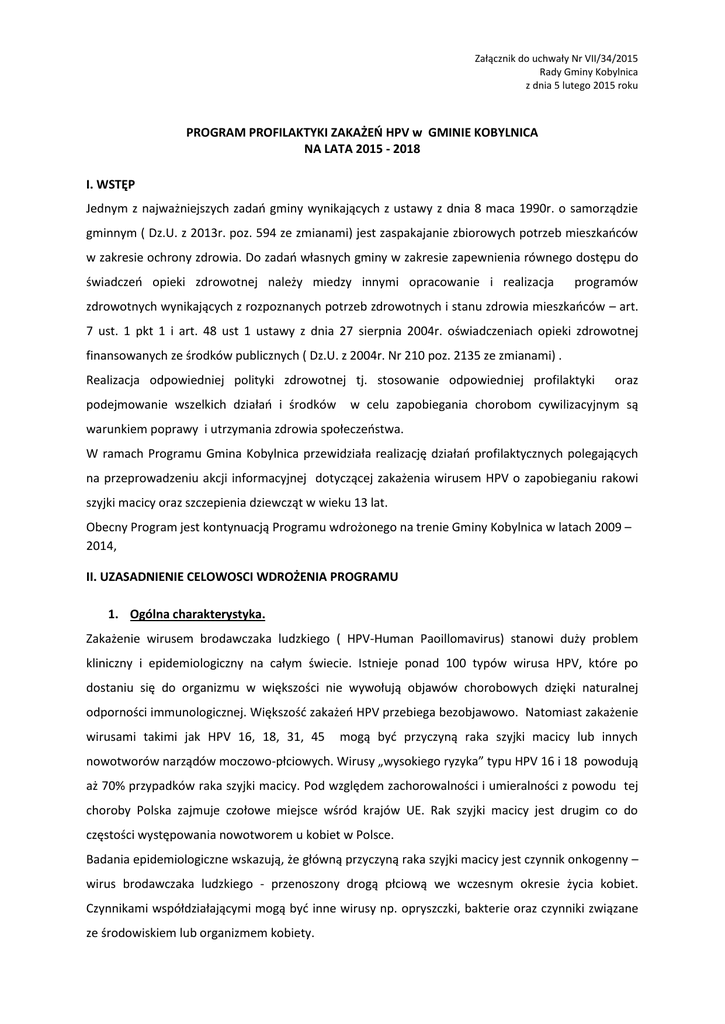 Załącznik do uchwały Nr VII/34/2015 Rady Gminy Kobylnica z dnia 5 lutego 2015 roku PROGRAM PROFILAKTYKI ZAKAŻEŃ HPV w GMINIE KOBYLNICA NA LATA 2015 - 2018 I. WSTĘP Jednym z najważniejszych zadań gminy wynikających z ustawy z dnia 8 maca 1990r. o samorządzie gminnym ( Dz.U. z 2013r. poz. 594 ze zmianami) jest zaspakajanie zbiorowych potrzeb mieszkańców w zakresie ochrony zdrowia. Do zadań własnych gminy w zakresie zapewnienia równego dostępu do świadczeń opieki zdrowotnej należy miedzy innymi opracowanie i realizacja programów zdrowotnych wynikających z rozpoznanych potrzeb zdrowotnych i stanu zdrowia mieszkańców – art. 7 ust. 1 pkt 1 i art. 48 ust 1 ustawy z dnia 27 sierpnia 2004r. oświadczeniach opieki zdrowotnej finansowanych ze środków publicznych ( Dz.U. z 2004r. Nr 210 poz. 2135 ze zmianami) . Realizacja odpowiedniej polityki zdrowotnej tj. stosowanie odpowiedniej profilaktyki podejmowanie wszelkich działań i środków oraz w celu zapobiegania chorobom cywilizacyjnym są warunkiem poprawy i utrzymania zdrowia społeczeństwa. W ramach Programu Gmina Kobylnica przewidziała realizację działań profilaktycznych polegających na przeprowadzeniu akcji informacyjnej dotyczącej zakażenia wirusem HPV o zapobieganiu rakowi szyjki macicy oraz szczepienia dziewcząt w wieku 13 lat. Obecny Program jest kontynuacją Programu wdrożonego na trenie Gminy Kobylnica w latach 2009 – 2014, II. UZASADNIENIE CELOWOSCI WDROŻENIA PROGRAMU 1. Ogólna charakterystyka. Zakażenie wirusem brodawczaka ludzkiego ( HPV-Human Paoillomavirus) stanowi duży problem kliniczny i epidemiologiczny na całym świecie. Istnieje ponad 100 typów wirusa HPV, które po dostaniu się do organizmu w większości nie wywołują objawów chorobowych dzięki naturalnej odporności immunologicznej. Większość zakażeń HPV przebiega bezobjawowo. Natomiast zakażenie wirusami takimi jak HPV 16, 18, 31, 45 mogą być przyczyną raka szyjki macicy lub innych nowotworów narządów moczowo-płciowych. Wirusy „wysokiego ryzyka” typu HPV 16 i 18 powodują aż 70% przypadków raka szyjki macicy. Pod względem zachorowalności i umieralności z powodu tej choroby Polska zajmuje czołowe miejsce wśród krajów UE. Rak szyjki macicy jest drugim co do częstości występowania nowotworem u kobiet w Polsce. Badania epidemiologiczne wskazują, że główną przyczyną raka szyjki macicy jest czynnik onkogenny – wirus brodawczaka ludzkiego - przenoszony drogą płciową we wczesnym okresie życia kobiet. Czynnikami współdziałającymi mogą być inne wirusy np. opryszczki, bakterie oraz czynniki związane ze środowiskiem lub organizmem kobiety. 2. Epidemiologia. Zakażenie HPV odbywa się głownie drogą płciową i może być jawne klinicznie lub przybierać formę subkliniczną . W fazie utajnionej nie występują objawy. Najczęściej zakażenie wirusem HPV ulega samowyleczeniu. U kobiet do 25 roku życia większość infekcji ulega regresji w ciągu 12-18 miesięcy. Utrzymywanie się zakażenia powyżej 24 miesięcy jest związane z zakażeniem wirusami wysoko onkogennymi. Obecnie nie jest znany sposób radykalnego leczenia zakażenia wirusem HPV, dlatego bardzo ważna jest profilaktyka zakażeń mogących powodować raka narządów płciowych. Światowa Organizacja Zdrowia wyróżnia następujące rodzaje działalności profilaktycznej: profilaktyka pierwotna , która polega na informowaniu o czynnikach ryzyka zachorowań oraz obejmuje szczepienia przeciwko onkogennym typom wirusa HPV, profilaktyka wtórna polega na wykrywaniu stanów przednowotworowych i wczesnych postaci raka, profilaktyka trzeciorzędowa obejmuje prawidłową diagnostykę i leczenie raka. Opóźniona w Polsce diagnostyka raka szyjki macicy u kobiet, wysokie koszty leczenia, a przede wszystkim małe jego efekty stanowią istotną przesłankę do intensyfikacji działań profilaktycznych ograniczających występowanie i skutki choroby. Rutynowe szczepienia nastolatek przeciwko infekcji HPV jako ważną część skutecznej profilaktyki raka szyjki macicy rekomendują m. in. Polskie Towarzystwo Ginekologiczne (PTG), Polskie Towarzystwo Profilaktyki Zakażeń HPV, a także Światowa Organizacja Zdrowia. PTG szacuje, że powszechne szczepienia całych roczników nastolatek spowodują zmniejszenie ogólnej liczby zachorowań na raka szyjki macicy oraz zredukowanie umieralności o około 70% w ciągu 15 – 20 lat od rozpoczęcia szczepień. Polskie Towarzystwo Profilaktyki Zakażeń HPV, które przygotowało rekomendacje przy udziale innych towarzystw (m. in. Polskiego Towarzystwa Medycyny Rodzinnej i Polskiego Towarzystwa Ginekologii Onkologicznej) zaleca szczepienia dziewcząt i kobiet w wieku od 9 – 26 lat. III. CELE PROGRAMU 1.Cel główny: Zmniejszenie liczby zachorowań na raka szyjki macicy poprzez przeprowadzenie edukacji zdrowotnej oraz szczepień ochronnych przeciwko wirusowi HPV w określonej populacji młodych mieszkanek Gminy Kobylnica (co wpłynie na poprawę zdrowia mieszkańców Gminy) oraz ukształtowanie właściwych nawyków higienicznych . 2. Cele pośrednie : Podniesienie poziomu wiedzy i świadomości młodzieży szkolnej, a także rodziców w zakresie chorób przenoszonych drogą płciową , w tym zakażeń wirusem brodawczaka ludzkiego. Popularyzowanie wśród młodzieży nawyku systematycznego wykonywania badań profilaktycznych , w tym podkreślenie roli wykonywania badań cytologicznych. Promocja zdrowego trybu życia, właściwych nawyków higienicznych wśród młodzieży szkolnej. Zapoznanie rodziców z działaniem szczepionki przeciwko wirusowi brodawczaka ludzkiego (HPV) . IV. SPOSÓB REALIZACJI PROGRAMU 1. Uczestnicy Programu. Bezpośrednim odbiorcą Programu jest wyznaczona wg roku urodzenia populacja dziewcząt z poszczególnych roczników realizacji Programu zamieszkałych na terenie gminy Kobylnica. Pośrednimi adresatami Programu są rodzice/ opiekunowie prawni dziewcząt zainteresowanyc