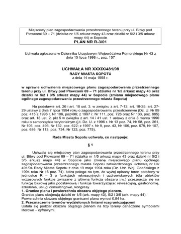 Miejscowy plan zagospodarowania przestrzennego terenu przy ul. Bitwy pod Płowcami 69 – 71 (działka nr 1/5 arkusz mapy 43 oraz działki nr 5/2 i 3/5 arkusz mapy 44) w Sopocie PLAN NR R-3/01 Uchwała ogłoszona w Dzienniku Urzędowym Województwa Pomorskiego Nr 43 z dnia 15 lipca 1998 r., poz. 157 UCHWAŁA NR XXXIX/481/98 RADY MIASTA SOPOTU z dnia 14 maja 1998 r. w sprawie uchwalenia miejscowego planu zagospodarowania przestrzennego terenu przy ul. Bitwy pod Płowcami 69 – 71 (działka nr 1/5 arkusz mapy 43 oraz działki nr 5/2 i 3/5 arkusz mapy 44) w Sopocie (zmiana miejscowego planu ogólnego zagospodarowania przestrzennego miasta Sopotu) Na podstawie art. 26 i art. 18 ust. 3. w związku z art. 7-12; art. 18-25; art. 2729 ustawy z dnia 7 lipca 1994 roku o zagospodarowaniu przestrzennym (Dz. U. Nr 89 poz. 415 z 1996 r. Nr 106, poz496; z 1997 r. Nr 111, poz. 726 oraz Nr 133, poz. 885) oraz art. 18 ust. 2. pkt 5 w związku z art. 14 i 41 ust. 1 ustawy z dnia 8 marca 1990 roku o samorządzie terytorialnym (j.t. Dz. U. z 1996 r. Nr 13 poz. 74, Nr 58, poz. 261, Nr 106, poz. 496, Nr 132, poz. 622; z 1997 r. Nr 9, poz. 43, Nr 106, poz. 679, Nr 107, poz. 686, Nr 113, poz. 734, Nr 123, poz. 775), Rada Miasta Sopotu uchwala, co następuje: §1 Uchwala się miejscowy plan zagospodarowania przestrzennego terenu przy ul. Bitwy pod Płowcami 69 – 71 (działka nr 1/5 arkusz mapy 43 oraz działki nr 5/2 i 3/5 arkusz mapy 44) w Sopocie jako zmianę miejscowego planu ogólnego zagospodarowania przestrzennego miasta Sopotu zatwierdzonego Uchwałą nr LII/ 491/94 Rady Miasta Sopotu z dnia 19 maja 1994 roku (Dz. Urz. Woj. Gdańskiego z 1994 roku Nr 16 poz. 74), która polega na tym, że wyżej opisany teren położony w jednostce R – 3 o funkcjach rekreacyjnych i uzdrowiskowych (dla obiektów wczasowych funkcje związane z główną funkcją obszaru j.w.) przeznacza się na funkcję biurową jako podstawową i funkcje towarzyszące: rekreacyjną, gastronomię, szkolenia, usługi consultingowe, kongresy. 1. Granice planu i powierzchnia obszaru objętego planem. Granice planu obejmują działki nr 1/5 (ark. mapy 43), 5/2 i 3/5 (ark. mapy 44). Powierzchnia obszaru objętego granicami planu wynosi 0,84 ha. 2. Przeznaczenie terenów wydzielonych liniami rozgraniczającymi Ustala się podział obszaru objętego planem na trzy tereny oznaczone symbolami literowo – cyfrowymi. U.1 – teren o powierzchni 0,72 ha przeznacza się na funkcję biurową jako podstawową i funkcje towarzyszące: rekreację, gastronomię, szkolenia, usługi consultingowe, kongresy, infrastruktura techniczna, U. 2 – teren o powierzchni 0,06 ha przeznacza się na funkcję rekreacji i sportu – włączenie w teren przeznaczony dla ośrodka sportów wodnych, K. 1 – teren o powierzchni 0,06 ha przeznacza się na cele komunikacji (parkingi, dojazdy, w tym dojazd do trafostacji, przejścia piesze, ścieżka rowerowa) 3. Lokalne warunki, zasady i standardy kształtowania zabudowy oraz urządzenia terenu Teren oznaczony symbolem U. 1: - linie zabudowy – jak na rysunku planu - maksymalna wysokość zabudowy – nie może przekraczać wysokości istniejącego budynku, tj. 37 m liczone od istniejącego poziomu terenu, - maksymalny wskaźnik intensywności zabudowy (intensywność zabudowy = powierzchnia użytkowa budynku brutto do powierzchni działki b : d. Powierzchnia użytkowa budynku brutto = powierzchnia całkowita wszystkich kondygnacji po obrysie z wyłączeniem tarasów i balkonów pomniejszona o 10%) - 1,4, - procent terenu przeznaczonego pod zabudowę – nie więcej niż 30%, - potrzeby parkingowe – zabezpieczyć w granicach użytkowania przy przyjęciu wskaźnika – min. 2,5 miejsc postojowych na 100m2 powierzchni użytkowej usług, - dojazd – wyklucza się bezpośredni wjazd od ul. Bitwy pod Płowcami. Teren oznaczony symbolem U.2 - z uwagi na przeznaczenie (pkt. 2.) teren nie może stanowić samodzielnej działki budowlanej, - linie zabudowy – jak na rysunku planu, - wysokość zabudowy – nie określa się, - maksymalny wskaźnik intensywności zabudowy – nie określa się, - procent terenu przeznaczonego pod zabudowę – nie określa się. 4. Zasady obsługi w zakresie infrastruktury technicznej Zaopatrzenie w wodę: z miejskiej sieci wodociągowej. Odprowadzenie ścieków sanitarnych: do miejskiej sieci kanalizacji sanitarnej. Odprowadzenie wód opadowych – do miejskiej kanalizacji deszczowej i do gruntu. Zaopatrzenie w ciepło: z miejskiego układu ciepłowniczego, gazem ziemnym, energią elektryczną lub olejem opałowym. Zaopatrzenie w energię elektryczną: poprzez sieć rozdzielczą niskiego napięcia wyprowadzoną ze stacji transformatorowej. §2 Integralną częścią uchwały jest rysunek miejscowego planu zagospodarowania przestrzennego terenu przy ul. Bitwy pod Płowcami 69 – 71 (dz. nr 1/5 ark. mapy 43, dz. nr 5/2, 3/5 ark. mapy 44) stanowiący zmianę miejscowego planu ogólnego zagospodarowania przestrzennego miasta Sopot – załącznik do uchwały, Układ oznaczeń – na rysunku planu określono: a) granicę planu, b) linie rozgraniczające tereny o różnych funkcjach lub różnych zasadach zagospodarowania, c) nieprzekraczalne linie zabudowy. 2 §3 Ustala się jednorazową opłatę na rzecz gminy w wysokości 30% wzrostu wartości nieruchomości w związku z uchwaleniem planu na zasadach określonych w art. 36 ust. 3 ustawy o zagospodarowaniu przestrzennym. §4 Zobowiązuje się Zarząd Miasta do: 1) niezwłocznego przekazania niniejszej uchwały Urzędowi Wojewódzkiemu w Gdańsku w celu ogłoszenia jej w Dzienniku Urzędowym Województwa Gdańskiego 2) umieszczenia odpisu niniejszej uchwały na okres 14 dni na tablicy ogłoszeń Urzędy Miasta w Sopocie 3) umożliwienia zainteresowanym osobom wglądu do dokumentów przedstawiających zmianę w planie i wydawania z tych dokumentów, na wniosek zainteresowanych, potrzebnych im wyrysów i wypisów na zasadach określonych w art. 29 ust