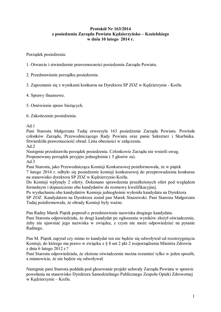 Protokół Nr 163/2014 z posiedzenia Zarządu Powiatu Kędzierzyńsko – Kozielskiego w dniu 10 lutego 2014 r. Porządek posiedzenia: 1. Otwarcie i stwierdzenie prawomocności posiedzenia Zarządu Powiatu. 2. Przedstawienie porządku posiedzenia. 3. Zapoznanie się z wynikami konkursu na Dyrektora SP ZOZ w Kędzierzynie - Koźlu 4. Sprawy finansowe. 5. Omówienie spraw bieżących. 6. Zakończenie posiedzenia. Ad.1 Pani Starosta Małgorzata Tudaj otworzyła 163 posiedzenie Zarządu Powiatu. Powitała członków Zarządu, Przewodniczącego Rady Powiatu oraz panie Sekretarz i Skarbnika. Stwierdziła prawomocność obrad. Lista obecności w załączeniu. Ad.2 Następnie przedstawiła porządek posiedzenia. Członkowie Zarządu nie wnieśli uwag. Proponowany porządek przyjęto jednogłośnie ( 5 głosów za). Ad.3 Pani Starosta, jako Przewodnicząca Komisji Konkursowej poinformowała, że w piątek 7 lutego 2014 r. odbyło się posiedzenie komisji konkursowej do przeprowadzenia konkursu na stanowisko dyrektora SP ZOZ w Kędzierzynie-Koźlu. Do Komisji wpłynęły 2 oferty. Dokonano sprawdzenia przedłożonych ofert pod względem formalnym i dopuszczono obu kandydatów do rozmowy kwalifikacyjnej. Po wysłuchaniu obu kandydatów Komisja jednogłośnie wyłoniła kandydata na Dyrektora SP ZOZ. Kandydatem na Dyrektora został pan Marek Staszewski. Pani Starosta Małgorzata Tudaj poinformowała, że obrady Komisji były ważne. Pan Radny Marek Piątek poprosił o przedstawienie nazwiska drugiego kandydata. Pani Starosta odpowiedziała, że drugi kandydat po ogłoszeniu wyników złożył oświadczenie, żeby nie ujawniać jego nazwiska w związku, z czym nie może odpowiedzieć na pytanie Radnego. Pan M. Piątek zapytał czy mimo to kandydat ten nie będzie się odwoływał od rozstrzygnięcia Komisji, do którego ma prawo w związku z § 8 ust 2 pkt 2 rozporządzenia Ministra Zdrowia z dnia 6 lutego 2012 r.? Pani Starosta odpowiedziała, że złożone oświadczenie można rozumieć tylko w jeden sposób, a mianowicie, że nie będzie się odwoływał. Następnie pani Starosta poddała pod głosowanie projekt uchwały Zarządu Powiatu w sprawie powołania na stanowisko Dyrektora Samodzielnego Publicznego Zespołu Opieki Zdrowotnej w Kędzierzynie – Koźlu. 1 W głosowaniu wzięło udział 5 członków Zarządu. 4 członków było „za”, 1 „przeciw”. Uchwałę Nr 163/630/2014 podjęto większością głosów. Następnie poproszono pana Marka Staszewskiego. Pani Starosta wręczyła panu Markowi Staszewskiemu uchwałę o powierzeniu mu stanowiska dyrektora SP ZOZ. W imieniu Zarządu pogratulowała panu Dyrektorowi wygranego konkursu i życzyła realizacji zamierzeń przedstawionych w trakcie prezentacji obiecując wsparcie Zarządu Powiatu. Do gratulacji Zarządu przyłączył się także pan Piotr Jahn Przewodniczący Rady Powiatu, który zaprosił pana Dyrektora na sesję w dniu 18 lutego 2014 r. Pan Dyrektor Marek Staszewski dziękując Zarządowi za zaufanie poinformował, że postawił sobie 2 cele: - poprawa sytuacji kadrowej i odbudowanie zaufania do SP ZOZ i Dyrekcji, - przeprowadzenie inwestycji niezbędnych do zapewnienia standardów szpitala. Pan Dyrektor poinformował także, że SP ZOZ rozpoczyna pracę nad przygotowaniem oferty na Ratownictwo Medyczne. Pani Starosta zapytała czy prawdą jest, że SP ZOZ zamierza zwolnić w najbliższym czasie 63 pielęgniarki? Pan Dyrektor odpowiedział, że zwolnienie 63 pielęgniarek dla szpitala byłoby katastrofą. Priorytetem aktualnie jest zatrudnienie, co najmniej 15 lekarzy. Pan M. Piątek zapytał, od kiedy zostanie uruchomiona patologia ciąży? Pan Dyrektor odpowiedział, że aktualnie prowadzone są prace malarskie i rozmowy z lekarzami. Pan Wicestarosta Józef Gisman zwrócił uwagę, żeby przedstawiając informację o sytuacji SP ZOZ pamiętać o tym, że szpitale przekształcone w spółki nie mają zobowiązań, bo przejęły je Powiaty, a nasz SP ZOZ sam spłaca swoje zobowiązania. Pan Radny Piątek pytał o planowane zwolnienia ratowników? Pan Dyrektor przypomniał, że w transporcie sanitarnym zatrudnionych jest 11 ratowników, z czego 3 przebywa na urlopach bezpłatnych. Przygotowując się do złożenia oferty na ratownictwo medyczne należy dysponować kadrą oraz karetkami o określonym roku produkcji. Następnie pan Marek Piątek zapytał o plany w stosunku do budynku przy ul. Judyma? Pan Dyrektor odpowiedział, że budynek jest własnością Powiatu i to Powiat będzie decydował, co zrobić z budynkiem, a nie Dyrektor SP ZOZ. Pani Starosta podziękowała panu Dyrektorowi życząc owocnej pracy na stanowisku. Ad.4 Na wniosek dyrektorów jednostek pani Wiesława Trelka przedstawiła projekt zmian w budżecie Powiatu Kędzierzyńsko – Kozielskiego polegających na zwiększeniu § 4040 dodatkowe wynagrodzenie roczne w PZO, a zmniejszeniu wydatków związanych z realizacją zadań statutowych o kwotę 2.177,00 zł. W Zespole Szkół Żeglugi Śródlądowej dokonuje się zmiany w części związanej z realizacją zadań jst ( wkład własny do projektu „Opolskie szkolnictwo zawodowe bliżej rynku pracy”. Zmiana ta polega na zmniejszeniu § 4219 zakup materiałów i wyposażenia o kwotę 9.136,00 zł i zwiększeniu § 4249 zakup pomocy dydaktycznych o tę samą kwotę w celu zabezpieczenia planu na zakup oprogramowania do komputerów w pracowniach informatycznych. 2 Pani Starosta poddała pod głosowanie przestawiony projekt uchwały. W głosowaniu wzięli udział wszyscy członkowie Zarządu. Uchwałę Nr 163/631/2014 w sprawie zmian w budżecie Powiatu Kędzierzyńsko – Kozielskiego na 2014 r. podjęto jednogłośnie. Następnie pani Skarbnik przedstawiła pismo Wydziału Ochrony Środowiska, Rolnictwa i Leśnictwa w sprawie ujęcia zadania pn. „ Współpraca z Wojewódzkim Inspektoratem Ochrony Środowiska w Opolu dotycząca badania jakości powietrza oraz wód na terenie Powiatu Kędzierzyńsko – Koziel