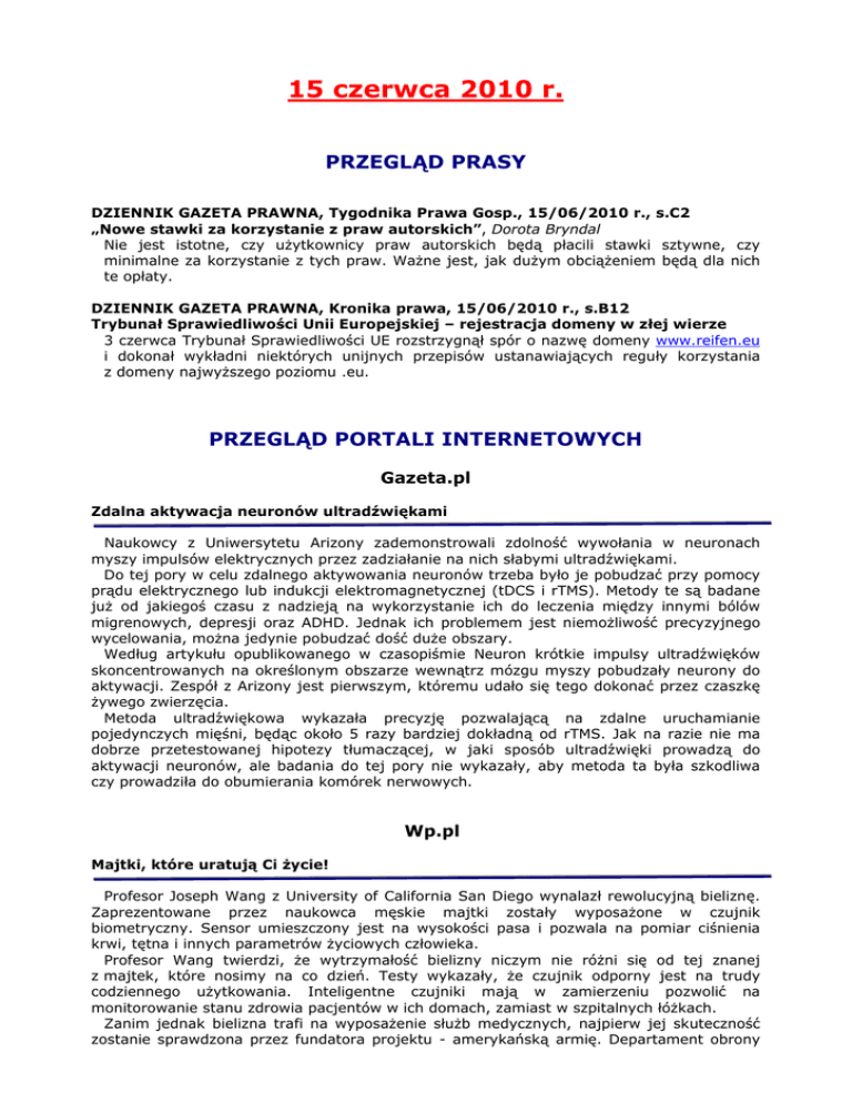 15 czerwca 2010 r. PRZEGLĄD PRASY DZIENNIK GAZETA PRAWNA, Tygodnika Prawa Gosp., 15/06/2010 r., s.C2 „Nowe stawki za korzystanie z praw autorskich”, Dorota Bryndal Nie jest istotne, czy użytkownicy praw autorskich będą płacili stawki sztywne, czy minimalne za korzystanie z tych praw. Ważne jest, jak dużym obciążeniem będą dla nich te opłaty. DZIENNIK GAZETA PRAWNA, Kronika prawa, 15/06/2010 r., s.B12 Trybunał Sprawiedliwości Unii Europejskiej – rejestracja domeny w złej wierze 3 czerwca Trybunał Sprawiedliwości UE rozstrzygnął spór o nazwę domeny www.reifen.eu i dokonał wykładni niektórych unijnych przepisów ustanawiających reguły korzystania z domeny najwyższego poziomu .eu. PRZEGLĄD PORTALI INTERNETOWYCH Gazeta.pl Zdalna aktywacja neuronów ultradźwiękami Naukowcy z Uniwersytetu Arizony zademonstrowali zdolność wywołania w neuronach myszy impulsów elektrycznych przez zadziałanie na nich słabymi ultradźwiękami. Do tej pory w celu zdalnego aktywowania neuronów trzeba było je pobudzać przy pomocy prądu elektrycznego lub indukcji elektromagnetycznej (tDCS i rTMS). Metody te są badane już od jakiegoś czasu z nadzieją na wykorzystanie ich do leczenia między innymi bólów migrenowych, depresji oraz ADHD. Jednak ich problemem jest niemożliwość precyzyjnego wycelowania, można jedynie pobudzać dość duże obszary. Według artykułu opublikowanego w czasopiśmie Neuron krótkie impulsy ultradźwięków skoncentrowanych na określonym obszarze wewnątrz mózgu myszy pobudzały neurony do aktywacji. Zespół z Arizony jest pierwszym, któremu udało się tego dokonać przez czaszkę żywego zwierzęcia. Metoda ultradźwiękowa wykazała precyzję pozwalającą na zdalne uruchamianie pojedynczych mięśni, będąc około 5 razy bardziej dokładną od rTMS. Jak na razie nie ma dobrze przetestowanej hipotezy tłumaczącej, w jaki sposób ultradźwięki prowadzą do aktywacji neuronów, ale badania do tej pory nie wykazały, aby metoda ta była szkodliwa czy prowadziła do obumierania komórek nerwowych. Wp.pl Majtki, które uratują Ci życie! Profesor Joseph Wang z University of California San Diego wynalazł rewolucyjną bieliznę. Zaprezentowane przez naukowca męskie majtki zostały wyposażone w czujnik biometryczny. Sensor umieszczony jest na wysokości pasa i pozwala na pomiar ciśnienia krwi, tętna i innych parametrów życiowych człowieka. Profesor Wang twierdzi, że wytrzymałość bielizny niczym nie różni się od tej znanej z majtek, które nosimy na co dzień. Testy wykazały, że czujnik odporny jest na trudy codziennego użytkowania. Inteligentne czujniki mają w zamierzeniu pozwolić na monitorowanie stanu zdrowia pacjentów w ich domach, zamiast w szpitalnych łóżkach. Zanim jednak bielizna trafi na wyposażenie służb medycznych, najpierw jej skuteczność zostanie sprawdzona przez fundatora projektu - amerykańską armię. Departament obrony USA oczekuje, że nowy wynalazek pozwoli na określenie rodzaju obrażeń u rannego żołnierza i ułatwi jego leczenie na polu walki lub w szpitalu polowym. W dalszym etapie projekt inteligentnej bielizny ma umożliwić nie tylko określenie, że żołnierz został ranny, ale również stwierdzenie dokładnej lokalizacji obrażenia, a nawet zaaplikowanie odpowiedniej dawki środka znieczulającego lub innego leku. Oprócz zastosowań wojskowych profesor Wang opowiada o szerokich możliwościach jakie daje jego wynalazek. Możliwe ma być zdalne monitorowanie stanu zdrowia osób starszych, chorych na cukrzycę czy zawartości alkoholu we krwi. Nas ciekawi czy poza odpornością materiału czujnika na normalne użytkowanie, przewidziano również odporność na wielokrotne pranie inteligentnej bielizny? Gadżetomania.pl Japońscy fizycy odkryli dziesiątki nowych izotopów W japońskim laboratorium RIKEN rozwiązał się worek z nieznanymi nuklidami. W trwającym zaledwie 4 dni eksperymencie odkryto aż 45 (!) nowych izotopów. A naukowcy stojący za odkryciem twierdzą, że to dopiero początek. Na wstępie mała powtórka z chemii. Na dzień dzisiejszy układ okresowy Mendelejewa zawiera 118 pozycji. O każdym z pierwiastków wiadomo jednak, że ma wiele izotopów, tj. “wersji” różniących się liczbą neutronów w jądrze. Przykładowo jednoprotonowy wodór ma odmianę pozbawioną neutronów, ale także taką z jednym, dwoma, a nawet sześcioma tymi cząstkami. Gdy zliczymy wszystkie znane izotopy wszystkich pierwiastków, czyli wszystkie tzw. nuklidy, to okaże się, że jest ich grubo ponad 3000 i liczba ta stale rośnie. Tylko ok. 10% spośród znanych nuklidów występuje naturalnie na Ziemi. Pozostałe (wszystkie, co do jednego, niestabilne) uzyskano na drodze różnorakich przemian jądrowych. Jednym ze sposobów na wyprodukowanie egzotycznego pierwiastka jest rozpędzanie wiązki znanych izotopów w akceleratorze i bombardowanie nimi tarczy wykonanej np. z berylu lub ołowiu. Właśnie tak (w uproszczeniu) postąpili fizycy z japońskiego Instytutu Badań Fizycznych i Chemicznych (RIKEN) w pobliżu Tokio. Ich kosztujące pół miliarda dolarów urządzenie zwane Radioactive Isotopes Beam Factory (RIBF, co można tłumaczyć jako Fabryka Wiązek Izotopów Radioaktywnych) składa się z szeregu cyklotronów (rodzaj akceleratora cząstek) oraz ultranowoczesnego separatora zwanego BigRIPS, którego rolą jest zebranie i przeanalizowanie produktów zderzenia wiązki z tarczą. Ta najnowocześniejsza na świecie maszyna tego typu okazała się istną wytwórnią nowych nuklidów. Po uruchomieniu RIBF w 2007 r. już w czasie pierwszych, kalibracyjnych eksperymentów odkryto dwa nowe izotopy palladu. Pod koniec roku 2008 uczeni zachęceni tym wynikiem przeprowadzili trwającą cztery dni serię zderzeń przy użyciu silniejszej wiązki. Po trwającej półtora roku (!) analizie rezultatów badacze ogłosili światu odkrycie 45 bogatych w neutrony nuklidów: od manganu-71 