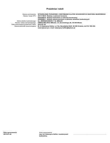 Przedmiar robót Nazwa zamówienia: Nazwy i kody CPV: Adres obiektu budowlanego: Nazwa i adres zamawiającego: Data opracowania przedmiaru robót: Nazwa jednostki opracowującej: Data opracowania: 2015-07-24 WYDZIELENIE POŻAROWE I ODDYMIANIE KLATEK SCHODOWYCH BUDYNKU BIUROWEGO 45111100-9 Roboty w zakresie burzenia 45223000-6 Roboty budowlane w zakresie konstrukcji 45400000-1 Roboty wykończeniowe w zakresie obiektów budowlanych UL. BIERNACKIEGO 1 16, MIELEC GMINA MIEJSKA MIELEC, Ul. Żeromskiego 26, 39-300 Mielec 2015-07-24 B+ N Katarzyna Hallier; ul. Św. Benedykta 6A/8, 30-536 Kraków, tel.512 190 434; www.bplusn.pl, e-mail: [email protected] Autor opracowania: mgr inż. Katarzyna Hallier, kosztorysant budowlany ........................................................................................ WYDZIELENIE POŻAROWE I ODDYMIANIE KLATEK SCHODOWYCH BUDYNKU BIUROWEGO ZUZIA11 (C) Datacomp 1994-2014 (lic. 00053C7B) Spis działów przedmiaru robót Nr 1 1.1 1.2 1.3 2 2.1 2.2 2.3 Nazwa działu robót Kody CPV: 45111100-9 Roboty w zakresie burzenia 45223000-6 Roboty budowlane w zakresie konstrukcji 45400000-1 Roboty wykończeniowe w zakresie obiektów budowlanych KLATKA SCHODOWA NR 1 Kody CPV: 45111100-9 Roboty w zakresie burzenia ROBOTY PRZYGOTOWAWCZE I ROZBIÓRKOWE Kody CPV: 45223000-6 Roboty budowlane w zakresie konstrukcji PRACE BUDOWLANE KONSTRUKCYJNE Kody CPV: 45400000-1 Roboty wykończeniowe w zakresie obiektów budowlanych PRACE BUDOWLANE WYKOŃCZENIOWE Kody CPV: 45111100-9 Roboty w zakresie burzenia 45223000-6 Roboty budowlane w zakresie konstrukcji 45400000-1 Roboty wykończeniowe w zakresie obiektów budowlanych KLATKA SCHODOWA NR 2 Kody CPV: 45111100-9 Roboty w zakresie burzenia ROBOTY PRZYGOTOWAWCZE I ROZBIÓRKOWE Kody CPV: 45223000-6 Roboty budowlane w zakresie konstrukcji PRACE BUDOWLANE KONSTRUKCYJNE Kody CPV: 45400000-1 Roboty wykończeniowe w zakresie obiektów budowlanych PRACE BUDOWLANE WYKOŃCZENIOWE 2015-07-24 strona nr: 2 WYDZIELENIE POŻAROWE I ODDYMIANIE KLATEK SCHODOWYCH BUDYNKU BIUROWEGO ZUZIA11 (C) Datacomp 1994-2014 (lic. 00053C7B) Przedmiar robót <-NR-> <-PODST-> Nr <-KOD-> Kod pozycji <-OPIS-> Opis robót, wyliczenie ilości robót Jm Ilość ROBOTY PRZYGOTOWAWCZE I ROZBIÓRKOWE 1.A.1 ST.01.01.00 Wyliczenie ilości robót: Zabezpieczenie stolarki okiennej i drzwiowej folią 1,00*2,05+3*1,35*1,26 RAZEM: 1.1.2 <-ILOSC-> WYDZIELENIE POŻAROWE I ODDYMIANIE KLATEK SCHODOWYCH BUDYNKU BIUROWEGO KLATKA SCHODOWA NR 1 1 1.1 1.1.1 <-JEDN-> STWiOR 1.A.2 ST.01.01.00 Wyliczenie ilości robót: 7,153 7,153 m2 7,153 Zabezpieczenie podłóg folią (33,401+27,201)*1,05 1.1.3 1.A.3 ST.01.01.00 Wyliczenie ilości robót: 63,632 RAZEM: 63,632 m2 Rozbiórki lekkiej obudowy jednostronnej ścian bez ocieplenia (szklone I, II, III piętro) 2,77*2,9+2,77*2,9+2,77*2,75 1.1.4 1.A.4 ST.01.01.00 23,684 RAZEM: 23,684 m2 Najprostsze konstrukcje ścian i dachów - rozbiórka, szkielet ścian (PCV i drewniane I,II,III piętro) 63,632 23,684 Wyliczenie ilości robót: 2,77*2,9+2,77*2,9+2,77*2,75 RAZEM: 1.1.5 1.A.5 ST.01.01.00 Wyliczenie ilości robót: 23,684 23,684 m2 23,684 Rozbiórki lekkiej obudowy jednostronnej dachu z ociepleniem 1,10*1,10*1,05 1.1.6 1.A.6 ST.01.01.00 1,271 RAZEM: 1,271 m2 Wywiezienie gruzu z terenu rozbiórki przy mechanicznym załadowaniu i wyładowaniu, transport samochodem samowyładowczym na odległość 1 km 1,271 Wyliczenie ilości robót: (23,68+1,27)*0,1*1,4 1.1.7 1.A.7 ST.01.01.00 3,493 RAZEM: 3,493 m3 Wywiezienie gruzu z terenu rozbiórki przy mechanicznym załadowaniu i wyładowaniu, nakłądy uzupełniające na każdy dalszy rozpoczęty 1˙km ponad 1˙km transportu 3,493 Wyliczenie ilości robót: 3,49 RAZEM: 1.2 1.2.1 3,490 3,490 m3 3,490 PRACE BUDOWLANE KONSTRUKCYJNE 1.B.1 ST.01.01.00 Wykucia mechaniczne bruzd w konstrukcjach monolitycznych żelbetowych (wykucie gniazd w wieńcu żelbetowym do osadzenia belek stalowych Bs1) Wyliczenie ilości robót: 0,30*0,15*0,28*4 1.2.2 1.B.2 ST.02.01.01 0,050 RAZEM: 0,050 m3 Zbrojenie konstrukcji żelbetowych elementów, przygotowanie i montaż zbrojenia, elementy budynków i budowli, pręty żebrowane (zbrojenie poduszek betonowych) 0,050 Wyliczenie ilości robót: 0,001*140*0,018 1.2.3 1.B.3 ST.02.01.02 Wyliczenie ilości robót: RAZEM: Układanie betonu w elementach konstrukcyjnych, betonowanie poduszek. 0,003 0,003 t 0,3*0,15*0,1*4 1.2.4 1.B.4 ST.02.02.00 0,018 RAZEM: 0,018 m3 Uzupełnienie sklepień płaskich Kleina, wciągnięcie i ułożenie belek stalowych (Belki Bs1 do osadzenia na gotowych gniazdach) 0,003 0,018 Wyliczenie ilości robót: 2*3,17 1.2.5 1.B.5 ST.02.02.00 6,340 RAZEM: 6,340 m Uzupełnienie sklepień płaskich Kleina, wciągnięcie i ułożenie belek stalowych (belki Bs2 przeznaczone do spawania) 6,340 Wyliczenie ilości robót: 2*1,22 RAZEM: 2015-07-24 2,440 2,440 m strona nr: 2,440 3 WYDZIELENIE POŻAROWE I ODDYMIANIE KLATEK SCHODOWYCH BUDYNKU BIUROWEGO <-NR-> Nr 1.2.6 <-PODST-> <-KOD-> Kod pozycji STWiOR 1.B.6 ST.02.02.00 Wyliczenie ilości robót: ZUZIA11 (C) Datacomp 1994-2014 (lic. 00053C7B) <-OPIS-> <-JEDN-> Opis robót, wyliczenie ilości robót Spawanie belek stalowych ponad 160˙mm (Belki Bs2) Jm <-ILOSC-> Ilość 2 1.2.7 1.B.7 ST.02.01.02 2,000 RAZEM: 2,000 szt Zabetonowanie otworów w stropach i ścianach, otwory do 0,1˙m2, głębokość ponad 10˙cm (zabetonowanie końców belek Bs1 w gniazdach) 2,000 Wyliczenie ilości robót: 4 1.2.8 1.B.8 ST.02.02.00 4,000 RAZEM: 4,000 szt Mocowanie elementów za pomocą kotew mechanicznych, rozprężnych, ocynkowanych do podłoża z cegły pełnej, kotwy łączące, średnica otworu 20 mm (kotwy do mocowania belek stalowych do stropu żelbetowego wg projektu konstrukcji) 4,000 Wyliczenie ilości robót: 26 1.2.9 1.B.9 ST.01.01.00 26,000 RAZEM: 26,000 szt Wykucia mechaniczne otworów w konstrukcjach monolitycznych żelbetowych (wykucie otworu w stropie) 26,000 Wyliczenie ilości robót: 1,1*1,1*0,2 1.2.10 1.B.10 ST.01.01.00 0,242 RAZEM: 0,242