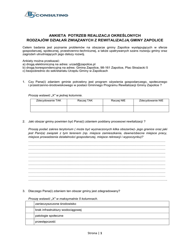 ANKIETA POTRZEB REALIZACJI OKREŚLONYCH RODZAJÓW DZIAŁAŃ ZWIĄZANYCH Z REWITALIZACJĄ GMINY ZAPOLICE Celem badania jest poznanie problemów na obszarze gminy Zapolice występujących w sferze gospodarczej, społecznej, przestrzenno-technicznej, a także upatrywanych szans rozwoju gminy oraz zagrożeń utrudniających jego dalszy rozwój. Ankiety można przekazać: a) drogą elektroniczną na adres: [email protected] b) drogą korespondencyjną na adres: Gmina Zapolice, 98-161 Zapolice, Plac Strażacki 5 c) bezpośrednio do sekretariatu Urzędu Gminy w Zapolicach 1. Czy Pana(i) zdaniem gminie potrzebny jest program ożywienia gospodarczego, społecznego i przestrzenno-środowiskowego w postaci Gminnego Programu Rewitalizacji Gminy Zapolice ? Proszę wstawić „X” w jednej kolumnie. Zdecydowanie TAK Raczej TAK Raczej NIE Zdecydowanie NIE 2. Jaki obszar gminy powinien być Pana(i) zdaniem poddany procesowi rewitalizacji ? Proszę podać zakres terytorium ( może być wyznaczonych kilka obszarów)- jego granice oraz jaki jest Pani(a) związek z tym terenem (np. miejsce zamieszkania, dawne/obecne miejsce pracy, miejsce prowadzenia działalności gospodarczej, miejsce rekreacji i wypoczynku)? ………………………………………………………………………………………………………………… ………………………………………………………………………………………………………………… ………………………………………………………………………………………………………………… ………………………………………………………………………………………………………………… ………………………………………………………………………………………………………………… ………………………………………………………………………………………………………………… ………………………………………………………………………………………………………………… ………………………………………………………………………………………………………………… ………………………………………………………………………………………………………………… ………………………………………………………………………………………………………………… ………………………………………………………………………………………………………………….. 3. Dlaczego Pana(i) zdaniem ten obszar gminy jest zdegradowany? Proszę wstawić „X” w maksymalnie 5 kolumnach. zanieczyszczone środowisko brak infrastruktury wodociągowej patologie społeczne przestępczość Strona | 1 brak miejsc pracy małe zasoby mieszkaniowe słaby rozwój handlu i usług słabo rozwinięta baza turystyczna i rekreacyjno-wypoczynkowa zły stan dróg i komunikacji zły stan zabytków Inne (wpisać jakie): 4. Jakie problemy ekonomiczne, na wskazanym obszarze, chciałby Pan(i) rozwiązać w procesie rewitalizacji ? Proszę wstawić „X” w maksymalnie 4 kolumnach. brak miejsc pracy brak, lub zła jakość terenów inwestycyjnych brak lub zbyt mała ilość połączeń komunikacyjnych z innymi ośrodkami brak wsparcia dla małych i średnich przedsiębiorstw zła gospodarka odpadami, ściekami niewystarczająca ilość i niski standard mieszkań zły stan zabytków słaby rozwój handlu niewielka ilość (mała aktywność) małych i średnich przedsiębiorstw Inne (wpisać jakie) 5. Jakie problemy społeczne, na wskazanym obszarze, chciałby Pan(i) rozwiązać w procesie rewitalizacji ? Proszę wstawić „X” w maksymalnie 6 kolumnach. przestępczość bezrobocie bieda alkoholizm przemoc w rodzinie Strona | 2 narkomania przestępczość młodocianych chuligaństwo utrudniony dostęp społeczeństwa do dobrych szkół niedobór organizacji pomagających w znalezieniu pracy (przekwalifikowanie, szkolenia) brak dostępu do nowoczesnej technologii (komputer, internet) emigracja z gminy młodych i dobrze wykształconych osób Inne (wpisać jakie) 6. Jakie problemy związane z jakością życia, na wskazanym obszarze, chciałby Pan(i) rozwiązać w procesie rewitalizacji ? Proszę wstawić „X” w maksymalnie 4 kolumnach. zły stan estetyczny otoczenia zły stan infrastruktury wokół budynków zły stan infrastruktury oświatowej brak instytucji, organizacji integrujących mieszkańców danych sołectw brak lub słaba aktywność ośrodków kulturalno-rekreacyjnych i sportowych w pobliżu miejsca zamieszkania brak poczucia bezpieczeństwa w okolicy zamieszkania słaby przepływ informacji w sprawach dotyczących najbliższego otoczenia zamieszkania słaba samoorganizacja społeczna i współpraca między mieszkańcami a władzami publicznymi Inne (wpisać jakie) 7. Jakie zostaną osiągnięte efekty, według Pana(i), w procesie rewitalizacji ? Proszę wstawić „X” w maksymalnie 6 kolumnach. bardziej wykształcone społeczeństwo poprawa bezpieczeństwa na drogach zwiększenie ilości miejsc pracy przyciągnięcie dużych inwestorów rozwój małej i średniej przedsiębiorczości stworzenie lub rozszerzenie bazy turystycznej poprawienie jakości i estetyki środowiska naturalnego eliminacja patologii w społeczeństwie podniesienie standardu życia społeczeństwa Strona | 3 zatrzymanie w gminie Zapolice ludzi młodych i wykształconych polepszenie komunikacji na terenie gminy Zapolice zwiększenie ilości i poprawa jakości punktów handlowych, rzemieślniczych i usługowych. Inne (wpisać jakie) 8. Na jakie przedsięwzięcia, które zamierzałby Pan(i) zrealizować w ramach programu rewitalizacji, chciałby Pan(i) otrzymać wsparcie finansowe ? …………………………………………………………………………………………………………