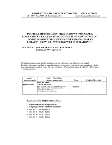 PROJEKTOWANIE ARCHITEKTONICZNE ANNA KONDEJ 26 - 600 RADOM ul. Komunalna 143 e-mail: [email protected] PROJEKT BUDOWLANY PRZEBUDOWY POSADZEK KORYTARZY I KLATEK SCHODOWYCH W PAWILONIE „C” DOMU POMOCY SPOŁECZNEJ WETERANA WALKI I PRACY PRZY UL. WYŚCIGOWEJ 16 W RADOMIU INWESTOR : DPS WETERANA WALKI I PRACY Radom, ul. Wyścigowa 16 Niniejsze opracowanie jest kompletne z punktu widzenia celu, któremu ma służyć. Zostało wykonane zgodnie z obowiązującymi przepisami, normami oraz zasadami wiedzy technicznej oraz zgodnie z art. 20, ust. 4 ustawy – Prawo budowlane (j.t. Dz.U. z 2013 poz. 1409 z póź. zm.). Autor opracowania Architektura Imię i Nazwisko Numer uprawnień mgr inż. arch. ANNA KONDEJ UPR. BUDOWLANE DO PROJEKTOWANIA BEZ OGRANICZEŃ W SPECJALNOŚCI ARCHITEKTONICZNEJ NR EWID. GP-III-7342/107/93 ZAWARTOŚĆ OPRACOWANIA : I. Opis techniczny do projektu II. Część graficzna architektoniczna rys. nr 1 - rzut parteru rys. nr 2 - rzut 1 piętra rys. nr 3 - rzut 2 piętra rys. nr 4 - rzut 3 piętra Data 02.2015 Podpis/Pieczątka PAWILON C - DPS WETERANA WALKI I PRACY W RADOMIU , UL. WYŚCIGOWA 16 OPIS TECHNICZNY DO PROJEKTU BUDOWLANEGO 1. PRZEDMIOT OPRACOWANIA Przedmiotem opracowania jest projekt budowlany przebudowy posadzek korytarzy i klatek schodowych w segmencie mieszkalnym - pawilon „C” DPS Weterana Walki i Pracy przy ul. Wyścigowej 16 w Radomiu. 2. PODSTAWA OPRACOWANIA Zlecenie Inwestora. Wizja lokalna i inwentaryzacja. 3. STAN ISTNIEJĄCY 3.1. Dane ogólne o zespole budynków DPS Zespół budynków DPS składa się z 4 pawilonów mieszkalnych, budynku stołówki i budynku pralni połączonych ze sobą parterowym łącznikiem zapewniającym wewnętrzną komunikację pomiędzy wszystkimi częściami budynku. Budynki zaprojektowano w systemie prefabrykowanym wielkopłytowym W-70 o podstawowych rozpiętościach konstrukcyjnych 6.0, 4.80, 3.60 i 2.40 m . Wysokość pomieszczeń mieszkalnych – 2.58m. Przeznaczony do remontu pawilon „C” posiada cztery kondygnacje nadziemne. Pawilon posiada układ korytarzowy z 2 klatkami schodowymi oraz 2 szybami windowymi. 3.2. Konstrukcja pawilonu „C” Układ ścian nośnych – poprzeczny, dla korytarzy – podłużny. Ławy fundamentowe – wylewane z betonu żwirowego. Ściany nadziemia - elementy prefabrykowane systemu W-70, - ścianki działowe gipsowe PROMONTA i z cegły dziurawki. Klatki schodowe dwubiegowe z elementów prefabrykowanych. Stropy międzypiętrowe – płyty kanałowe żelbetowe z uzupełnieniami żelbetowymi wylewanymi. Stropodach – wentylowany z płyt prefabrykowanych systemu W-70. 2 PAWILON C - DPS WETERANA WALKI I PRACY W RADOMIU , UL. WYŚCIGOWA 16 3.3. Ocena stanu technicznego budynku. Ogólny stan techniczny budynku jest dobry. Posadzki ciągów komunikacyjnych w pawilonie „C” przeznaczone do przebudowy są w złym stanie technicznym. Istniejąca wykładzina PVC nie przylega do podłoża, jest nierówna i zniszczona. Przebudowy wymagają również lastrykowe nawierzchnie spoczników i schodów w klatkach schodowych. 4. PROJEKTOWANE PRACE BUDOWLANE 4.1 Zerwanie posadzki z PVC Wszystkie wykładziny PVC na korytarzach parteru i pięter przeznacza się do zerwania i utylizacji. 4.2 Przygotowanie powierzchni pod ułożenie nowej wykładziny Wszystkie posadzki lastrykowe na klatkach schodowych i w wiatrołapach należy zmatowić. Pozostałe powierzchnie korytarzy po zerwaniu wykładziny PVC należy oczyścić z nawarstwień, wylewek i resztek kleju. Na całej powierzchni korytarzy ułożyć folię budowlaną z około 20 – centymetrowymi zakładkami wywiniętymi na ściany. Następnie należy wykonać wylewkę grubości od 3,0 do 4,0cm (w zależności od poziomu podłóg pomieszczeń przylegających do korytarzy) wzmocnioną siatką zbrojeniową lub alternatywnie zastosować masę podkładową, nie wymagającą zbrojenia, zawierającą np. mikrowłókna. Powierzchnię podkładu przekraczająca 25,0m2 należy podzielić dylatacjami. Na całej powierzchni korytarzy, wiatrołapów i biegów klatek schodowych należy wykonać warstwę wyrównującą z zaprawy samopoziomującej gr. 5mm. 4.3. Ułożenie nowej wykładziny PVC Na korytarzach i klatkach schodowych zaprojektowano wykładzinę PVC grubości. minimum 2mm. Wykładzina powinna posiadać właściwości antypoślizgowe, powinna być trwała, zmywalna, nienasiąkliwa i odporna na działanie środków dezynfekcyjnych. Cokoły przy podłogach wykonane do wysokości 15,0cm. W celu łatwiejszego utrzymania w czystości ciągów komunikacyjnych styki cokołów z płaszczyzną posadzki powinny być zaokrąglone. Wywinięcia wykładziny na ścianę w tym samym kolorze co wykładzina posadzki w tym miejscu. W progach do pomieszczeń przylegających do wymienionej wykładziny należy zamontować listwy aluminiowe. 3 PAWILON C - DPS WETERANA WALKI I PRACY W RADOMIU , UL. WYŚCIGOWA 16 Aby utrzymać poziom podłóg z zachowaniem warunku maksymalnej wysokości progu 2,0 cm należy dobrać grubości warstw izolacyjnych i podkładowych do stanu istniejącego. Należy dotrzymać warunku suchości podkładów poprzez sprawdzenie ich wilgotności. 5. KOLORYSTYKA Dla posadzek z PCV przyjęto kolory wg wzornika Tarkett. Przy zastosowaniu innych kolorów wykładzin kolory uzgodnić z projektantem. W projekcie przyjęto: 5.1. Parter posadzka PVC w kolorze jasno-szarym wg wzornika Tarkett 18 382 posadzka PVC w kolorze jasno-beżowym wg wzornika Tarkett 18 370 posadzka PVC w kolorze zielonym wg wzornika Tarkett 18 381 cokoły w kolorze wykładziny dochodzącej do ściany 5.2. Pierwsze piętro posadzka PVC w kolorze jasno-szarym wg wzornika Tarkett 18 382 posadzka PVC w kolorze jasno-beżowym wg wzornika Tarkett 18 370 posadzka PVC w kolorze pomarańczowym wg wzornika Tarkett 18 375 cokoły w kolorze wykładziny dochodzącej do ściany 5.3. Drugie piętro posadzka PVC w kolorze jasno-szarym wg wzornika Tarkett 18 382 posadzka PVC w kolorze jasno-beżowym wg wzornika Tarket