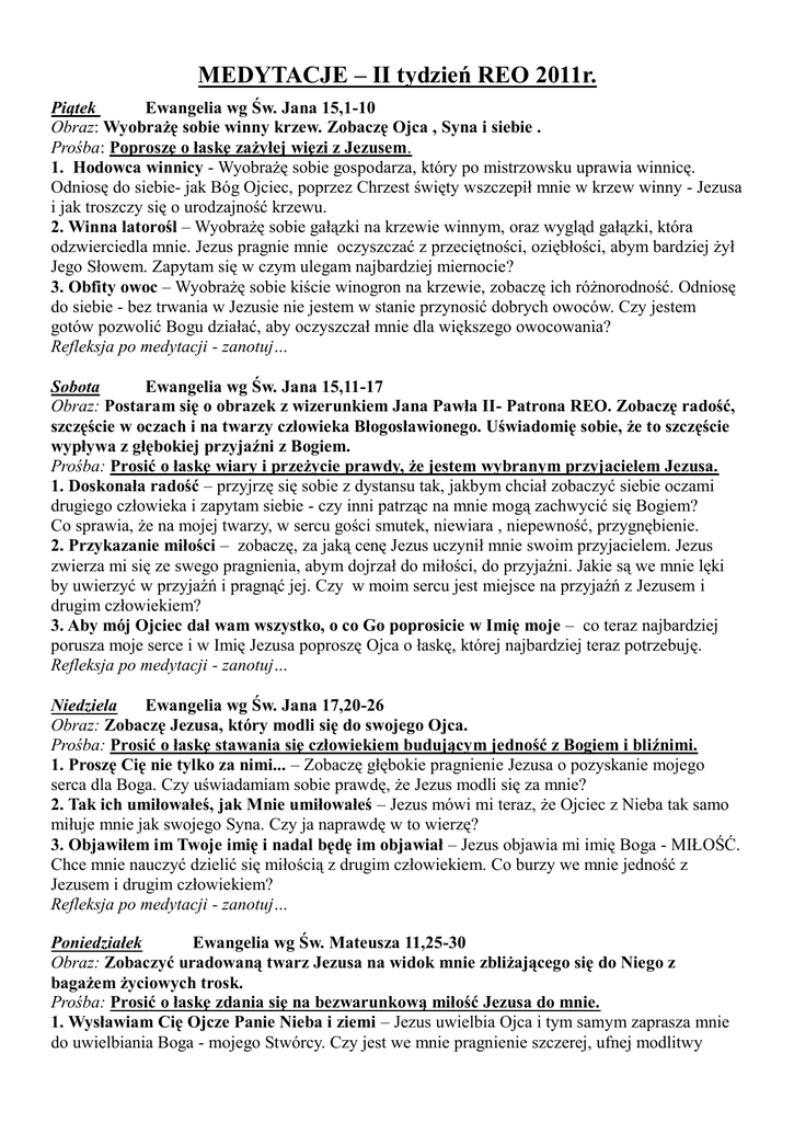 MEDYTACJE – II tydzień REO 2011r. Piątek Ewangelia wg Św. Jana 15,1-10 Obraz: Wyobrażę sobie winny krzew. Zobaczę Ojca , Syna i siebie . Prośba: Poproszę o łaskę zażyłej więzi z Jezusem. 1. Hodowca winnicy - Wyobrażę sobie gospodarza, który po mistrzowsku uprawia winnicę. Odniosę do siebie- jak Bóg Ojciec, poprzez Chrzest święty wszczepił mnie w krzew winny - Jezusa i jak troszczy się o urodzajność krzewu. 2. Winna latorośl – Wyobrażę sobie gałązki na krzewie winnym, oraz wygląd gałązki, która odzwierciedla mnie. Jezus pragnie mnie oczyszczać z przeciętności, oziębłości, abym bardziej żył Jego Słowem. Zapytam się w czym ulegam najbardziej miernocie? 3. Obfity owoc – Wyobrażę sobie kiście winogron na krzewie, zobaczę ich różnorodność. Odniosę do siebie - bez trwania w Jezusie nie jestem w stanie przynosić dobrych owoców. Czy jestem gotów pozwolić Bogu działać, aby oczyszczał mnie dla większego owocowania? Refleksja po medytacji - zanotuj… Sobota Ewangelia wg Św. Jana 15,11-17 Obraz: Postaram się o obrazek z wizerunkiem Jana Pawła II- Patrona REO. Zobaczę radość, szczęście w oczach i na twarzy człowieka Błogosławionego. Uświadomię sobie, że to szczęście wypływa z głębokiej przyjaźni z Bogiem. Prośba: Prosić o łaskę wiary i przeżycie prawdy, że jestem wybranym przyjacielem Jezusa. 1. Doskonała radość – przyjrzę się sobie z dystansu tak, jakbym chciał zobaczyć siebie oczami drugiego człowieka i zapytam siebie - czy inni patrząc na mnie mogą zachwycić się Bogiem? Co sprawia, że na mojej twarzy, w sercu gości smutek, niewiara , niepewność, przygnębienie. 2. Przykazanie miłości – zobaczę, za jaką cenę Jezus uczynił mnie swoim przyjacielem. Jezus zwierza mi się ze swego pragnienia, abym dojrzał do miłości, do przyjaźni. Jakie są we mnie lęki by uwierzyć w przyjaźń i pragnąć jej. Czy w moim sercu jest miejsce na przyjaźń z Jezusem i drugim człowiekiem? 3. Aby mój Ojciec dał wam wszystko, o co Go poprosicie w Imię moje – co teraz najbardziej porusza moje serce i w Imię Jezusa poproszę Ojca o łaskę, której najbardziej teraz potrzebuję. Refleksja po medytacji - zanotuj… Niedziela Ewangelia wg Św. Jana 17,20-26 Obraz: Zobaczę Jezusa, który modli się do swojego Ojca. Prośba: Prosić o łaskę stawania się człowiekiem budującym jedność z Bogiem i bliźnimi. 1. Proszę Cię nie tylko za nimi... – Zobaczę głębokie pragnienie Jezusa o pozyskanie mojego serca dla Boga. Czy uświadamiam sobie prawdę, że Jezus modli się za mnie? 2. Tak ich umiłowałeś, jak Mnie umiłowałeś – Jezus mówi mi teraz, że Ojciec z Nieba tak samo miłuje mnie jak swojego Syna. Czy ja naprawdę w to wierzę? 3. Objawiłem im Twoje imię i nadal będę im objawiał – Jezus objawia mi imię Boga - MIŁOŚĆ. Chce mnie nauczyć dzielić się miłością z drugim człowiekiem. Co burzy we mnie jedność z Jezusem i drugim człowiekiem? Refleksja po medytacji - zanotuj… Poniedziałek Ewangelia wg Św. Mateusza 11,25-30 Obraz: Zobaczyć uradowaną twarz Jezusa na widok mnie zbliżającego się do Niego z bagażem życiowych trosk. Prośba: Prosić o łaskę zdania się na bezwarunkową miłość Jezusa do mnie. 1. Wysławiam Cię Ojcze Panie Nieba i ziemi – Jezus uwielbia Ojca i tym samym zaprasza mnie do uwielbiania Boga - mojego Stwórcy. Czy jest we mnie pragnienie szczerej, ufnej modlitwy uwielbienia? 2. Mój Ojciec przekazał mi wszystko – uświadomię sobie głębiej prawdę że Ojciec wskazuje na Jezusa jako tego przez którego poznaję miłość Ojca do mnie. Czy czuję, że Bóg Ojciec jest moim Ojcem? Czy potrafię powiedzieć do Niego Tatusiu? 3. Przyjdźcie do mnie wszyscy utrudzeni, obciążeni – usłyszę jak Jezus zaprasza mnie bardzo osobiście. Nazwę ciężary, które dźwigam i powiem o nich Jezusowi. Refleksja po medytacji - zanotuj… Wtorek Ewangelia wg Św. Łukasza 11,1-13 Obraz: Zobaczę Jezusa z uczniami, którzy przyznają się w szczerości do tego, że mają problemy z modlitwą. -Prośba: Proszę dar zaufania Ojcu oraz łaskę szczerej osobistej modlitwy. 1. „Panie naucz nas modlić się” – Uczeń na widok modlącego się Jezusa zapragnął głębokiej osobistej modlitwy. Zbadam moje serce czy jest w nim podobne pragnienie? 2. „Gdy się modlicie, mówcie Ojcze Nasz” – z ufnej modlitwy rodzi się wielki pokój. Spróbuję bardzo powoli odmówić modlitwę „Ojcze Nasz” i zobaczę, które słowo z Modlitwy Pańskiej rodzi w moim sercu pokój? 3. Ojciec z Nieba da Ducha Św. tym, którzy Go proszą – Jezus wskazuje największy dar o który trzeba prosić Ojca - dar Ducha Świętego. Zobaczę o co najczęściej proszę Boga: o zdrowie, za moich bliskich..., a jak często proszę o dar Ducha Świętego? Refleksja po medytacji - zanotuj… Środa Ewangelia wg Św. Marka 10,13-16 Obraz: Zobaczyć Jezusa trzymającego dzieci w objęciach. Prośba: Prosić o łaskę bycia dzieckiem przed Bogiem. 1. Przynoszono do Niego dzieci – zobaczę co nie pozwala mi stanąć jak dziecko przed Bogiem: duma, pycha, intelekt, rozum, względy ludzkie, lęk...? 2. Pozwólcie dzieciom przychodzić do mnie – Jezus oburza się gdy uczniowie zabraniają dzieciom zbliżać się do Niego. Zobaczę własne zahamowania, ograniczenia jakie stawiam sobie i bliźnim w relacji do Boga? Może gorszy mnie coś w bliźnich, a Jezus się na to oburza - co to jest? 3. Potem brał je w objęcia i błogosławił – postawię siebie w gromadzie dzieci i poczuję jak Jezus bierze mnie w objęcia i jak mi błogosławi. Zatrzymam się dłużej w tym uścisku. Refleksja po medytacji - zanotuj… Czwartek Ewangelia wg Św. Łukasza 15,11-32 Obraz: Będę wpatrywał się w ojca z obrazu Rembrandta jak z miłością przytula swojego syna Prośba: Prosić o łaskę wiary w miłosierną miłość Ojca oraz abym umiał przyjmować tę miłość. 1. Młodszy syn