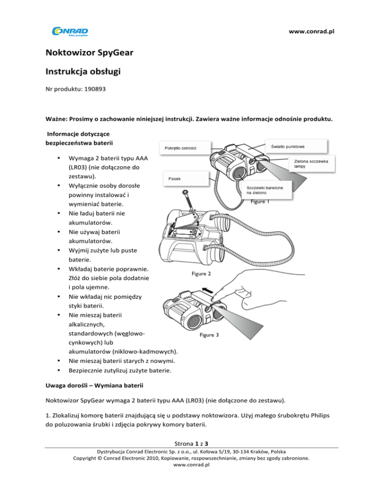 www.conrad.pl Noktowizor SpyGear Instrukcja obsługi Nr produktu: 190893 Ważne: Prosimy o zachowanie niniejszej instrukcji. Zawiera ważne informacje odnośnie produktu. Informacje dotyczące bezpieczeństwa baterii • • • • • • • • • • Wymaga 2 baterii typu AAA (LR03) (nie dołączone do zestawu). Wyłącznie osoby dorosłe powinny instalować i wymieniać baterie. Nie ładuj baterii nie akumulatorów. Nie używaj baterii akumulatorów. Wyjmij zużyte lub puste baterie. Wkładaj baterie poprawnie. Złóż do siebie pola dodatnie i pola ujemne. Nie wkładaj nic pomiędzy styki baterii. Nie mieszaj baterii alkalicznych, standardowych (węglowo-‐ cynkowych) lub akumulatorów (niklowo-‐kadmowych). Nie mieszaj baterii starych z nowymi. Bezpiecznie zutylizuj zużyte baterie. Uwaga dorośli – Wymiana baterii Noktowizor SpyGear wymaga 2 baterii typu AAA (LR03) (nie dołączone do zestawu). 1. Zlokalizuj komorę baterii znajdującą się u podstawy noktowizora. Użyj małego śrubokrętu Philips do poluzowania śrubki i zdjęcia pokrywy komory baterii. Strona 1 z 3 Dystrybucja Conrad Electronic Sp. z o.o., ul. Kołowa 5/19, 30-‐134 Kraków, Polska Copyright © Conrad Electronic 2010, Kopiowanie, rozpowszechnianie, zmiany bez zgody zabronione. www.conrad.pl www.conrad.pl 2. Wyjmij zużyte baterie. 3. Włóż nowe baterie do komory jak pokazano na rysunku (fig.2). 4. Załóż pokrywę baterii i przykręć śrubkę. Korzystanie z Noktowizora SpyGear 1. Patrz przez okulary i obracaj pokrętłem ostrości do momentu aż obraz stanie się ostry. Korzystanie ze światła punktowego 1. Podczas patrzenia przez okular, przesuń przełącznik znajdujący się po prawej stronie w kierunku środka. 2. Wyskoczy lampa i światło zostanie włączone. 3. Aby wyłączyć światło, delikatnie naciśnij na lampę w dół, aż zatrzaśnie się na swoim miejscu. Korzystanie z lampy 1. Upewnij się, że światło punktowe jest zatrzaśnięte na swoim miejscu. 2. Przesuń przełącznik znajdujący się po lewej stronie w kierunku środka (fig.4). 3. Aby wyłączyć światło, przesuń przełącznik z powrotem na swoje miejsce. Uwaga dorośli – Wymiana żarówki Noktowizor SpyGear wymaga 1 żarówki x 2.5V 300mA z dwoma bolcami (dołączona do zestawu). Żarówki wymienne powinny być dostępne w większości sklepów elektronicznych lub sklepów z narzędziami. Jedynie osoby dorosłe powinny instalować i wymieniać żarówkę. 1. Podczas patrzenia przez okular, przesuń przełącznik znajdujący się po prawej stronie w kierunku środka. 2. Użyj małego śrubokrętu Philips do poluzowania śrubki i zdjęcia pokrywy żarówki (fig. 5). 3. Zdejmij pokrywę żarówki (fig. 6). Strona 2 z 3 Dystrybucja Conrad Electronic Sp. z o.o., ul. Kołowa 5/19, 30-‐134 Kraków, Polska Copyright © Conrad Electronic 2010, Kopiowanie, rozpowszechnianie, zmiany bez zgody zabronione. www.conrad.pl www.conrad.pl 4. Zdejmij starą żarówkę (do wyciągnięcia mogą być potrzebne szczypce lub mały śrubokręt). 5. Upewnij się, że bolce nowej żarówki są proste i włóż je do otworów. 6. Załóż ponownie pokrywę żarówki i przykręć śrubkę. UWAGA: Spoglądanie na Słońce może uszkodzić wzrok. Nie oglądaj Słońca za pomocą tego produktu lub gołym okiem. Zawiera ostre zakończenia na żarówce – jedynie osoby dorosłe mogą dokonywać wymiany. OSTRZEŻENIE: Ryzyko zadławienia: małe części – nie dla dzieci poniżej 3 roku życia. Strona 3 z 3 Dystrybucja Conrad Electronic Sp. z o.o., ul. Kołowa 5/19, 30-‐134 Kraków, Polska Copyright © Conrad Electronic 2010, Kopiowanie, rozpowszechnianie, zmiany bez zgody zabronione. www.conrad.pl
