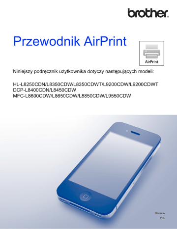 Przewodnik AirPrint Niniejszy podręcznik użytkownika dotyczy następujących modeli: HL-L8250CDN/L8350CDW/L8350CDWT/L9200CDW/L9200CDWT DCP-L8400CDN/L8450CDW MFC-L8600CDW/L8650CDW/L8850CDW/L9550CDW Wersja A POL Definicje oznaczeń W niniejszym podręczniku użytkownika stosowane jest następujące oznaczenie: INFORMACJA Informacje dostarczają wskazówek dotyczących postępowania w danej sytuacji lub związków określonych czynności z innymi funkcjami. Znaki handlowe Brother to znak handlowy firmy Brother Industries, Ltd. Apple, Macintosh, iPad, iPhone, iPod, iPod touch, OS X i Safari to znaki handlowe firmy Apple Inc., zarejestrowane w Stanach Zjednoczonych i innych krajach. AirPrint i logo AirPrint to znaki handlowe firmy Apple Inc. Wi-Fi Direct to znak handlowy stowarzyszenia Wi-Fi Alliance. Każda firma, której nazwa oprogramowania jest wymieniona w tym podręczniku, posiada umowę licencyjną oprogramowania dotyczącą programów będących jej własnością. Wszystkie nazwy handlowe oraz nazwy produktów spółek występujące na produktach Brother, powiązane dokumenty oraz wszelkie inne materiały są znakami towarowymi lub zastrzeżonymi znakami towarowymi odpowiednich spółek. WAŻNA UWAGA Jeśli nie zaznaczono inaczej, zawarte w niniejszym podręczniku komunikaty ekranowe dotyczące systemów OS X pochodzą z systemu OS X 10.8.x. Komunikaty ekranowe wyświetlane na monitorze posiadanego komputera mogą się różnić w zależności od używanego systemu operacyjnego. © 2014 Brother Industries, Ltd. Wszelkie prawa zastrzeżone. i Spis Treści 1 Wprowadzenie 1 Informacje ogólne ......................................................................................................................................1 Wymagania sprzętowe ..............................................................................................................................2 Obsługiwane systemy operacyjne .......................................................................................................2 Ustawienia sieciowe ............................................................................................................................2 2 Drukowanie 5 Drukowanie z urządzeń iPad, iPhone i iPod touch ....................................................................................5 Drukowanie z systemu OS X Lion w wersji 10.7 lub nowszej....................................................................6 3 Wysyłanie faksów (dotyczy modeli MFC) 7 Wysyłanie faksów przy użyciu systemu OS X w wersji 10.8 lub nowszej..................................................7 A Rozwiązywanie problemów 8 W przypadku problemów z urządzeniem...................................................................................................8 Wyłączanie/włączanie funkcji AirPrint za pomocą funkcji Zarządzanie przez Internet (przeglądarki internetowej) ...........................................................................................................................................9 ii 1 Wprowadzenie 1 1 Informacje ogólne 1 Funkcja AirPrint umożliwia bezprzewodowe drukowanie zdjęć, wiadomości e-mail, stron www oraz dokumentów z urządzeń iPad, iPhone i iPod touch bez konieczności instalowania sterownika. Żądanie drukowania Drukowanie Technologia AirPrint pozwala również na wysyłanie faksów bezpośrednio z komputera Macintosh bez ich drukowania (funkcja dostępna dla systemu OS X w wersji 10.8 i nowszych). 1 2 3 4 1 Sieć przewodowa lub bezprzewodowa 2 Linia telefoniczna 3 Urządzenie Brother 4 Urządzenie odbiorcy 1 Wprowadzenie Wymagania sprzętowe 1 1 Obsługiwane systemy operacyjne 1 Funkcja AirPrint jest obsługiwana przez urządzenia iPad (wszystkie modele), iPhone (3GS lub nowsze) oraz iPod touch (3. generacja lub nowsze) z najnowszą wersją systemu iOS. Więcej informacji można znaleźć na stronie internetowej firmy Apple: http://support.apple.com/kb/HT4356. Ustawienia sieciowe 1 Aby można było korzystać z funkcji AirPrint, urządzenie mobilne musi być podłączone do sieci bezprzewodowej, do której zostało także podłączone urządzenie Brother. Funkcja AirPrint obsługuje połączenia bezprzewodowe wykorzystujące tryb ad-hoc, tryb infrastruktury lub technologię Wi-Fi Direct™ (tylko obsługiwane modele). W celu skonfigurowania urządzenia mobilnego do pracy w sieci bezprzewodowej należy zapoznać się z jego instrukcją obsługi. Łącze do instrukcji obsługi urządzenia mobilnego na stronie internetowej firmy Apple można uzyskać, klikając ikonę w przeglądarce Safari. Informacje na temat konfiguracji urządzenia Brother do pracy w sieci bezprzewodowej zawiera jego Podręcznik szybkiej obsługi lub Podręczniki oprogramowania i obsługi dla sieci. Tryb Ad-hoc 1 Pozwala połączyć urządzenie mobilne z urządzeniem Brother bez potrzeby korzystania z bezprzewodowego punktu dostępowego lub routera. 1 2 1 Urządzenie mobilne 2 Sieciowe urządzenie bezprzewodowe (urządzenie Brother) 2 Wprowadzenie Tryb infrastruktury 1 Pozwala połączyć urządzenie mobilne z drukarką Brother za pośrednictwem bezprzewodowego punktu dostępowego lub routera. 1 Gdy urządzenie Brother jest połączone z bezprzewodowym punktem dostępowym lub routerem z wykorzystaniem funkcji bezprzewodowej urządzenia: 1 2 3 1 Urządzenie mobilne 2 Bezprzewodowy punkt dostępowy lub router 3 Sieciowe urządzenie bezprzewodowe (urządzenie Brother) Gdy urządzenie Brother jest połączone z bezprzewodowym punktem dostępowym lub routerem z wykorzystaniem przewodu sieciowego: 1 2 4 3 1 Urządzenie mobilne 2 Bezprzewodowy punkt dostępowy lub router 3 Przewód sieciowy 4 Sieciowe urządzenie przewodowe lub bezprzewodowe (urządzenie Brother) 3 Wprowadzenie Sieć Wi-Fi Direct™ (tylko obsługiwane modele) 1 Podłącz urządzenie mobilne do urządzenia Brother za pomocą łącza Wi-Fi Direct™. Sieć Wi-Fi Direct™ umożliwia konfigurację zabezpieczonej sieci 