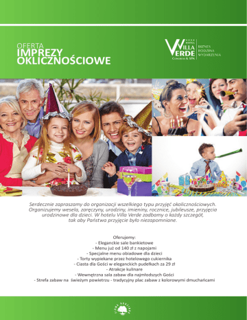 OFERTA IMPREZY OKLICZNOŚCIOWE Serdecznie zapraszamy do organizacji wszelkiego typu przyjęć okolicznościowych. Organizujemy wesela, zaręczyny, urodziny, imieniny, rocznice, jubileusze, przyjęcia urodzinowe dla dzieci. W hotelu Villa Verde zadbamy o każdy szczegół, tak aby Państwa przyjęcie było niezapomniane. Oferujemy: - Eleganckie sale bankietowe - Menu już od 140 zł z napojami - Specjalne menu obiadowe dla dzieci - Torty wypiekane przez hotelowego cukiernika - Ciasta dla Gości w eleganckich pudełkach za 29 zł - Atrakcje kulinare - Wewnętrzna sala zabaw dla najmłodszych Gości - Strefa zabaw na świeżym powietrzu - tradycyjny plac zabaw z kolorowymi dmuchańcami PROPOZYCJA 1 /140 PLN /osoba ZUPA Zupa bulion drobiowo-wołowy z cielęcymi pulpecikami i julienne warzywnym PATERY MIĘS Tradycyjna rolada śląska Fileciki z kurczaka nadziewane serem gorgonzola Pieczeń ze schabu nadziewana grzybami leśnymi DODATKI Kluski śląskie Młode ziemniaki glazurowane masłem i koperkiem Ryż z warzywami Surówka z marchwii z jabłkiem i pomarańczą Kapusta czerwona duszona Grillowane warzywa Sos grzybowy DESER Puszyste tiramisu na sosie cappuccino z gałką lodów waniliowych BUFET SŁODKI Wybór ciastek koktailowych i ciast naszego wypieku ZIMNA PŁYTA Półmisek wędlin Pasztet z dziczyzny z sosem cumberland Tymbaliki z kurczaka Jajka faszerowane Sałatka jarzynowa Mieszanka sałat z sosem vinegrette Wybór pieczywa i masełek smakowych GORĄCA KOLACJA Zupa żurek śląski z białą kiełbasą i ziemniakami NAPOJE ZIMNE - 1 L/OS. Soki owocowe 100% i napoje gazowane Woda - bez ograniczeń PROPOZYCJA 2 /155 PLN /osoba ZUPA Bulion drobiowo-wołowy z kluseczkami drobiowymi DANIA GŁÓWNE NA PATERACH Pieczeń z szynki z miodem i goździkami Kotlet de vollay z masłem i pietruszką Dorsz pieczony z sosem veloute DODATKI Kluski śląskie Młode ziemniaki glazurowane masłem i koperkiem Ryż z warzywami Surówka z marchwii z jabłkiem i pomarańczą Sałatka z ogórka i czerwonej cebuli Buraczki zasmażane ze śmietaną DESER Mini torcik z truskawkami i pianką miętową BUFET SŁODKI Patery owoców sezonowych Wybór ciastek koktailowych i ciast naszego wypieku ZIMNA PŁYTA Półmisek mięs pieczonych Pasztet z dziczyzny z sosem cumberland Rolada z kurczaka nadziewana pistacjami Rożki z pieczonego schabu z musem chrzanowym Jajka w sosie tatarskim Deska serów francuskich Tymbaliki z kurczaka Sałatka szopska Śledzie z cebulką zaprawiane w gliniaku Wybór pieczywa i masełek smakowych GORĄCA KOLACJA Delikatna potrawka z cielęciny z kurkami w śmietanie NAPOJE ZIMNE - 1 L/OS. Soki owocowe 100% i napoje gazowane Woda - bez ograniczeń ul. Mrzygłodzka 273, 42-400 Zawiercie | tel. (+48 32) 670 38 00 | [email protected] www.villaverde.pl | www.facebook.com/Hotel.VillaVerde PROPOZYCJA 3 /165 PLN /osoba ZUPA Zupa z prawdziwków z domowymi łazankami i creme fraiche DANIA GŁÓWNE NA PATERACH Rolada wołowa śląska Rolada schabowa z brokułami i mozzarellą Grillowany łosoś z młoda porą i kaparami DODATKI Kluski śląskie Młode ziemniaki glazurowane masłem i koperkiem Ryż z warzywami Warzywa na parze z masłem ziołowym Surówka z marchwii z jabłkiem i pomarańczą Surówka z selera DESER Mini torcik z truskawkami i pianką miętową BUFET SŁODKI Patery owoców sezonowych Wybór ciastek koktailowych i ciast naszego wypieku ZIMNA PŁYTA Półmisek mięs pieczonych Pasztet z dziczyzny z sosem cumberland Rolada z kurczaka nadziewana pistacjami Rożki z pieczonego schabu z musem chrzanowym Jajka w sosie tatarskim Deska serów francuskich Tymbaliki z kurczaka Sałatka szopska Śledzie z cebulką zaprawiane w gliniaku Wybór pieczywa i masełek smakowych GORĄCA KOLACJA Wołowina po burgundzku z warzywami NAPOJE ZIMNE - 1 L/OS. Soki owocowe 100% i napoje gazowane Woda - bez ograniczeń DLA DZIECI /40 PLN /osoba ZESTAW I Tradycyjny rosół z kury z makaronem Pulpety wołowe w sosie pomidorowym Ziemniaki puree Surówka z marchewki Melba - puchar lodów z owocami i polewą czekoladową ZESTAW II Zupa krem z pomidorów z groszkiem ptysiowym Tortilla z grillowanym kurczakiem Frytki Sałatka colesław Melba - puchar lodów z owocami i polewą czekoladową TORTY /65 PLN /1 KG/10 osób Serdecznie polecamy delikatne torty wypiekane z naturalnych składników przez hotelowego Cukiernika. Polecamy w szczególności: Tort malinowy z waniliowym creme brűlle mus malinowy, świeże maliny, waniliowy creme brűlle, polewa z białej czekolady, jasny biszkopt waniliowy Tort Tiramisu mus z serka Mascarpone, likier kawowy z likierem Kahlua, biszkopt kakaowy Tort z białej czekolady z malinami mus z białej czekolady, świeże maliny, biała polewa czekoladowa, jasny biszkopt waniliowy Tort serowy z owocami leśnymi mus serowy, owoce leśne, jasny biszkopt waniliowy Tort karmelowo-kawowy mus karmelowy, karmelizowane gruszki, likier Amaretto, biszkopt Sacher nasączony kawą ul. Mrzygłodzka 273, 42-400 Zawiercie | tel. (+48 32) 670 38 00 | [email protected] www.villaverde.pl | www.facebook.com/Hotel.VillaVerde CIASTA DLA GOŚCI /29 PLN /1 SZT /6 PORCJI Wybór ciast dla Gości przygotowane w logowanych pudełkach. 6 porcji w paczce. - SERNIK WIEDEŃSKI, - KARMELOWE, - ADWOKAT, - TIRAMISU, - AMBASADOR, - SZARLOTKA, - PIJAK, - MAKOWIEC, - TRUSKAWKOWE Z GALARETKĄ, - MIODOWNIK CENNIK NAPOJÓW NAPOJE ZIMNE /12 PLN /1 LITR Soki owocowe w dzbankach napoje gazowane firmy Pepsi (PET) Napoje zimne gazowane 0,2 l – a la carte wg zużycia NAPOJE GORĄCE BUFET KAWOWY, HERBATY /220 ZŁ/DO 20 OSÓB /320 ZŁ/DO 40 OSÓB Świeżo parzona kawa serwowana w termosie oraz wybór prestiżowych herbat smakowych Sir Williams Dodatki: mleko, cytryna, cukier. CZAS SERWOWANIA BEZ OGRANICZEŃ KAWA Z EKSPRESU /A la carte od 8 do 12 zł – serwowana wg zużycia ATRAKCJE KULINARNE FONTANNA CZEKOLADOWA /300 PLN / do 20 OSÓB /500 PLN / do 40 OSÓB Fontanna czekoladowa sprawi, że Twoje przyjęcie będzie niezapomniane! Fontanna pe
